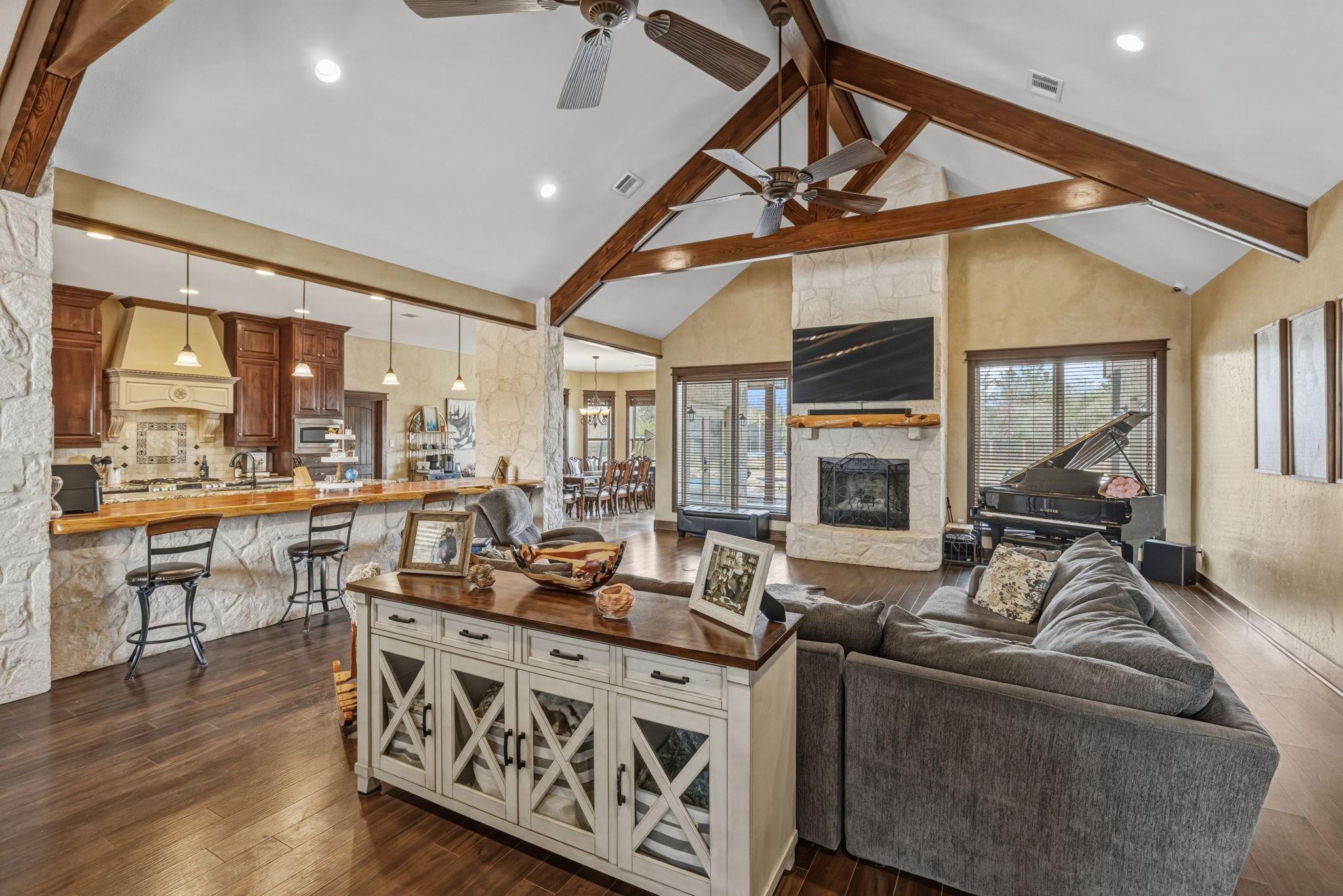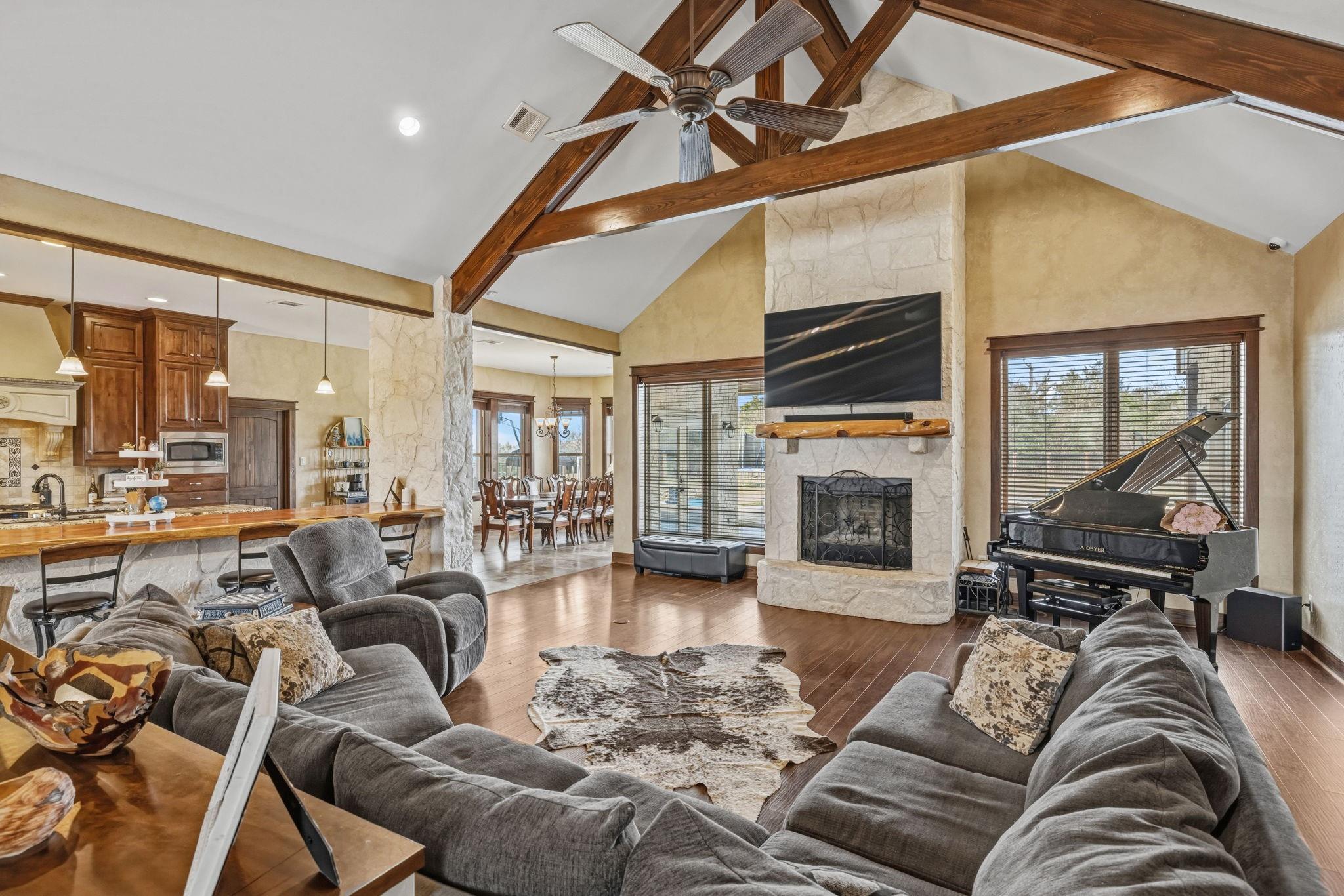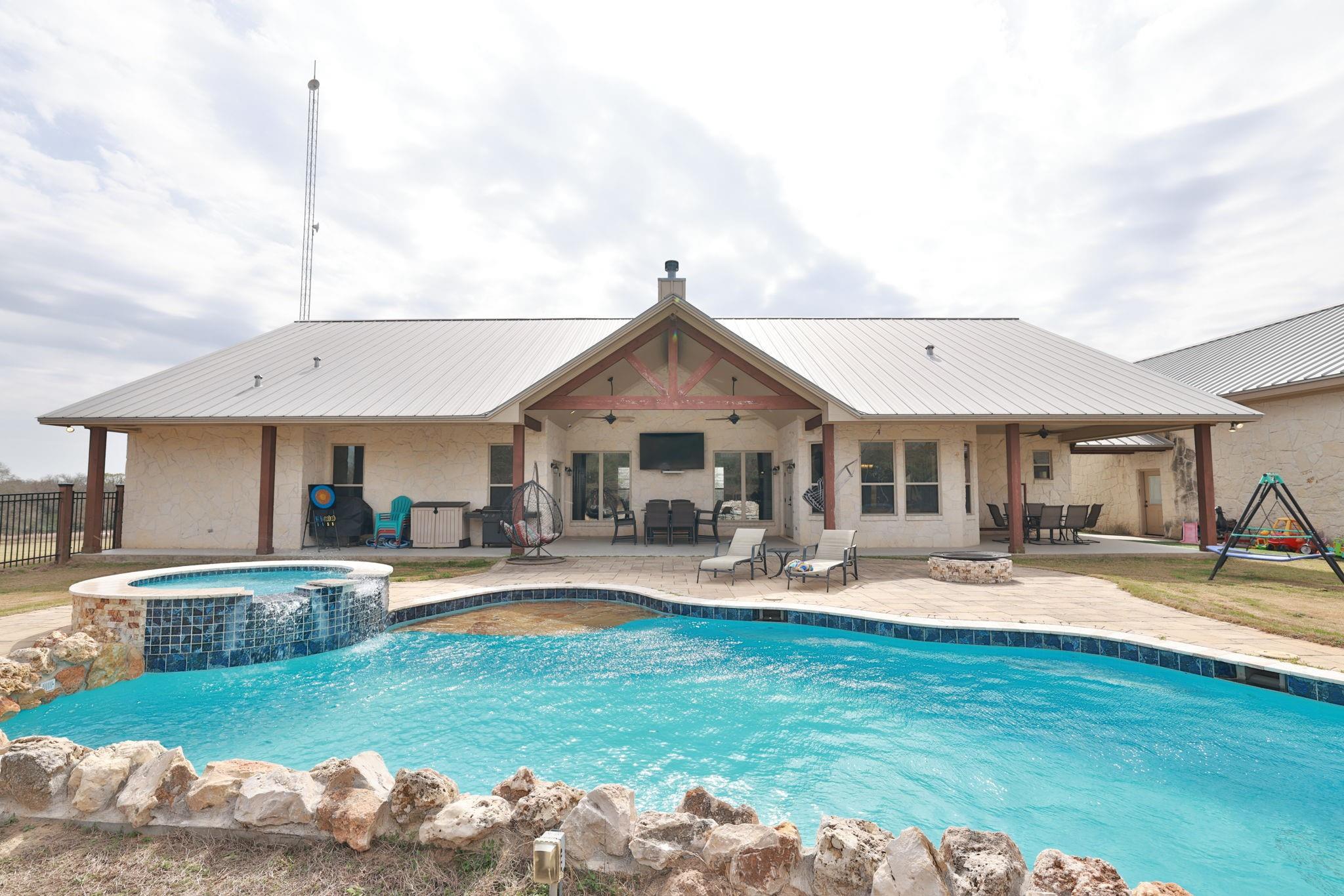 Franklin, TX– 4 Bed | 4 Bath Home on 15± Acres Situated just outside of Franklin and approximately 40 minutes from Bryan-College Station. This exceptional 15± acre estate offers privacy, quality craftsmanship, and refined country living. A custom stone entrance with electric gate welcomes you to the beautifully maintained ranch-style stone home. The residence features 4 bedrooms and 4 full baths, complemented by wood laminate and tile flooring, vaulted ceilings, custom cabinetry with built-ins, and a striking stone fireplace that anchors the spacious living area. The thoughtful floor plan provides both comfort and functionality for family living or entertaining guests. A three-bay garage includes a car lift, extended awning, and an upstairs game room, offering versatile space for hobbies. Outdoor amenities include a pool, hot tub, barn and even a baseball field. An abundance of wildlife enhance the peaceful setting overlooking a neat lake, creating upscale living and country ch