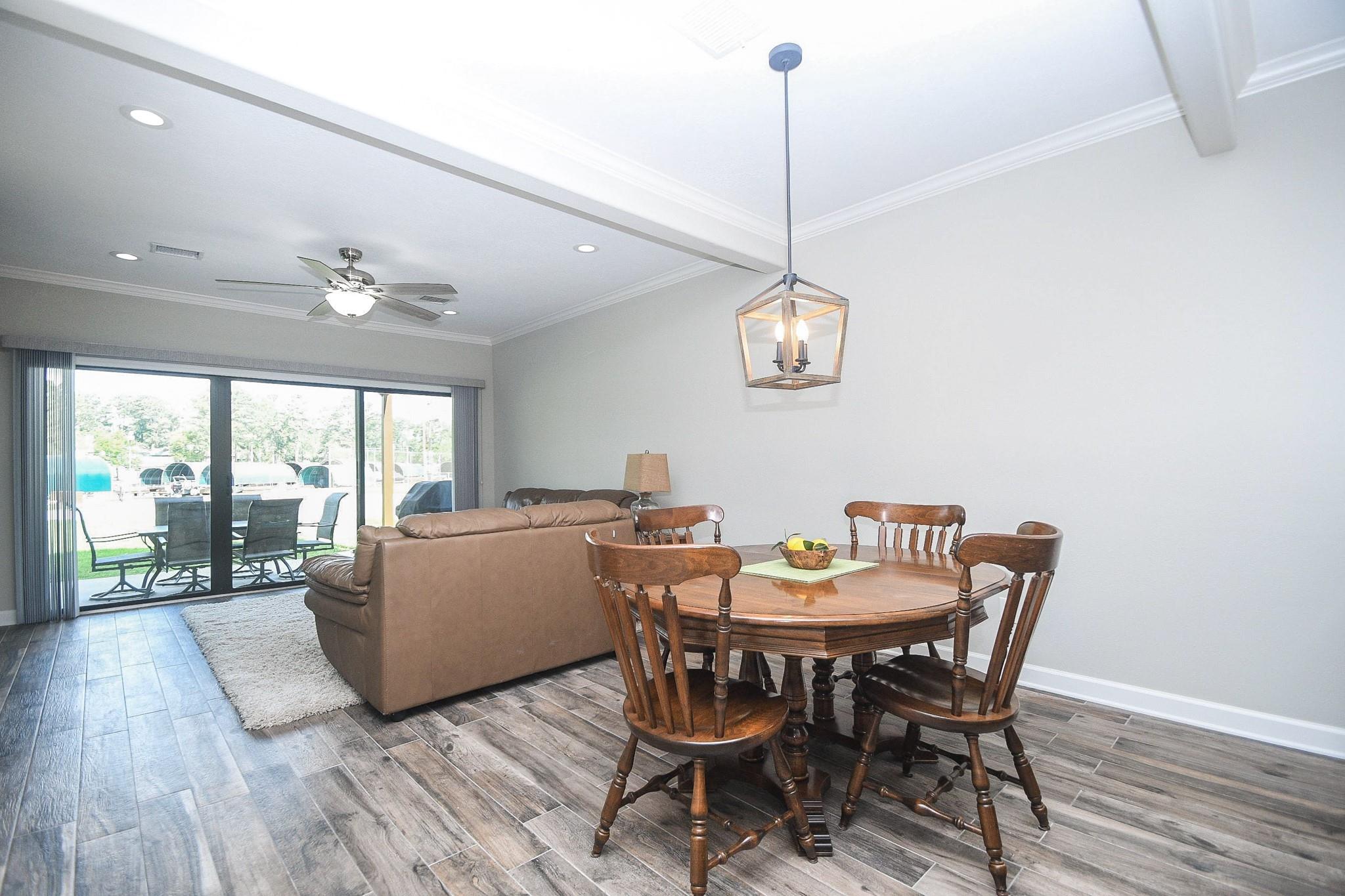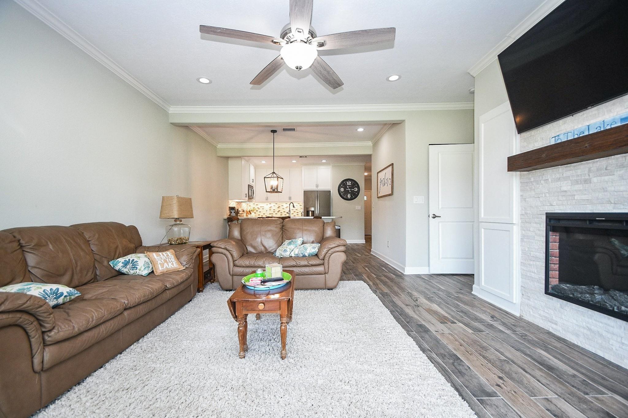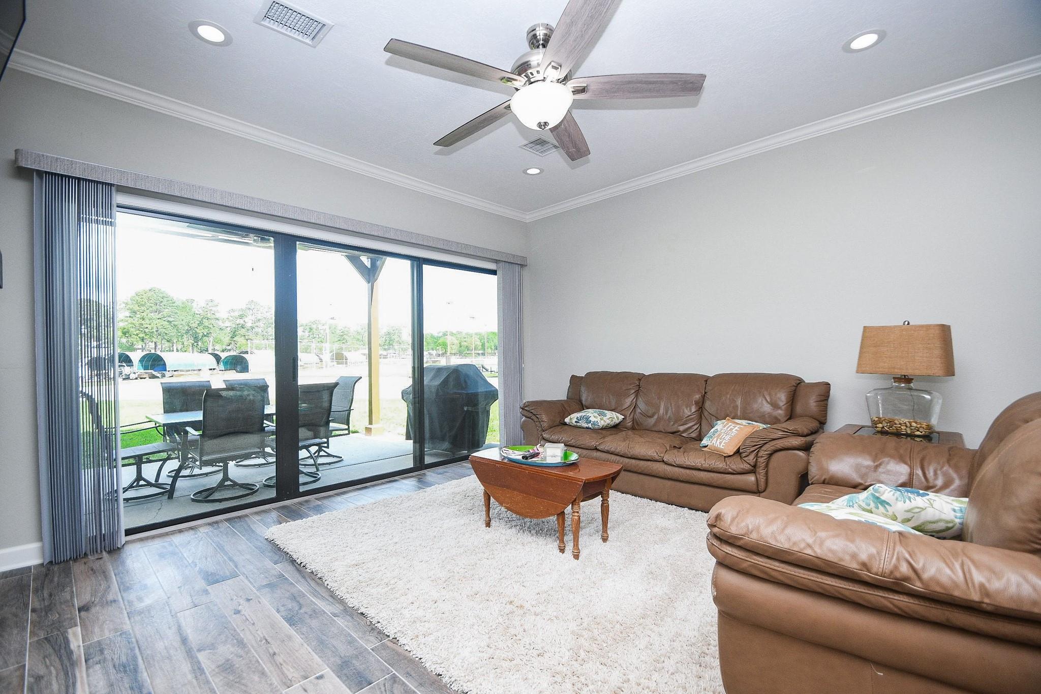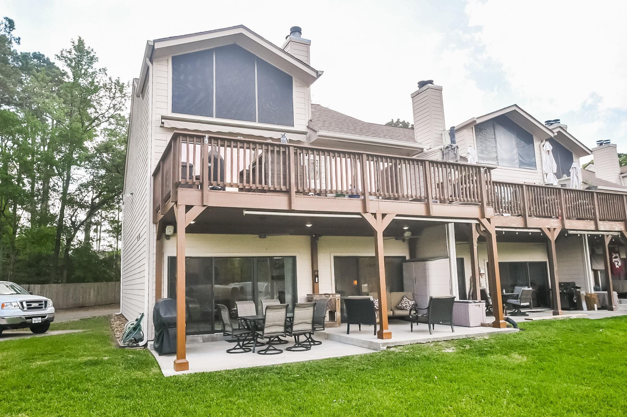 Don't miss out on this WATERFRONT retreat in a gated community at 500 River Rd. This 3 bedroom/ 2 bathroom condominium is a rarely available first floor end unit with a large covered patio leading to expansive greenspace. It's open floor plan is perfect for a full-time residence or family friendly weekend getaway. When you walk out your sliding glass doors from the living room or primary bedroom, you'll be just steps away from tennis/pickleball courts and maintained pool, as well as the community's private dock where your two deeded boat slips are waiting for action. (One boat slip comes with a retractable cover and motorized lift, while the other boasts custom decking and a remote controlled lift for jet skis.) Recent renovations include quartz countertops, walk-in showers, tile flooring, new paint throughout and professionally updated plumbing and electrical systems. Assigned parking + space for guest. Come view this property in person and see what LAKE CONROE living is all about!