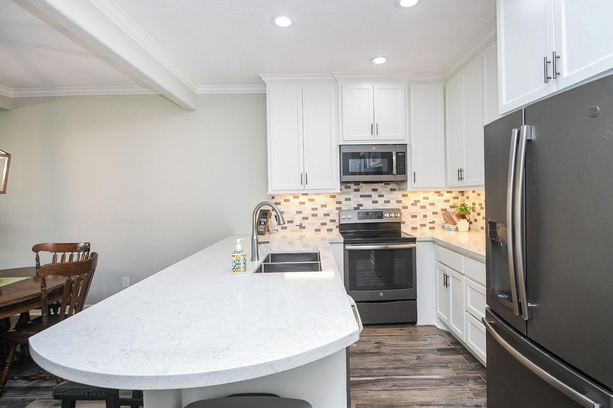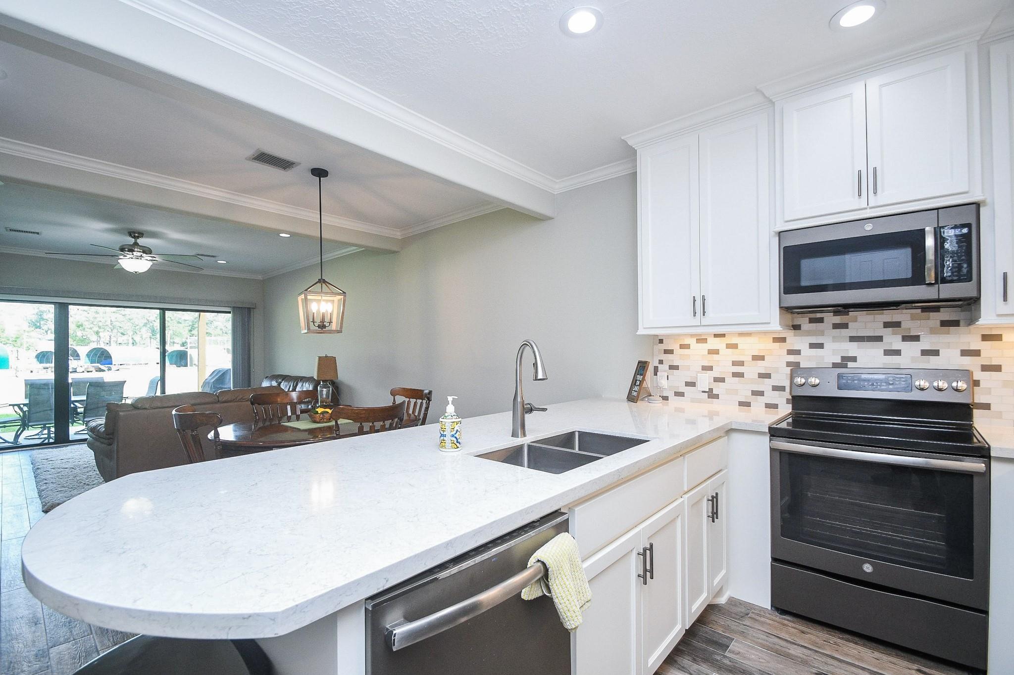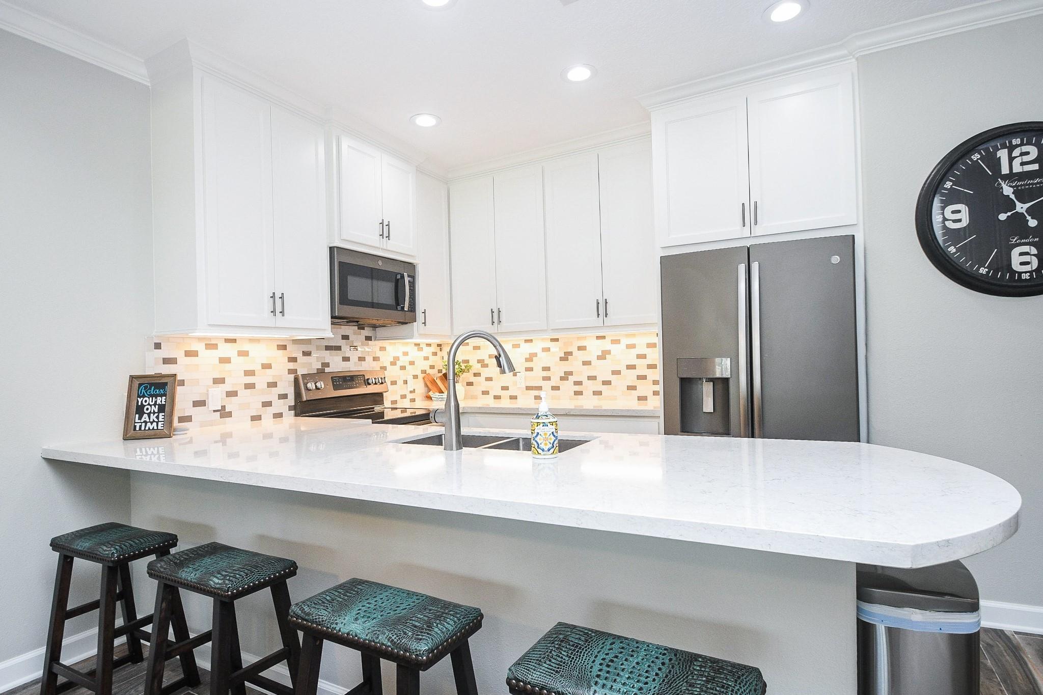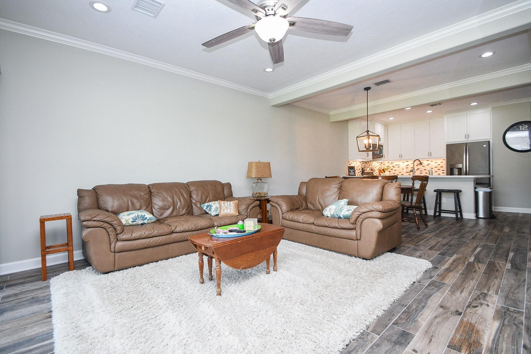 Don't miss out on this WATERFRONT retreat in a gated community at 500 River Rd. This 3 bedroom/ 2 bathroom condominium is a rarely available first floor end unit with a large covered patio leading to expansive greenspace. It's open floor plan is perfect for a full-time residence or family friendly weekend getaway. When you walk out your sliding glass doors from the living room or primary bedroom, you'll be just steps away from tennis/pickleball courts and maintained pool, as well as the community's private dock where your two deeded boat slips are waiting for action. (One boat slip comes with a retractable cover and motorized lift, while the other boasts custom decking and a remote controlled lift for jet skis.) Recent renovations include quartz countertops, walk-in showers, tile flooring, new paint throughout and professionally updated plumbing and electrical systems. Assigned parking + space for guest. Come view this property in person and see what LAKE CONROE living is all about!