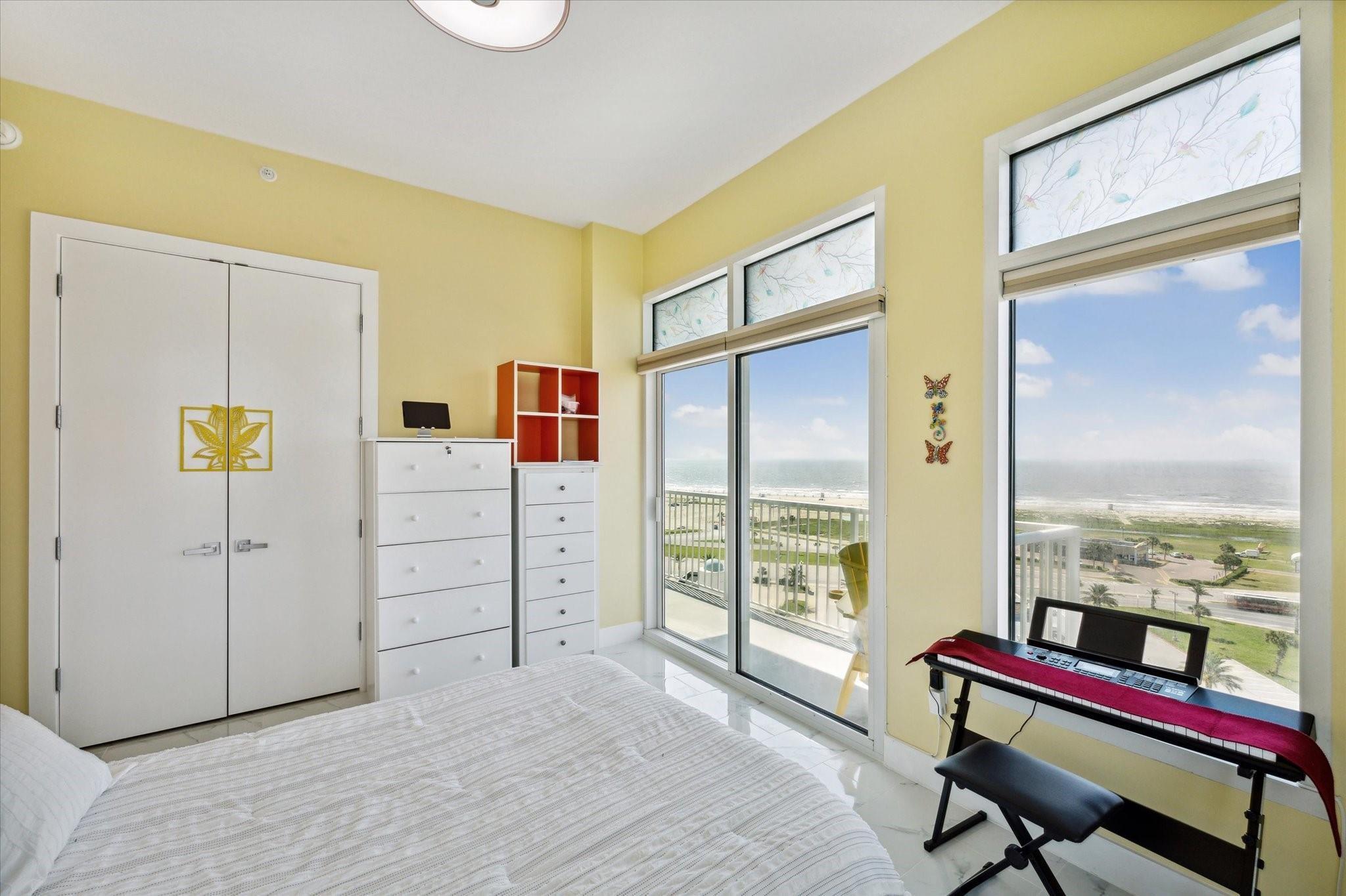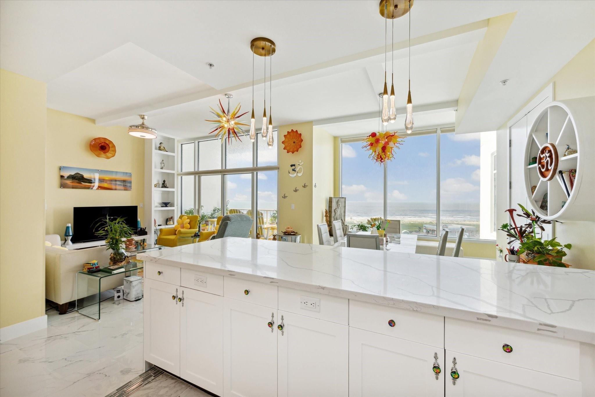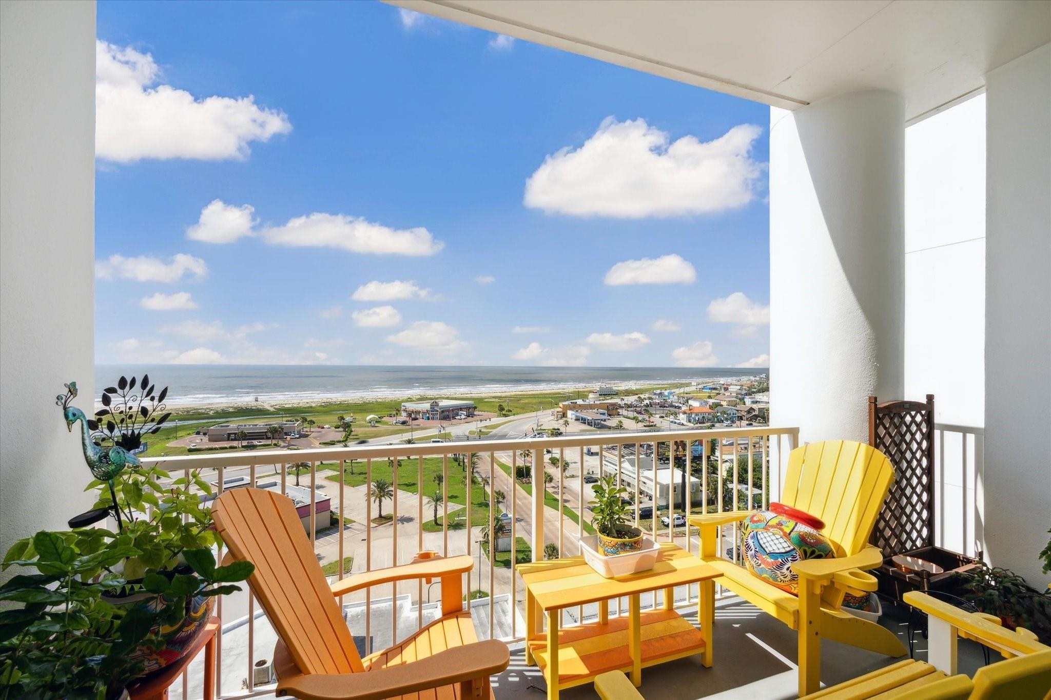 Entering the door you are met with the wonderful breathtaking views of the Gulf of Mexico. Going into the open concept living area with walls of windows and more breathtaking views of the Gulf. The Kitchen and Bathrooms are renovated with Quartz countertops and sink. Renovated floors with ceramic tiles. From another wall of windows you can see the Pleasure pier. The spacious master bedroom, with one of 2 balconies'. Imagine having coffee every morning looking at the Gulf from your balcony. This exquisite Emerald floor plan is a Large spacious floor plan facing the Gulf with unbelievable views come with a climate controlled storage unit.. The Emerald is near all of Galveston's activities including cruise ships, Pleasure Pier, beach, Strand, Post office with its restaurants & shopping. The complex itself offers a heated pool(year round), fitness center, theater, game room, yoga room & onsite management.