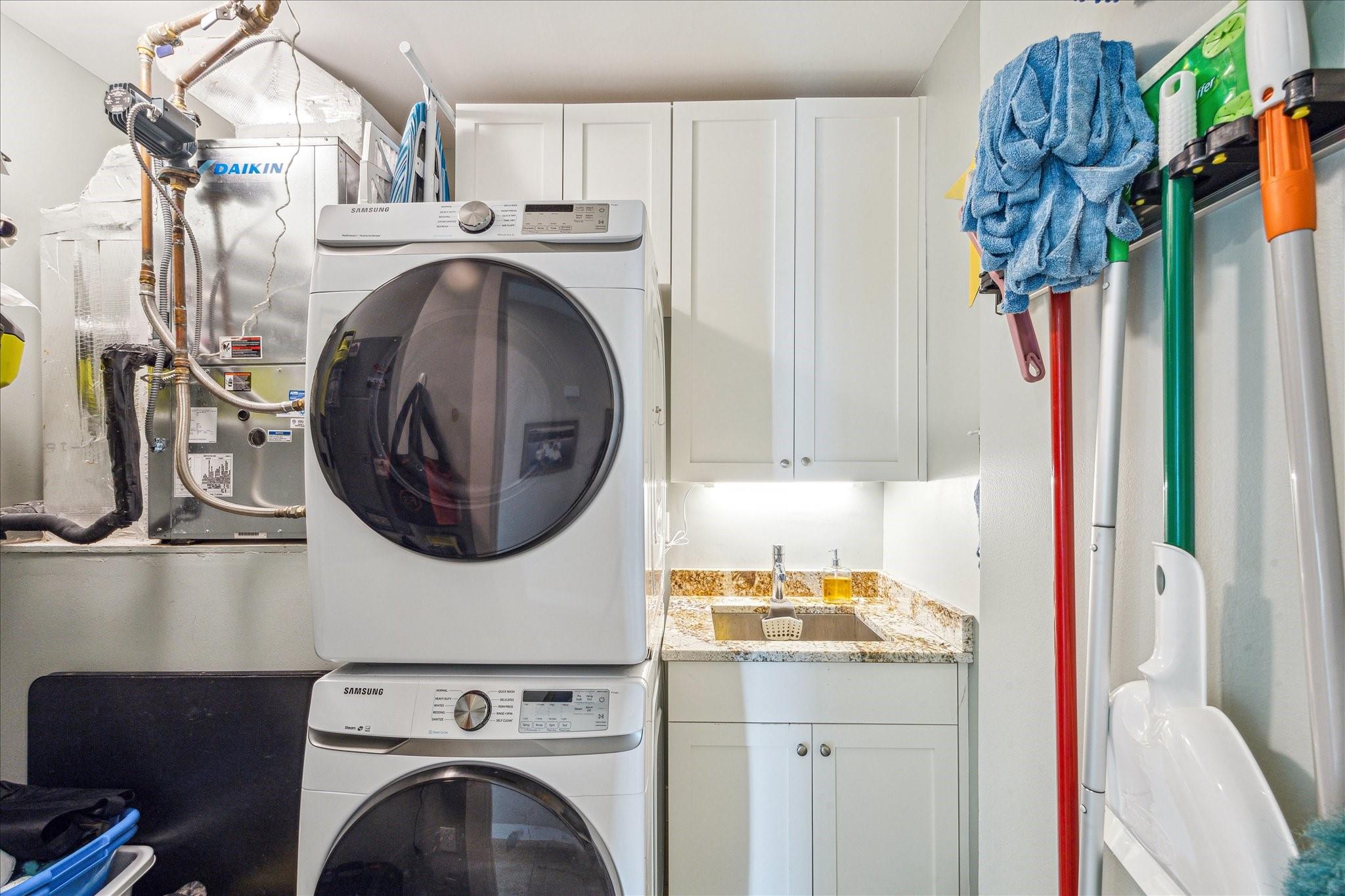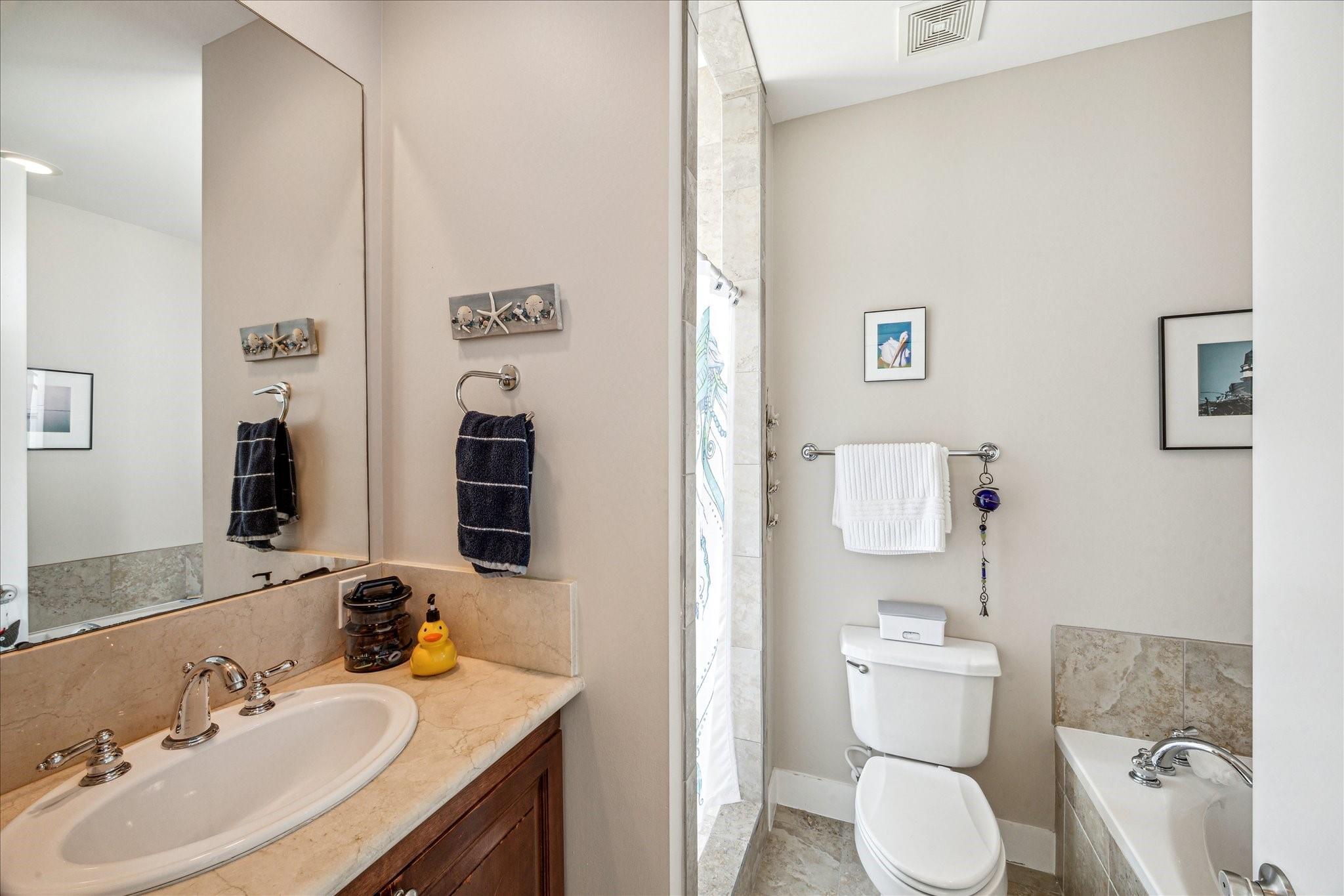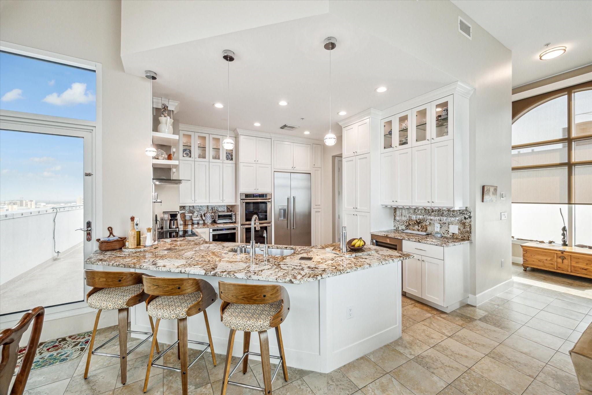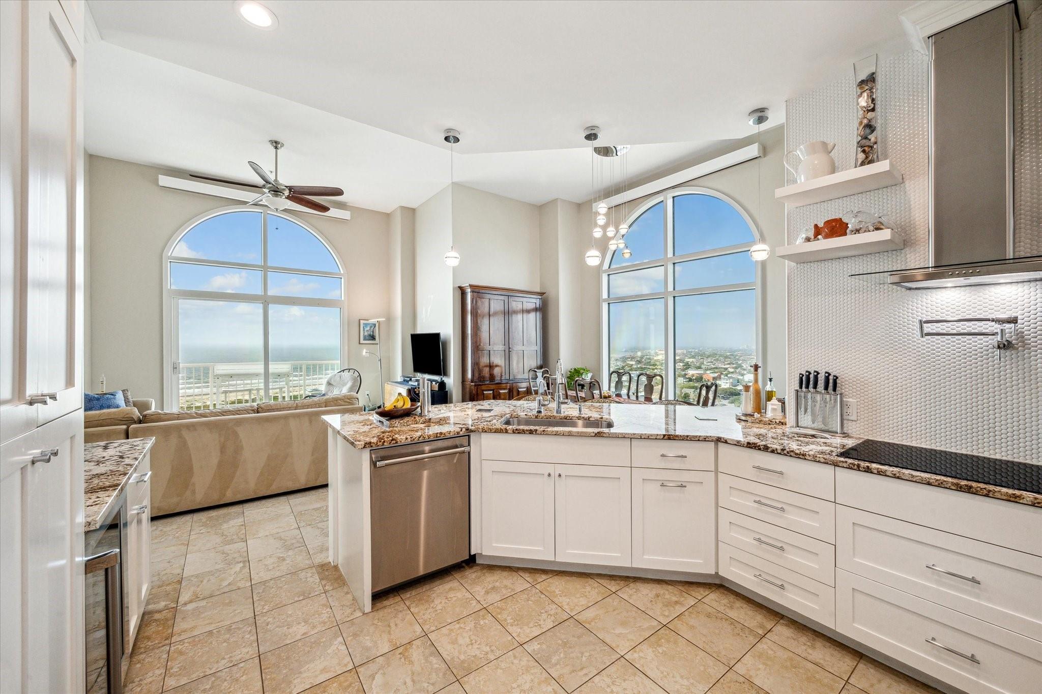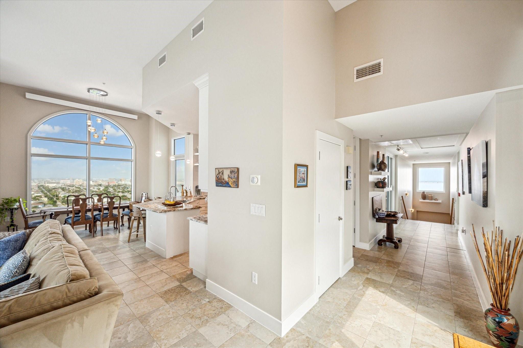 Enjoy spectacular 270-degree views of the beach, bay and seaport in this one-of-a-kind 3 BR, 3.5 bath, 2 story penthouse with large private roof deck and 2 additional balconies, all with spectacular sunsets. All ceilings are 10- 11 feet high to create a very spacious feel. All bedrooms have stunning water views, ceiling fans and en suite bathrooms. The primary bedroom has a private balcony, remodeled en suite bath with custom cabinets, granite countertops and under-cabinet lighting. There is an enormous walk-in closet with built in cabinetry and ample storage space. The open concept living room has access to the roof deck and an additional balcony facing the beach. The kitchen has all stainless steel Thermador appliances, custom built white cabinets with loads of pull outs and upgrades, granite countertops and custom lighting. This unit comes with a private 2-car garage and a climate-controlled storage unit.