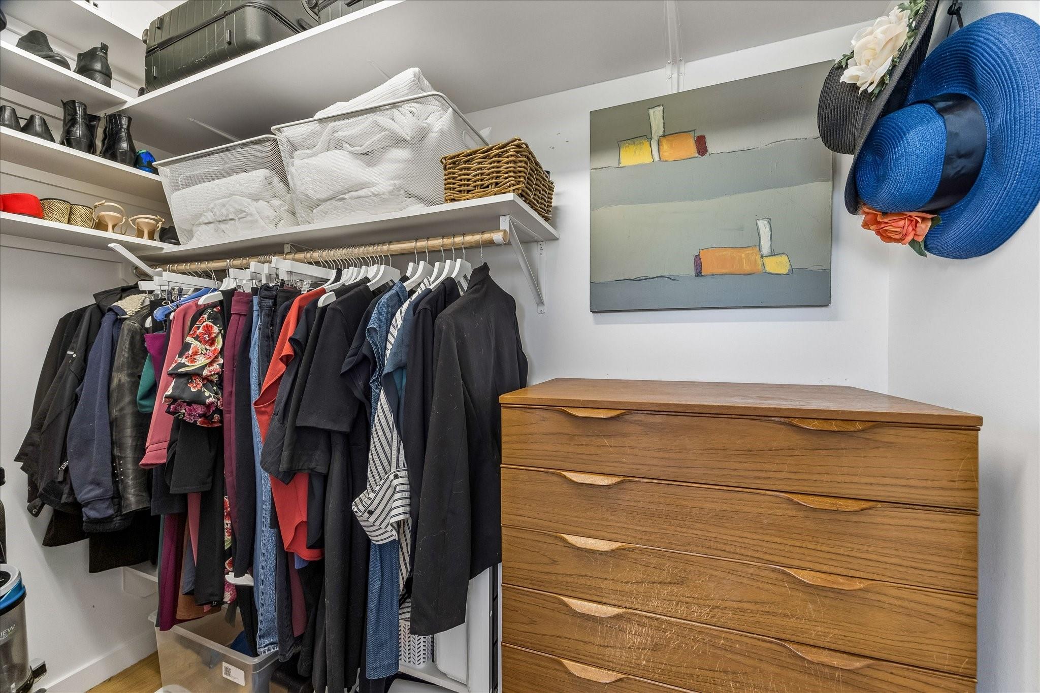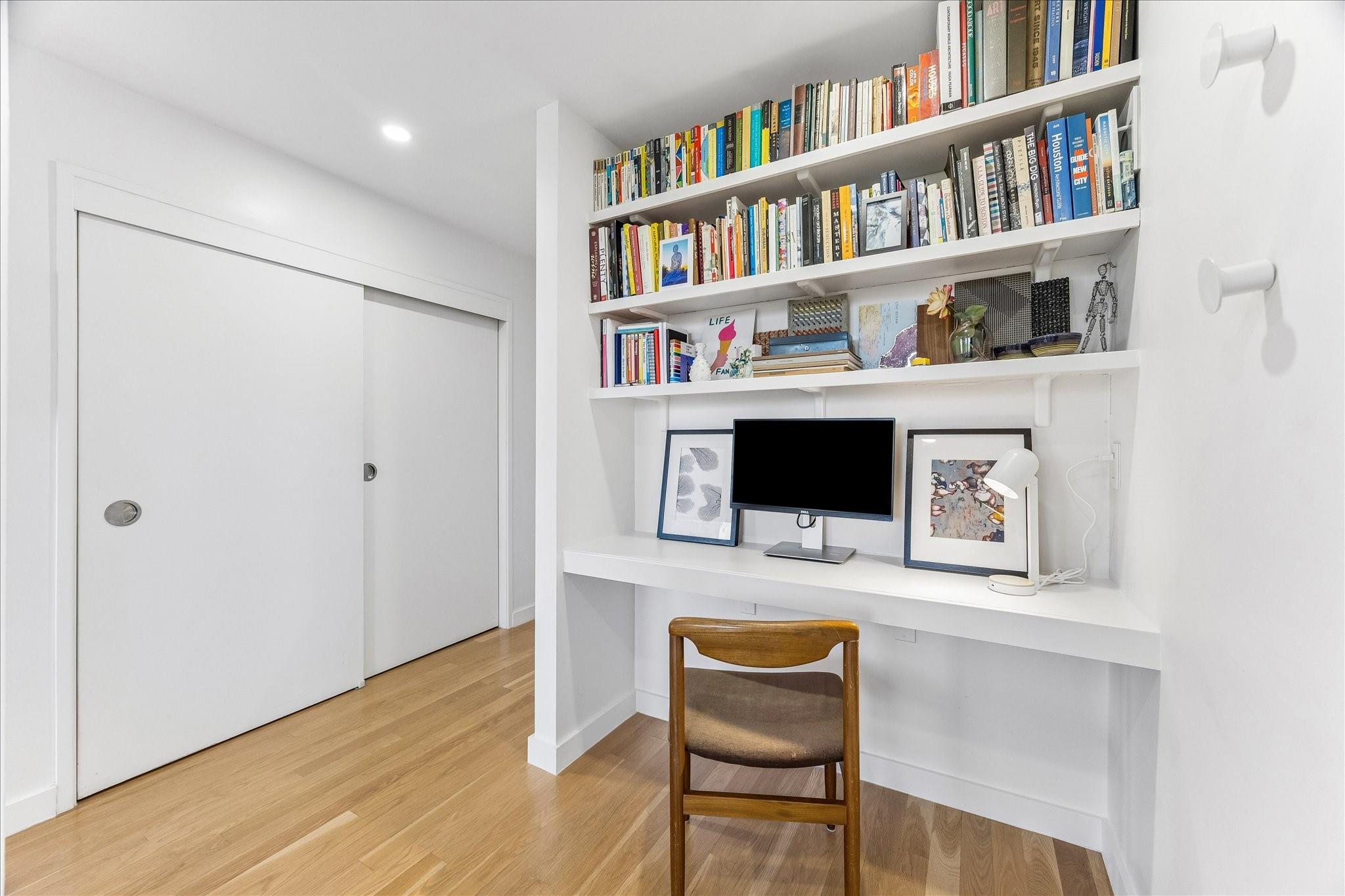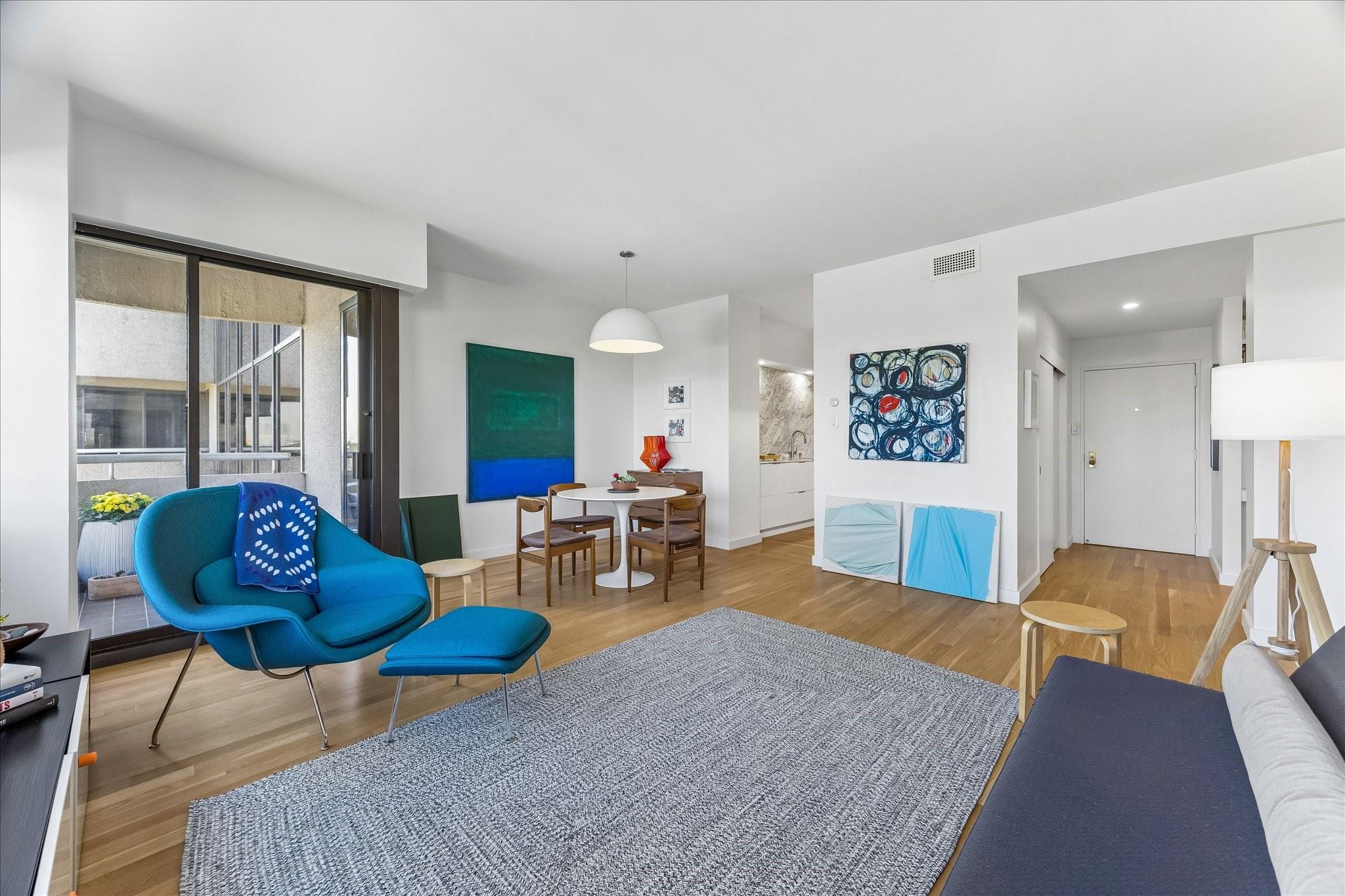 Fully renovated to the studs in 2019, this exceptional 1-bedroom, 1-bath residence at sought-after 5000 Montrose at the Museum blends modern design with refined functionality. Upgrades include new electrical and plumbing, dimmable commercial-grade lighting, and white oak hardwood floors with a low sheen finish. The kitchen and bath feature white marble surfaces, with mosaic tile flooring and a new tub in the bath. Thoughtfully designed with a built-in office workstation and gallery-style layout, the space offers a minimalist aesthetic with expansive wall space for art and a north-facing orientation. Highlights include solid core doors with cast stainless hardware, a walk-in closet, European-style storage drawers and extra deep stainless sink in the kitchen, custom air condition registers, an Italian porcelain sink in the bathroom, a stacked washer/dryer, a wifi-enabled Nest thermostat, and sweeping views from the wall to wall windows and retiled balcony.