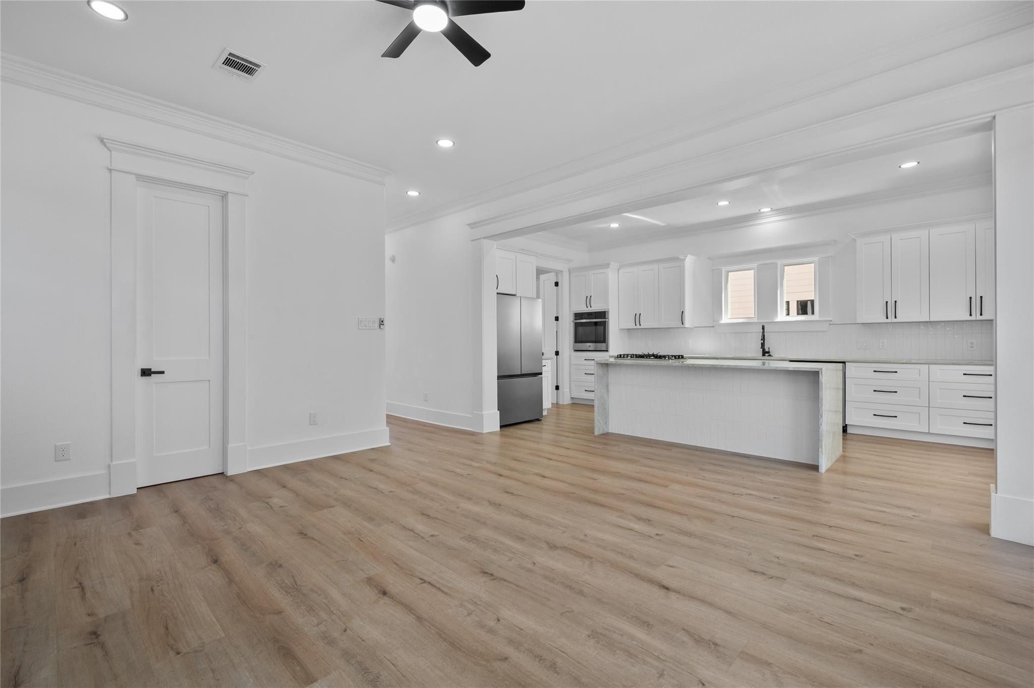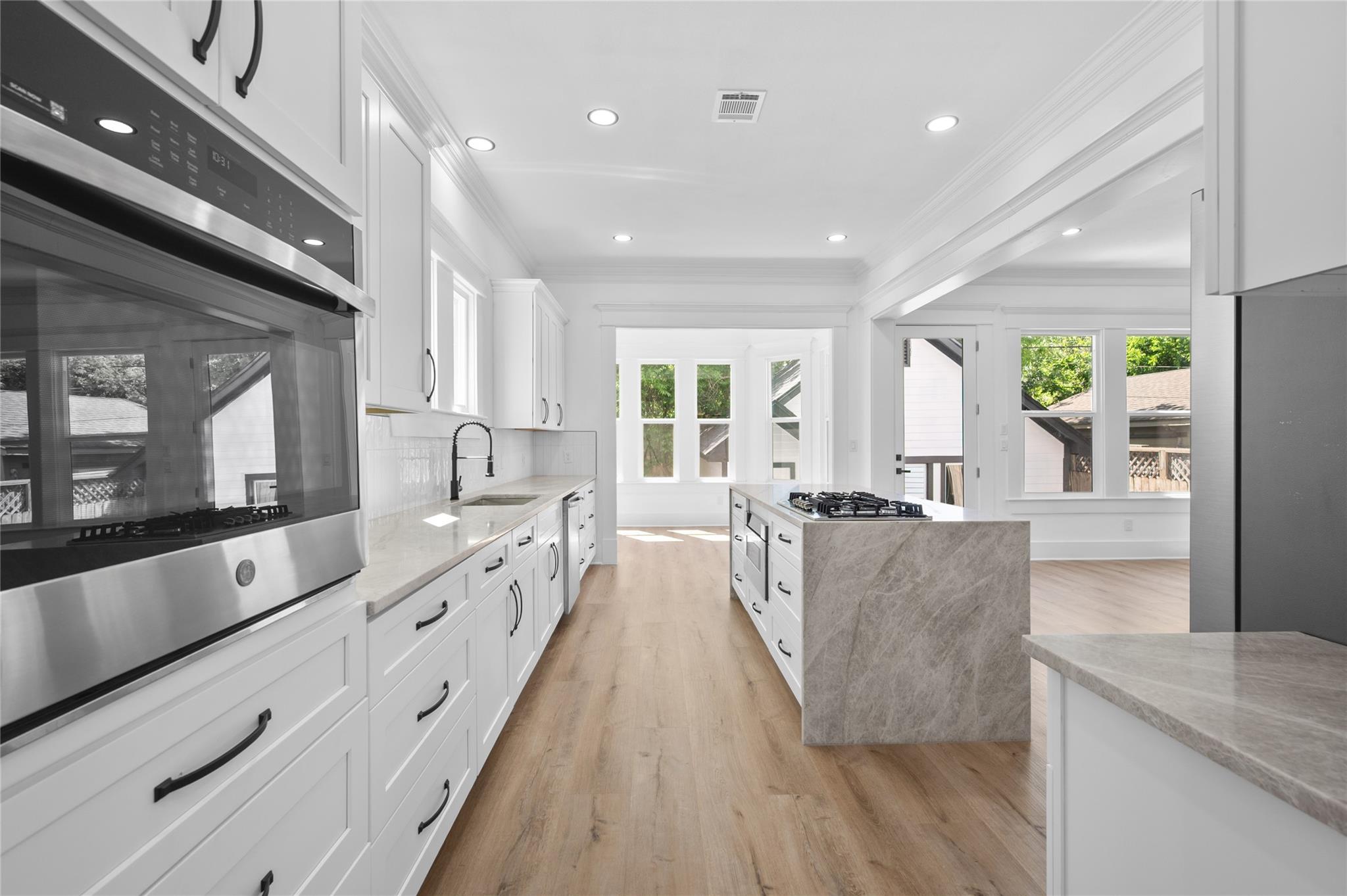 This fully renovated 4 bed, 2.5 bath home offers a modern, functional layout with elevated finishes throughout. The first floor features an open yet defined flow between living spaces. The dining area connects directly to a private patio, while a separate breakfast nook sits just off the kitchen for more casual dining. The kitchen showcases a large island with waterfall countertops & an open view into the living room that is anchored by a floor-to-ceiling fireplace, adding warmth and a strong focal point to the design. Upstairs, all bedrooms are thoughtfully placed for privacy. The primary suite includes a walk in closet with built in shelving & a fully updated en suite bath with a tub & walk-in shower. Two secondary bedrooms offer direct access to a shared balcony, adding a rare outdoor extension to the upper level. Located minutes from The Heights, Downtown, and surrounding dining and entertainment, the home offers convenient access to some of Houston’s most desirable areas.