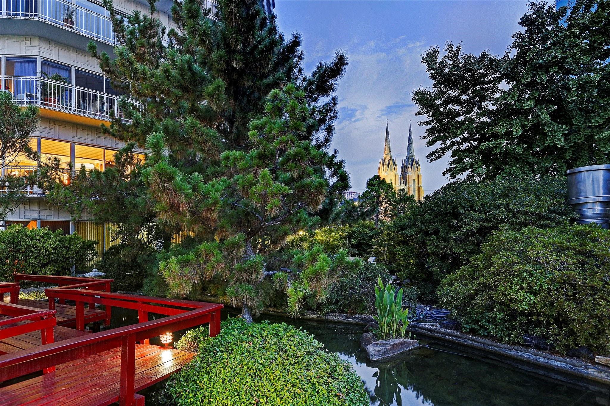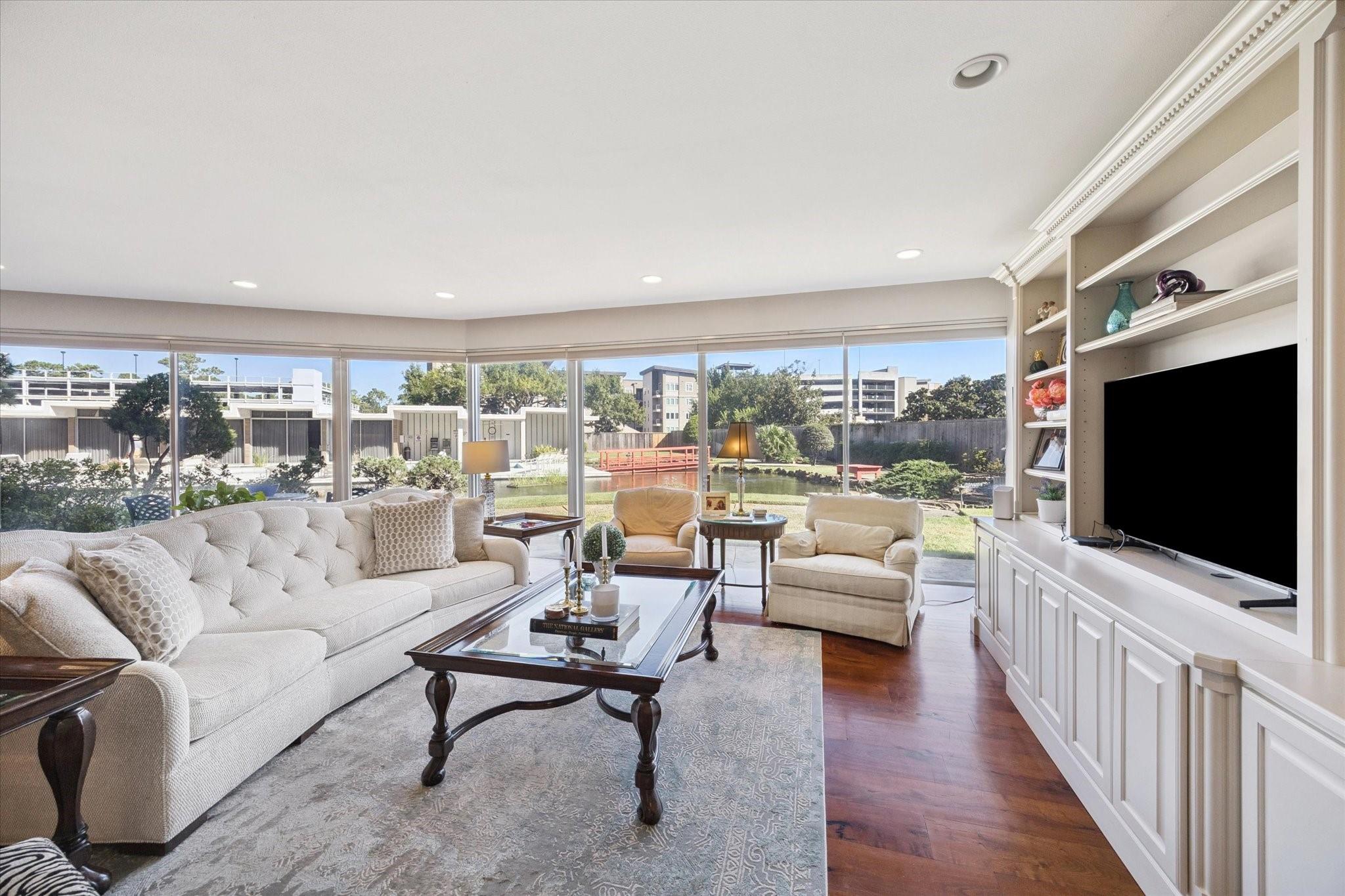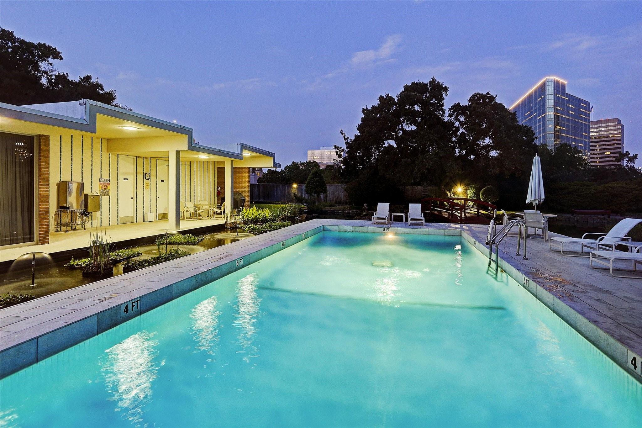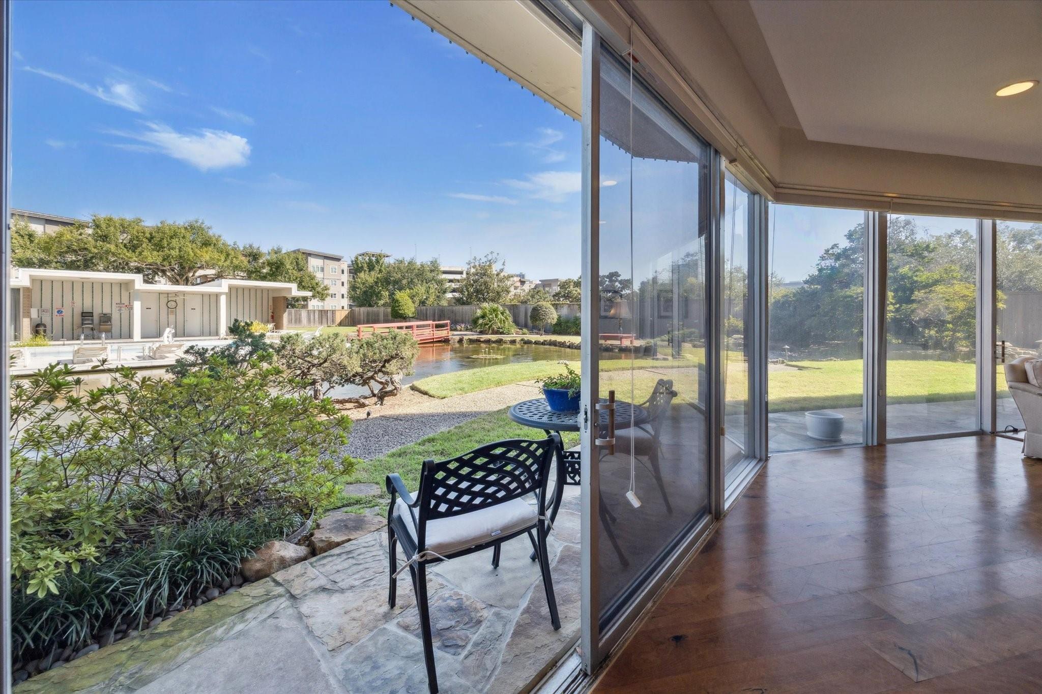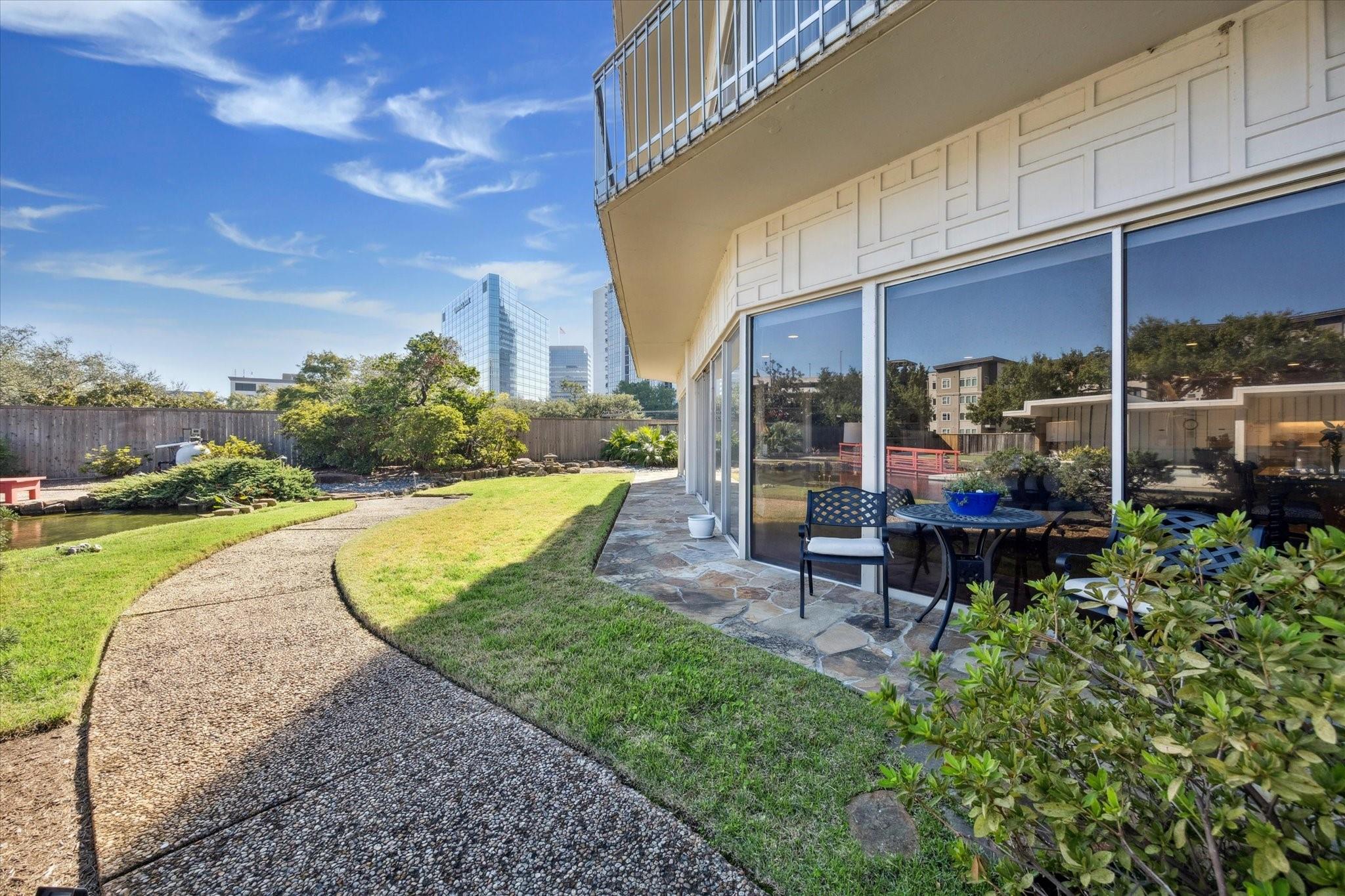 Set within the storied Executive House mid-rise, this 2,661-square-foot garden-level residence pairs timeless design with modern refinement. Overlooking the koi pond and Japanese gardens, the home features wide-plank hardwood floors, a 2023 kitchen renovation with soft-close cabinetry, granite counters and a full wet bar with beverage refrigerator and ice maker. The primary suite offers an atmosphere of quiet luxury with travertine finishes, a jetted soaking tub, separate shower and dual vanities. The secondary bedroom provides flexibility for guests or a study, complemented by generous storage throughout. A walk-in utility room with full-size stacked washer and dryer, 2 assigned parking spaces, and a controlled access complete the convenience of this residence. Residents enjoy full utilities included in the monthly HOA, along with concierge service, pool, sauna and beautifully maintained common areas. Situated in the Tanglewood area offering a peaceful yet connected Houston lifestyle.