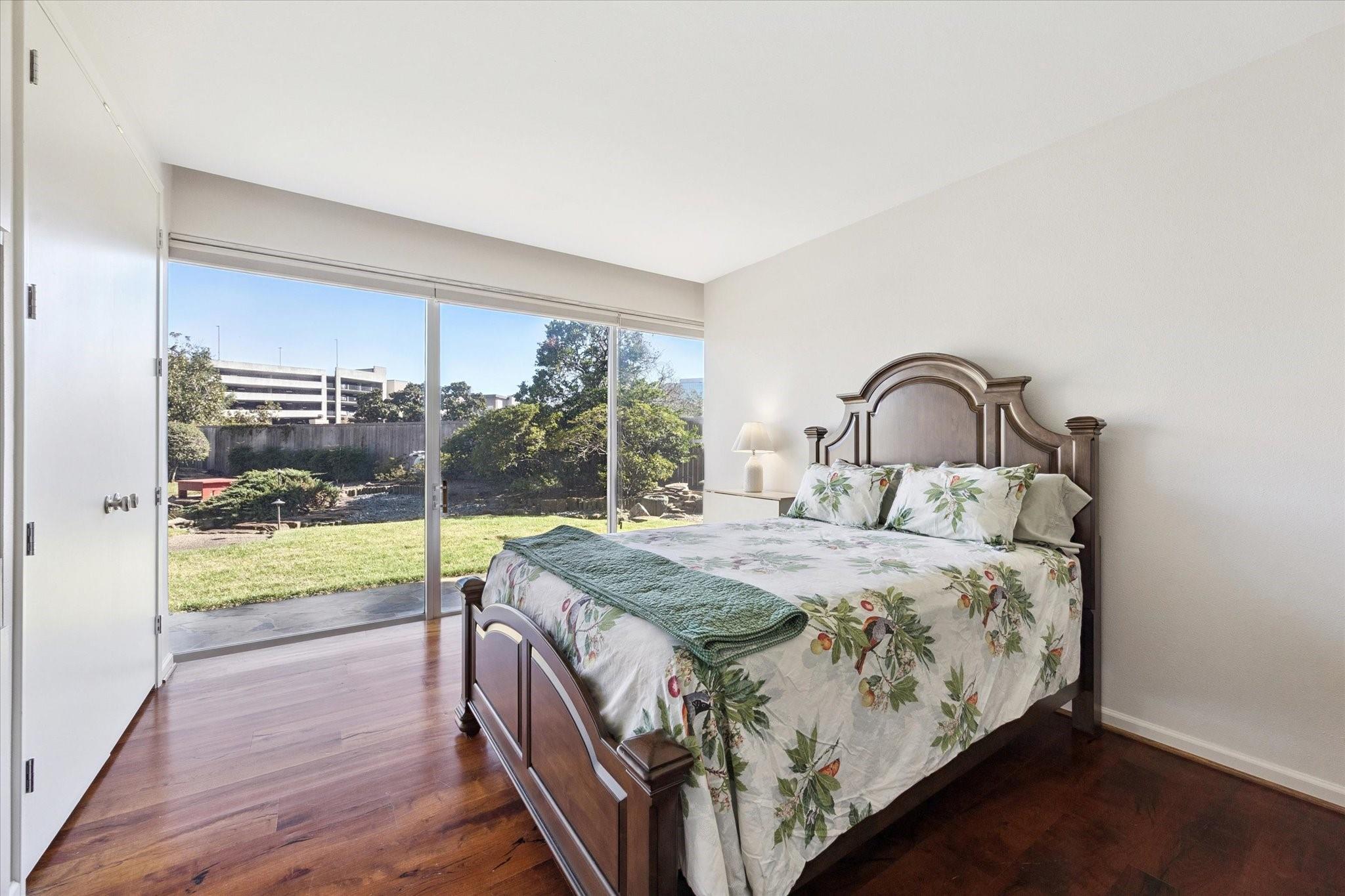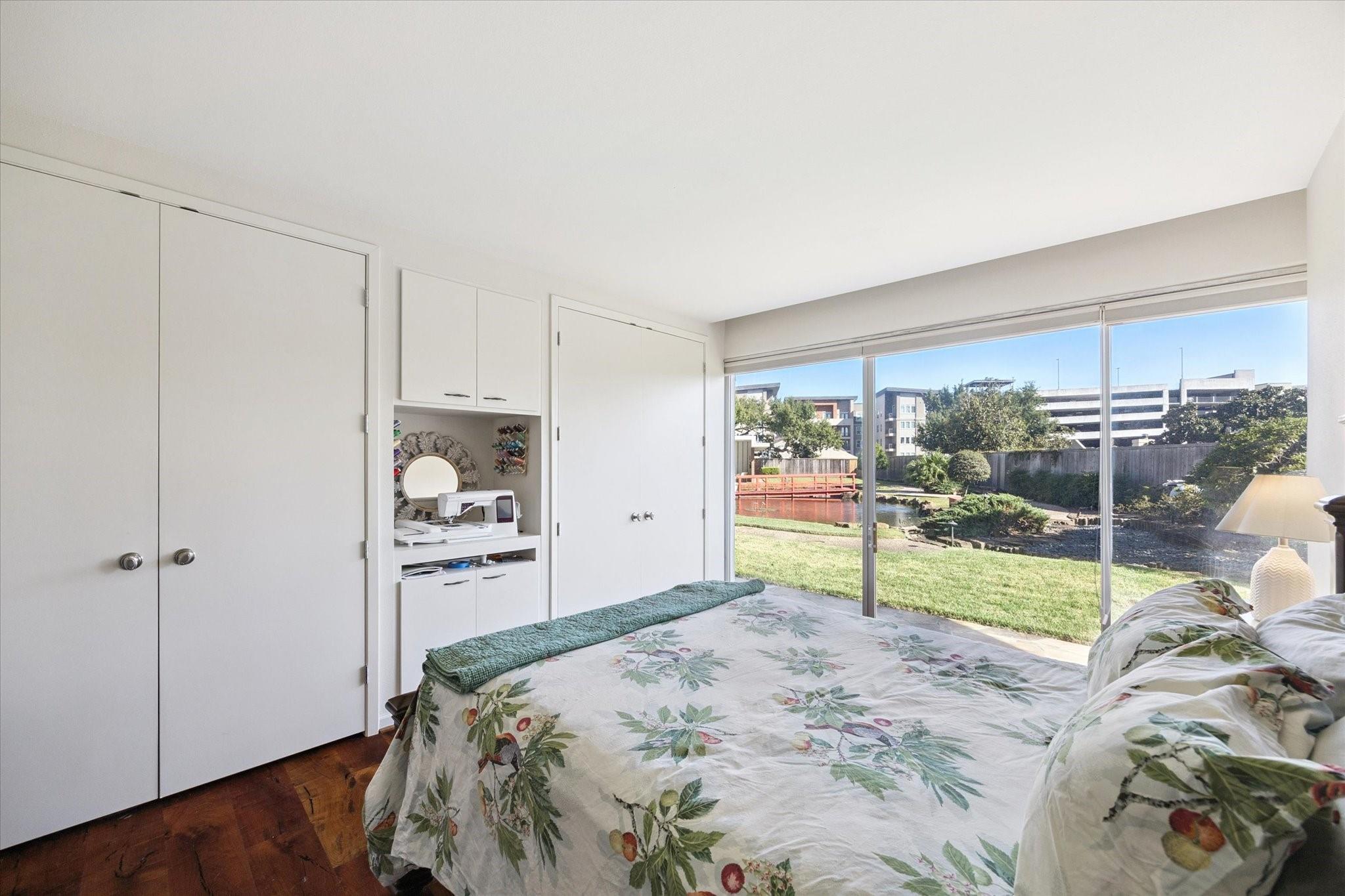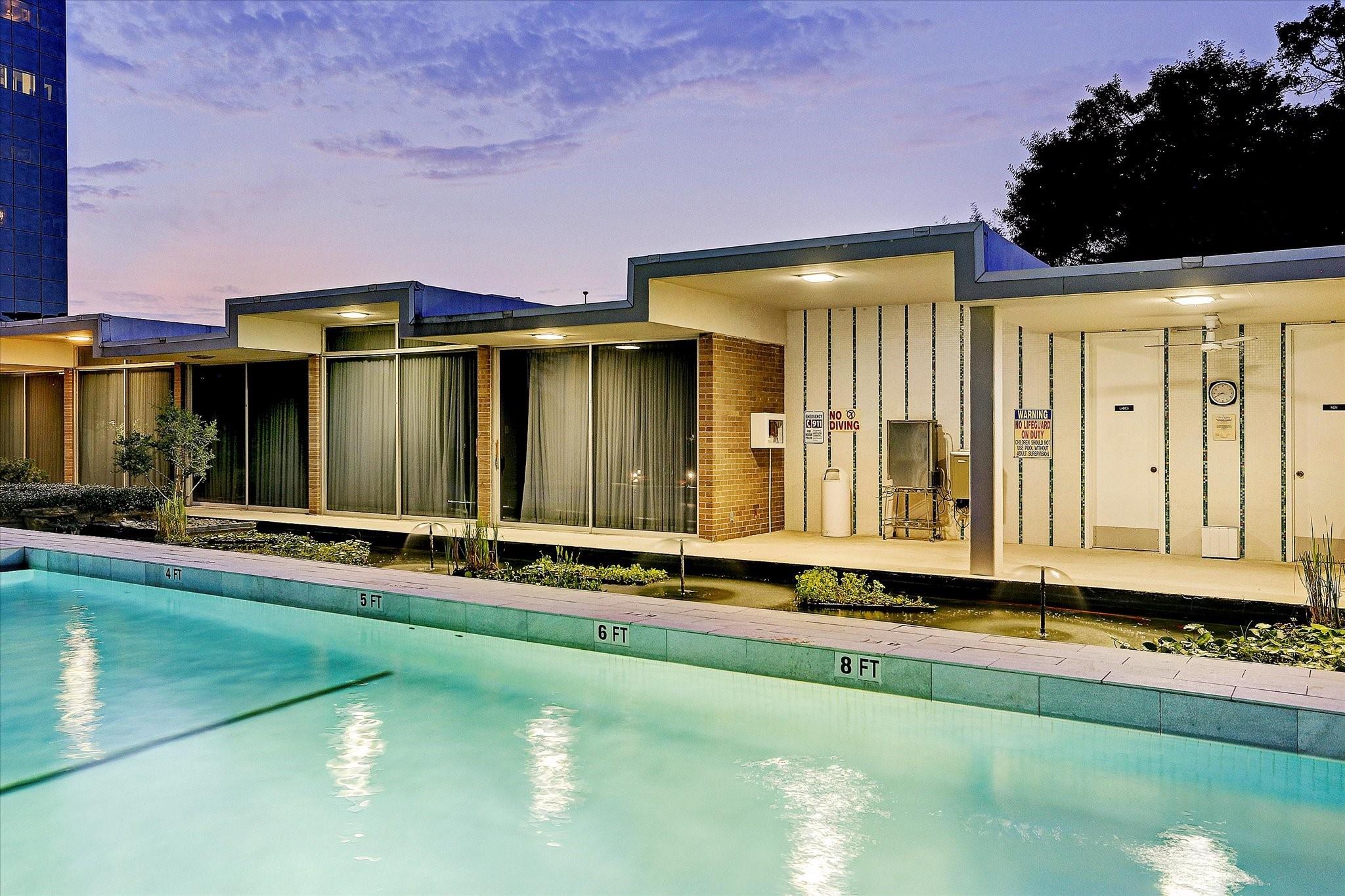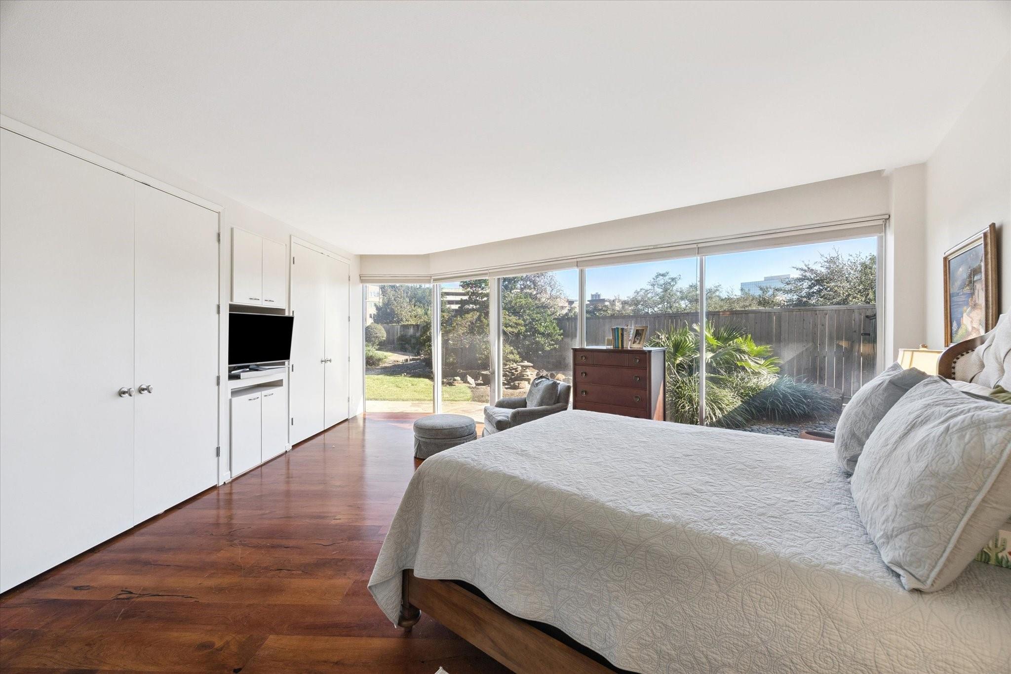 Set within the storied Executive House mid-rise, this 2,661-square-foot garden-level residence pairs timeless design with modern refinement. Overlooking the koi pond and Japanese gardens, the home features wide-plank hardwood floors, a 2023 kitchen renovation with soft-close cabinetry, granite counters and a full wet bar with beverage refrigerator and ice maker. The primary suite offers an atmosphere of quiet luxury with travertine finishes, a jetted soaking tub, separate shower and dual vanities. The secondary bedroom provides flexibility for guests or a study, complemented by generous storage throughout. A walk-in utility room with full-size stacked washer and dryer, 2 assigned parking spaces, and a controlled access complete the convenience of this residence. Residents enjoy full utilities included in the monthly HOA, along with concierge service, pool, sauna and beautifully maintained common areas. Situated in the Tanglewood area offering a peaceful yet connected Houston lifestyle.