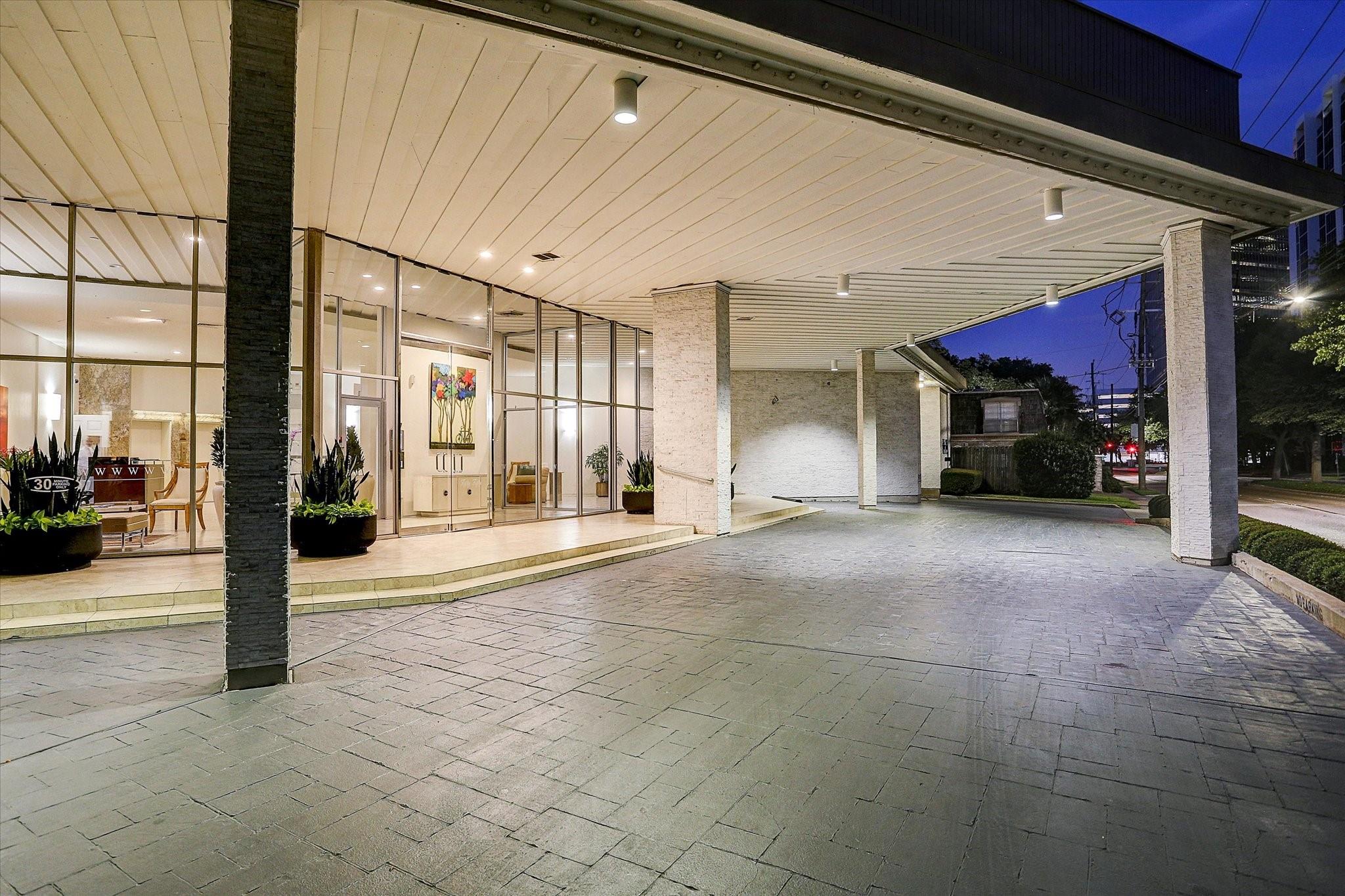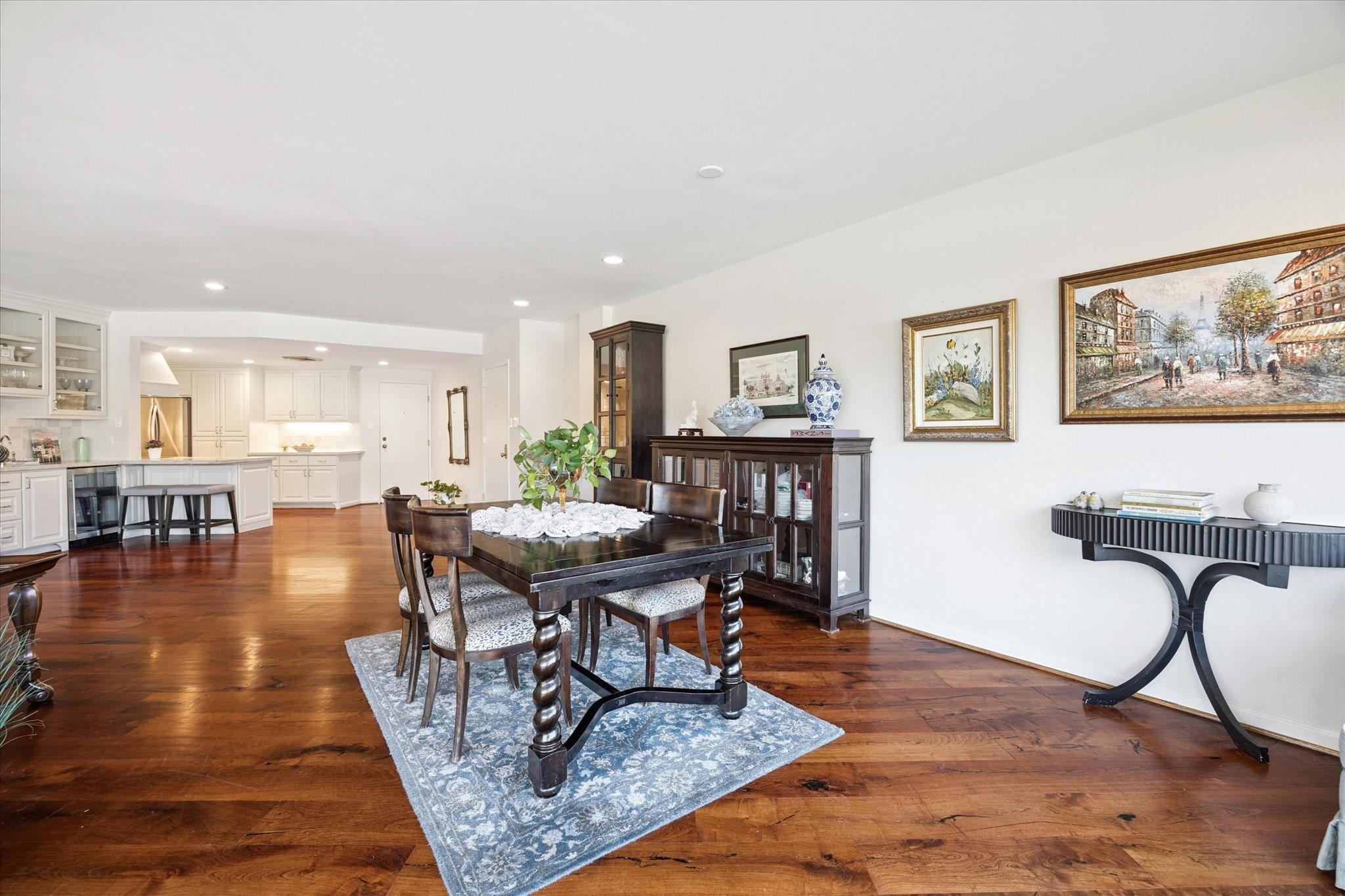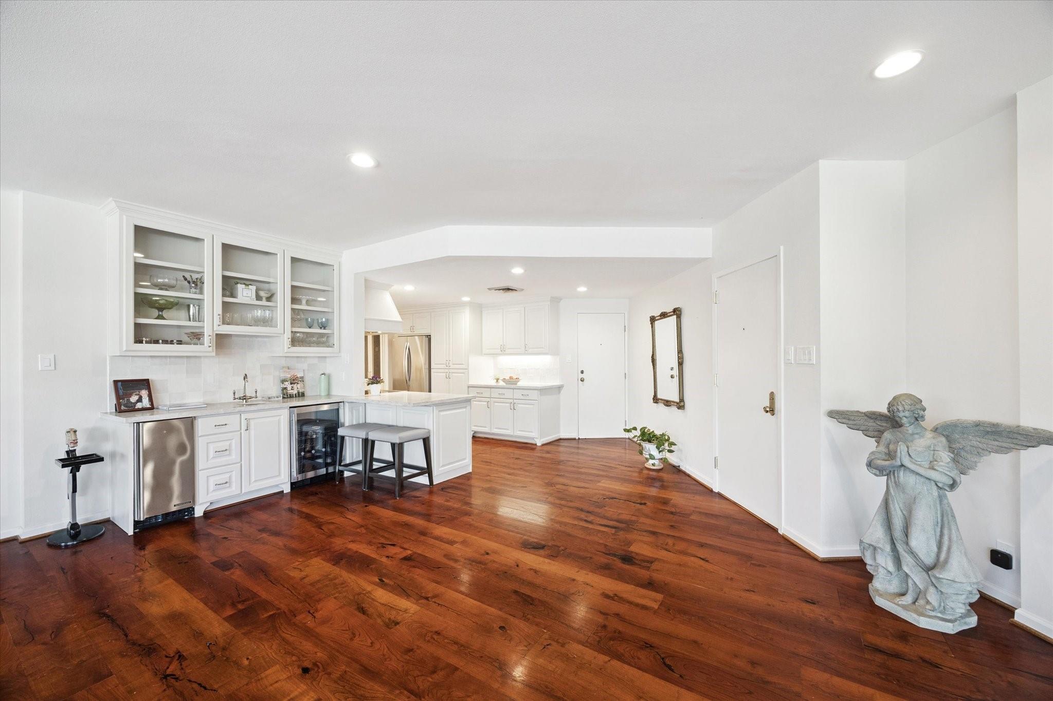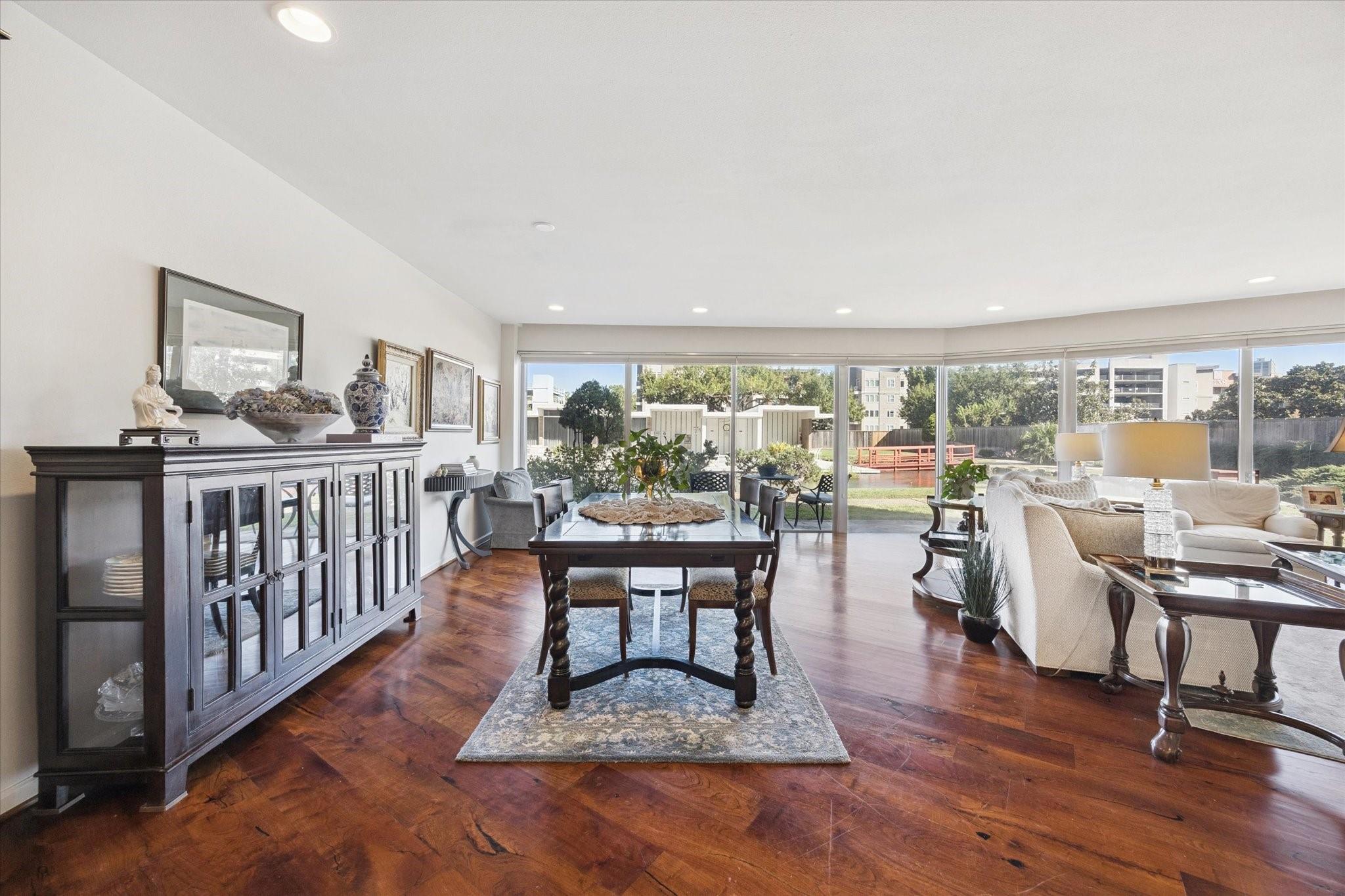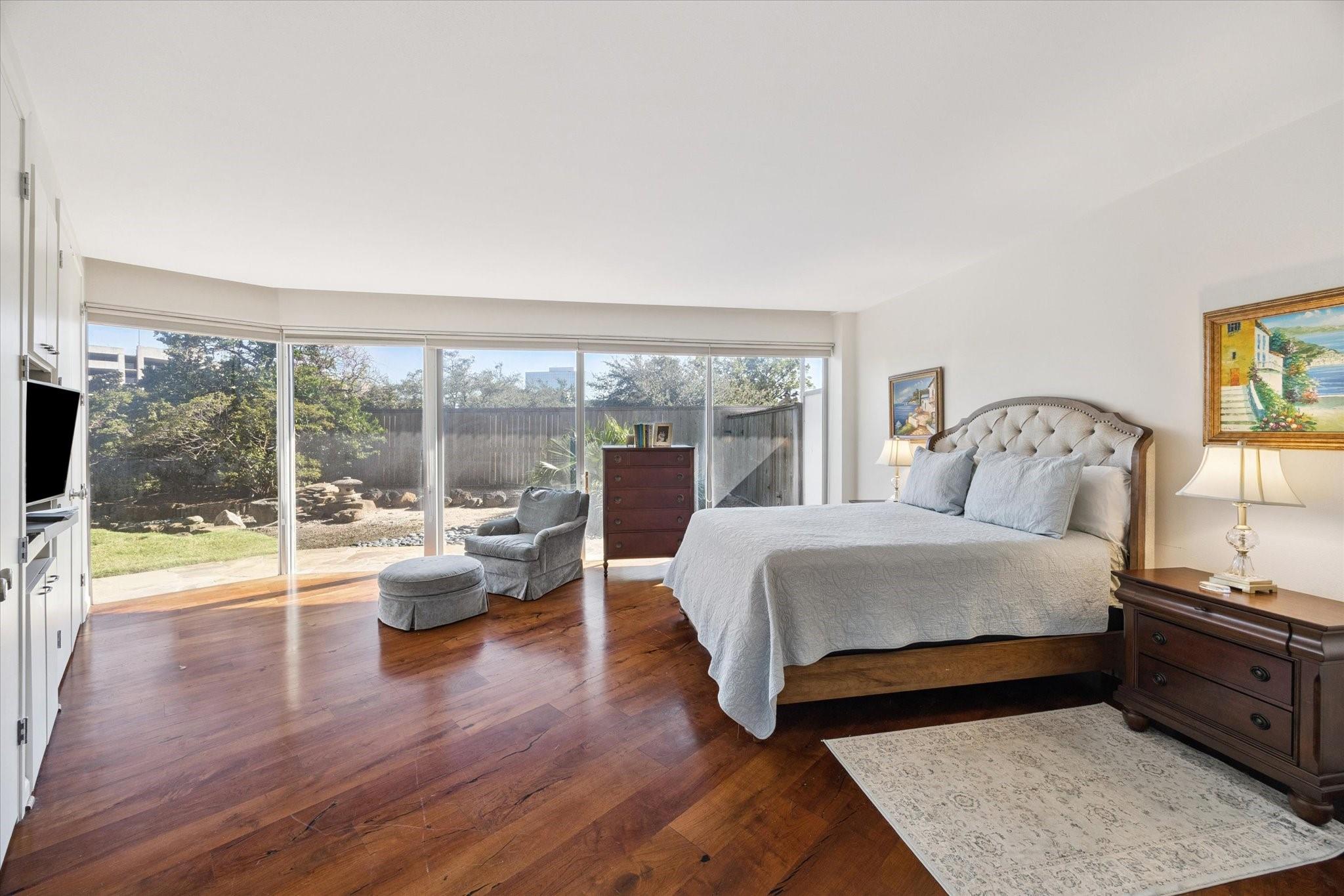 Set within the storied Executive House mid-rise, this 2,661-square-foot garden-level residence pairs timeless design with modern refinement. Overlooking the koi pond and Japanese gardens, the home features wide-plank hardwood floors, a 2023 kitchen renovation with soft-close cabinetry, granite counters and a full wet bar with beverage refrigerator and ice maker. The primary suite offers an atmosphere of quiet luxury with travertine finishes, a jetted soaking tub, separate shower and dual vanities. The secondary bedroom provides flexibility for guests or a study, complemented by generous storage throughout. A walk-in utility room with full-size stacked washer and dryer, 2 assigned parking spaces, and a controlled access complete the convenience of this residence. Residents enjoy full utilities included in the monthly HOA, along with concierge service, pool, sauna and beautifully maintained common areas. Situated in the Tanglewood area offering a peaceful yet connected Houston lifestyle.