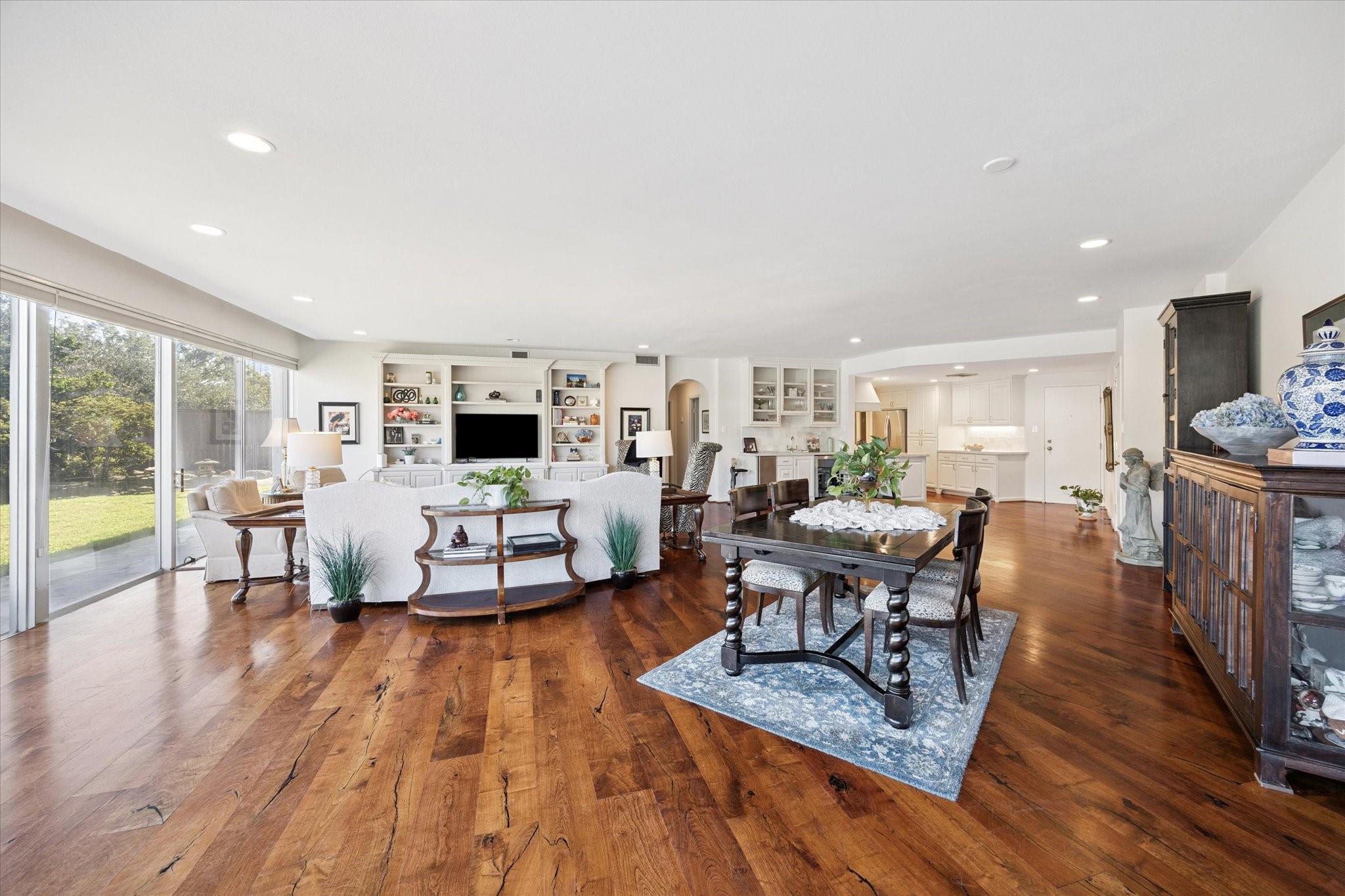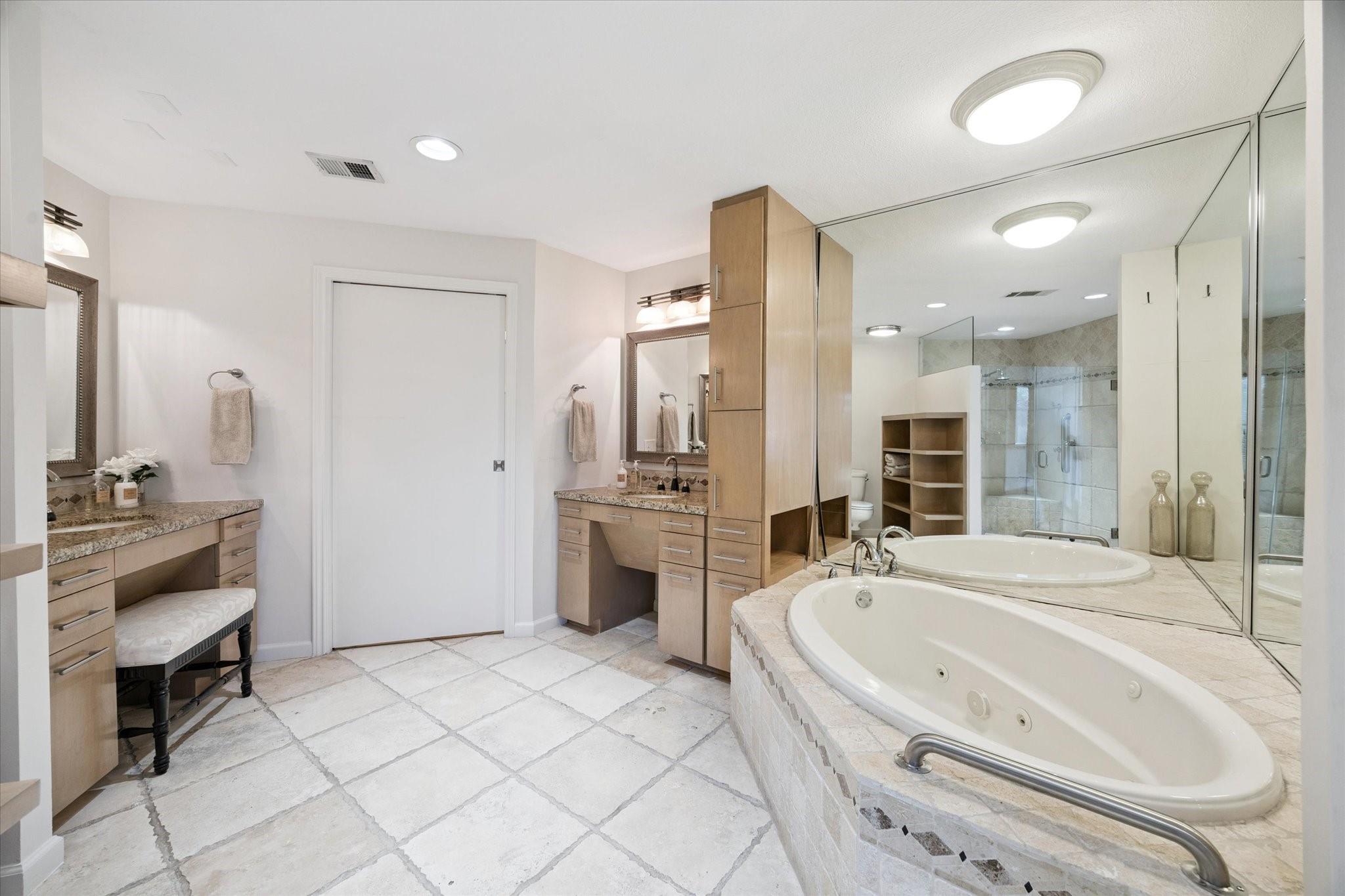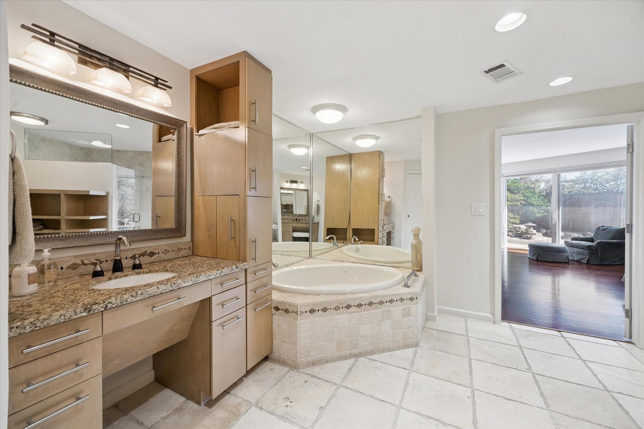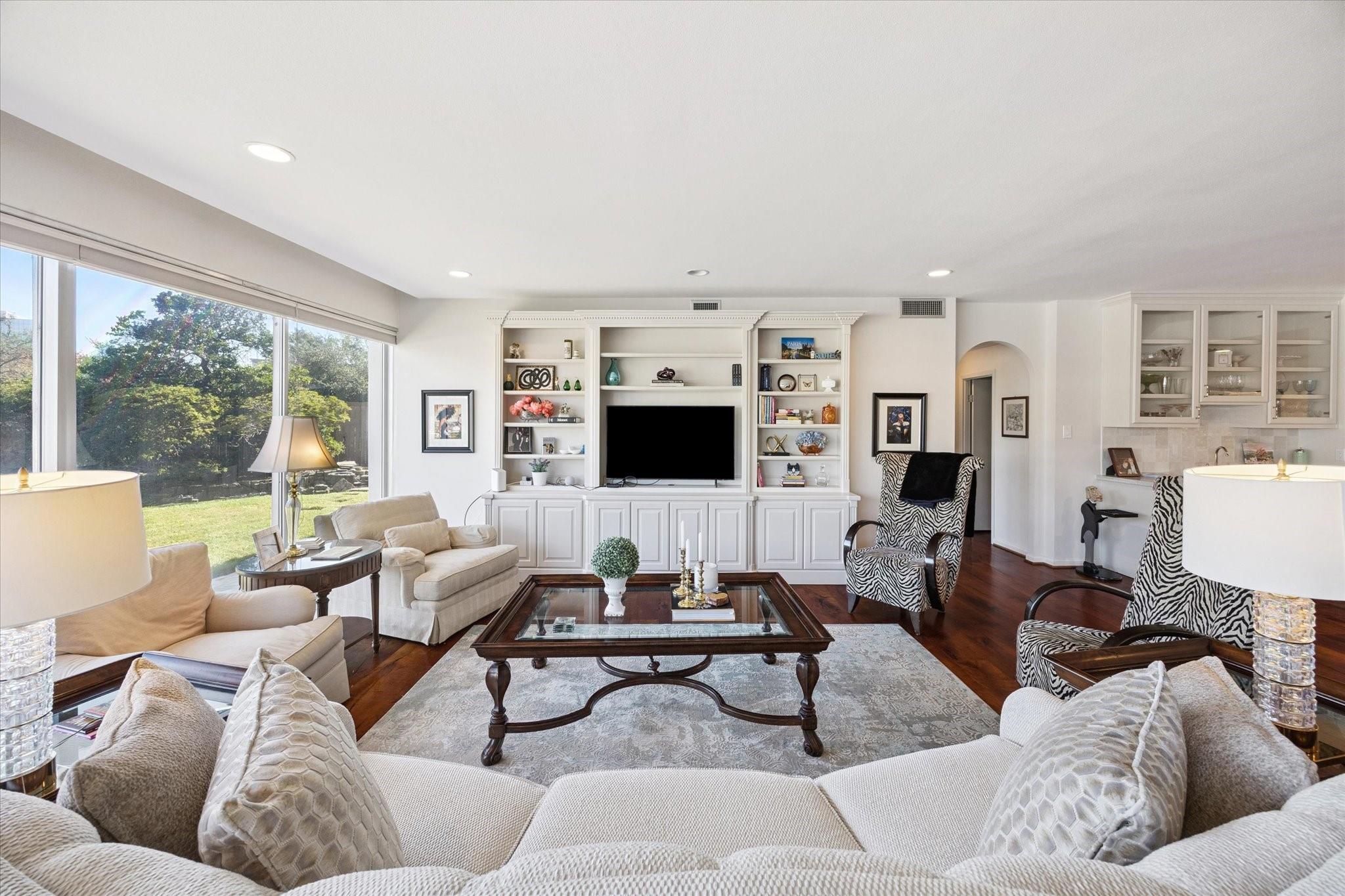 Set within the storied Executive House mid-rise, this 2,661-square-foot garden-level residence pairs timeless design with modern refinement. Overlooking the koi pond and Japanese gardens, the home features wide-plank hardwood floors, a 2023 kitchen renovation with soft-close cabinetry, granite counters and a full wet bar with beverage refrigerator and ice maker. The primary suite offers an atmosphere of quiet luxury with travertine finishes, a jetted soaking tub, separate shower and dual vanities. The secondary bedroom provides flexibility for guests or a study, complemented by generous storage throughout. A walk-in utility room with full-size stacked washer and dryer, 2 assigned parking spaces, and a controlled access complete the convenience of this residence. Residents enjoy full utilities included in the monthly HOA, along with concierge service, pool, sauna and beautifully maintained common areas. Situated in the Tanglewood area offering a peaceful yet connected Houston lifestyle.