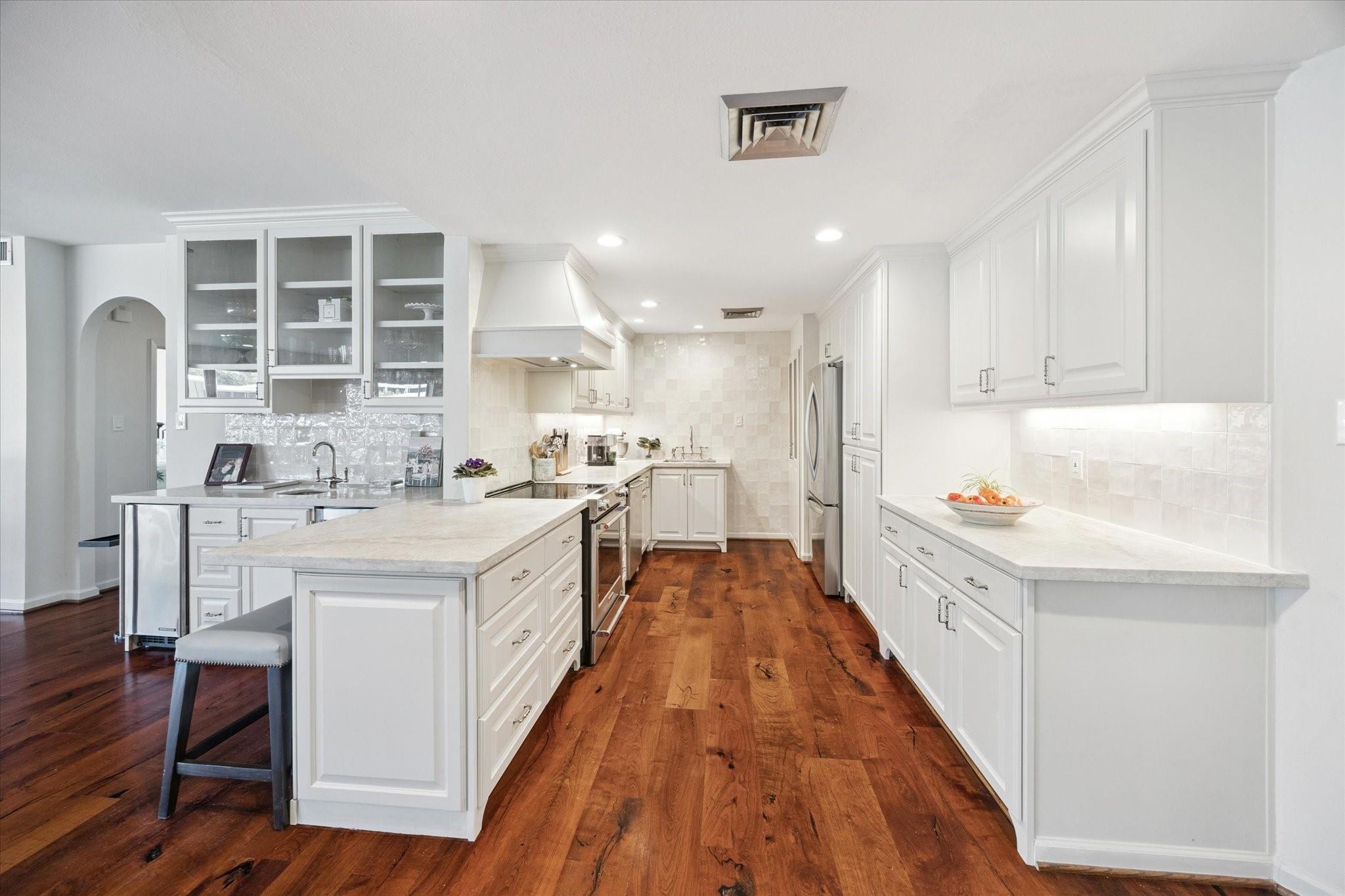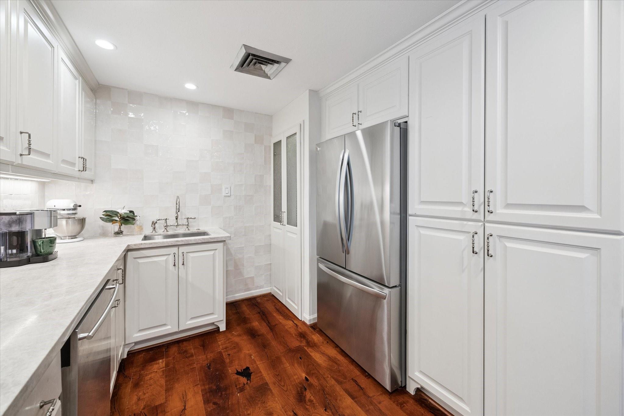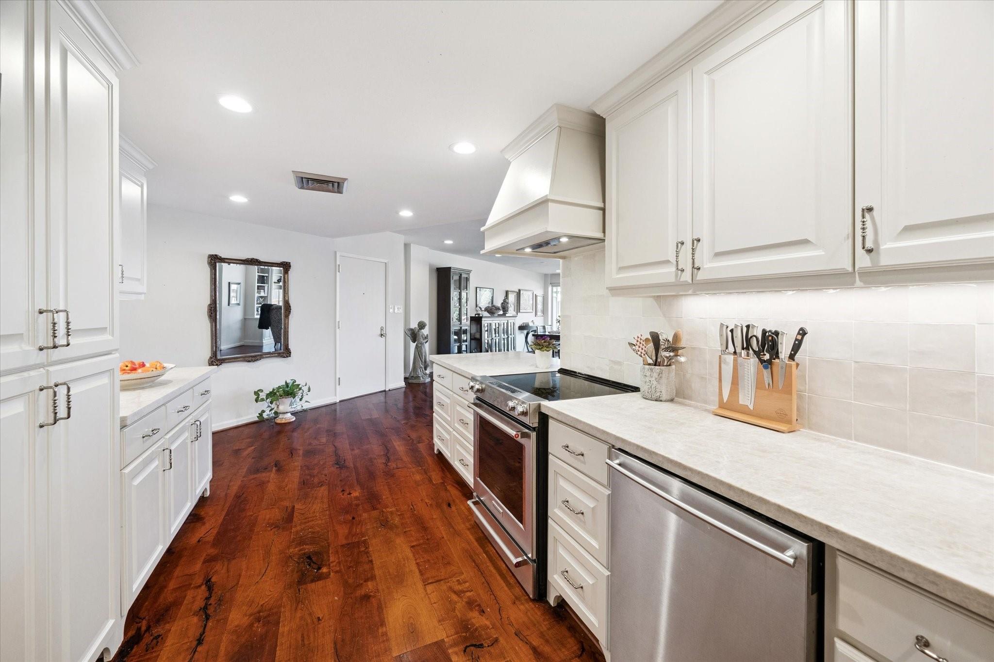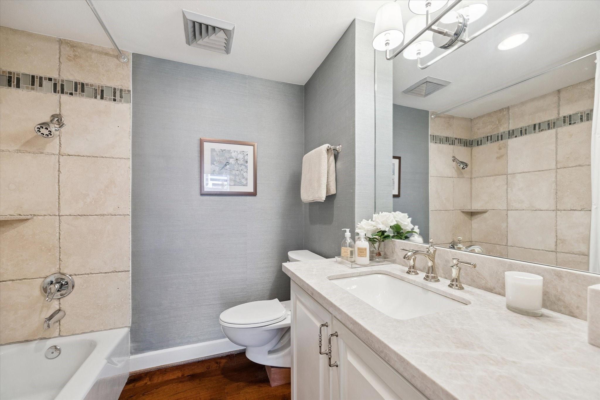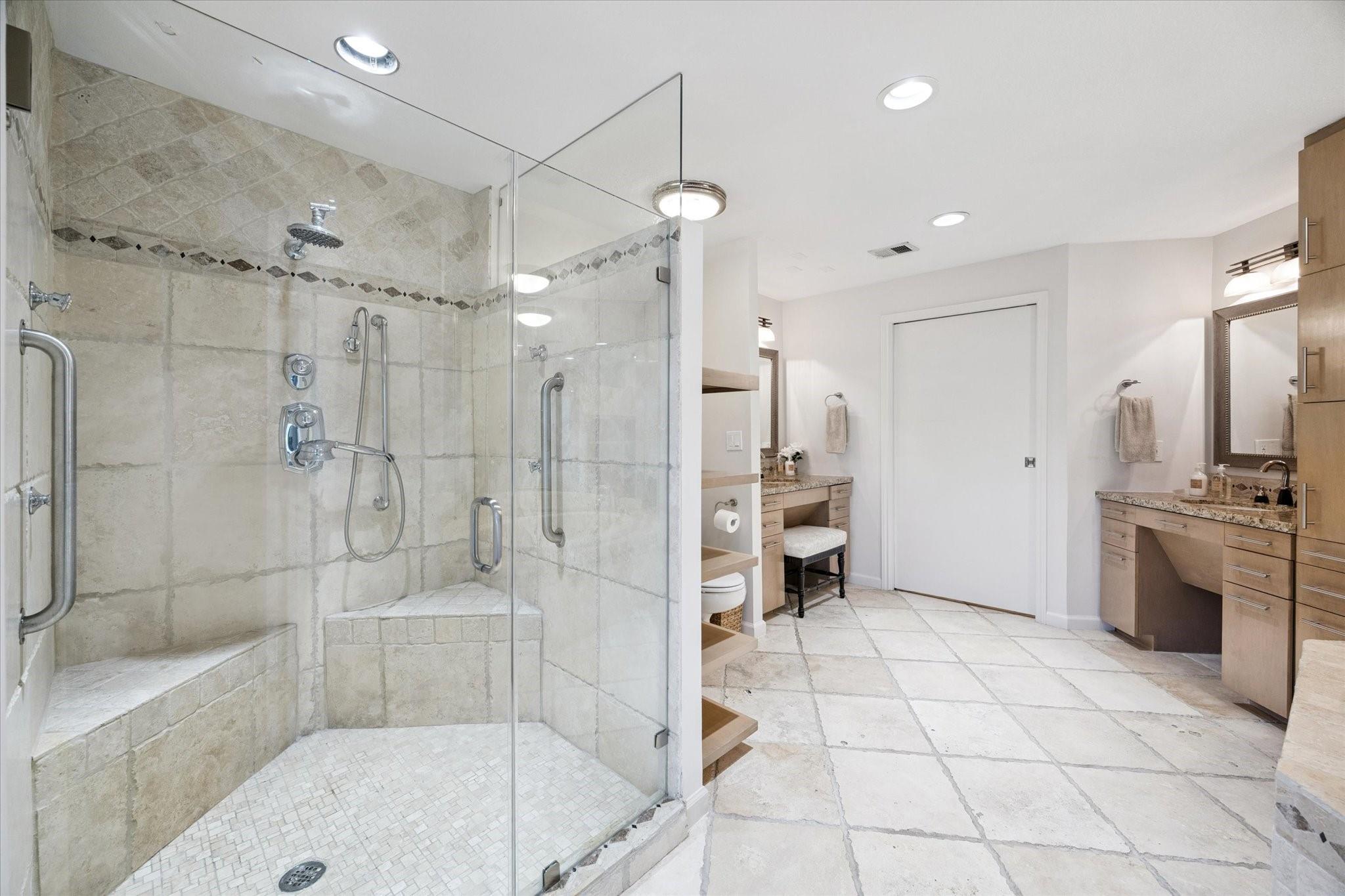 Set within the storied Executive House mid-rise, this 2,661-square-foot garden-level residence pairs timeless design with modern refinement. Overlooking the koi pond and Japanese gardens, the home features wide-plank hardwood floors, a 2023 kitchen renovation with soft-close cabinetry, granite counters and a full wet bar with beverage refrigerator and ice maker. The primary suite offers an atmosphere of quiet luxury with travertine finishes, a jetted soaking tub, separate shower and dual vanities. The secondary bedroom provides flexibility for guests or a study, complemented by generous storage throughout. A walk-in utility room with full-size stacked washer and dryer, 2 assigned parking spaces, and a controlled access complete the convenience of this residence. Residents enjoy full utilities included in the monthly HOA, along with concierge service, pool, sauna and beautifully maintained common areas. Situated in the Tanglewood area offering a peaceful yet connected Houston lifestyle.