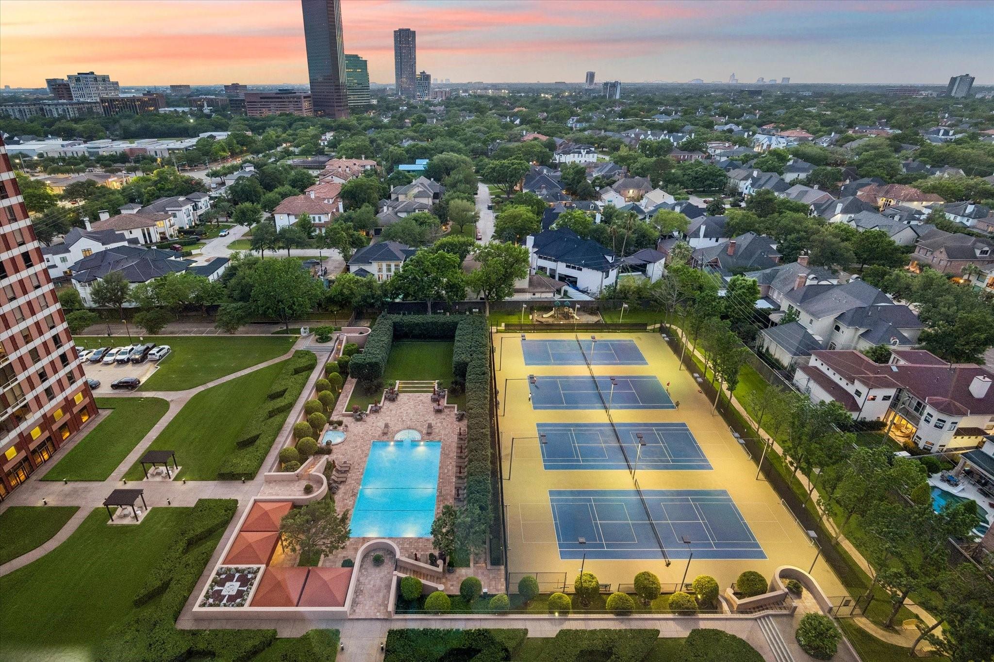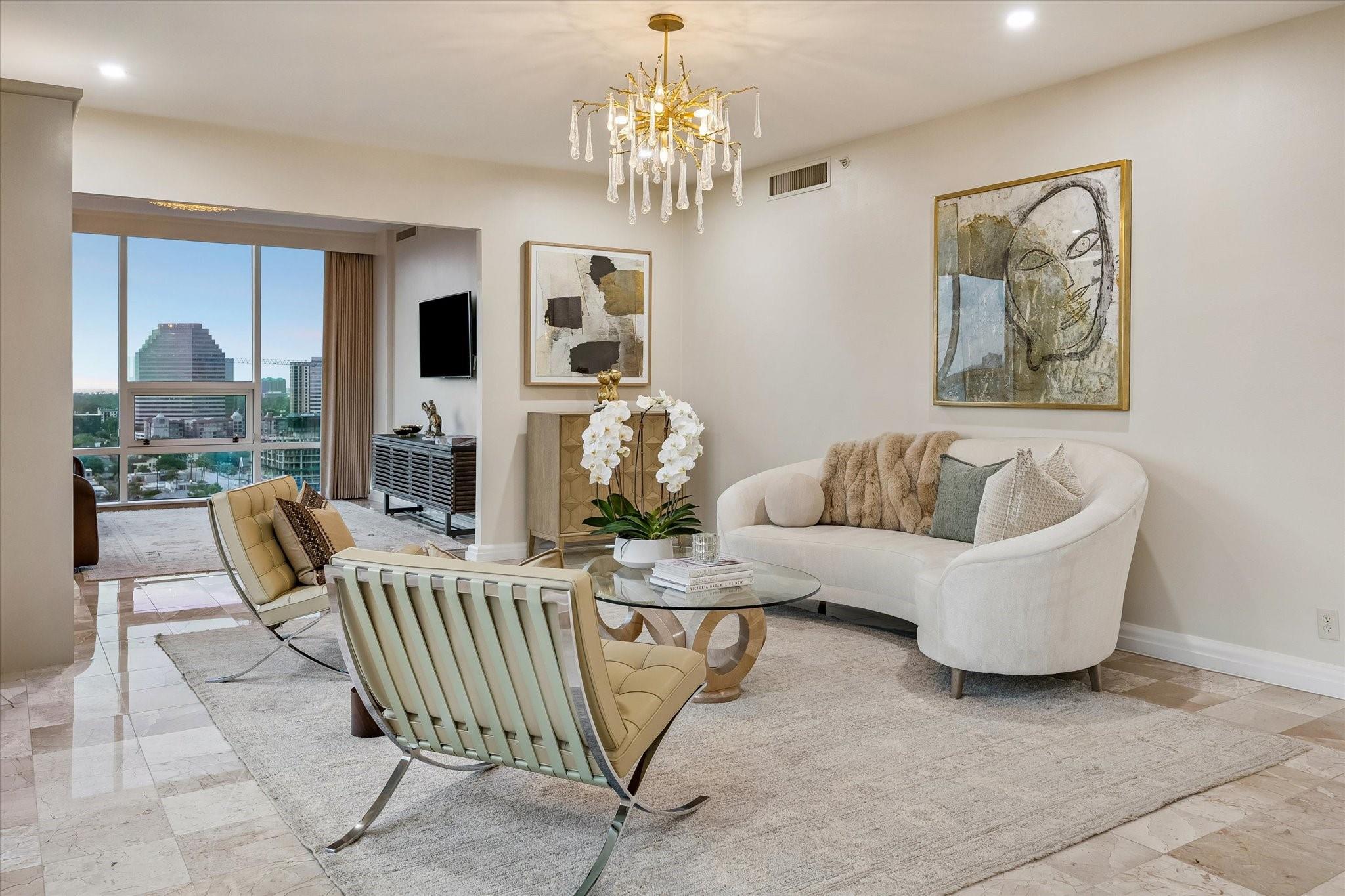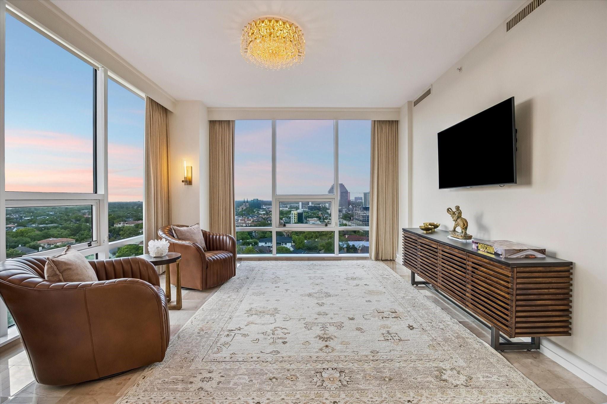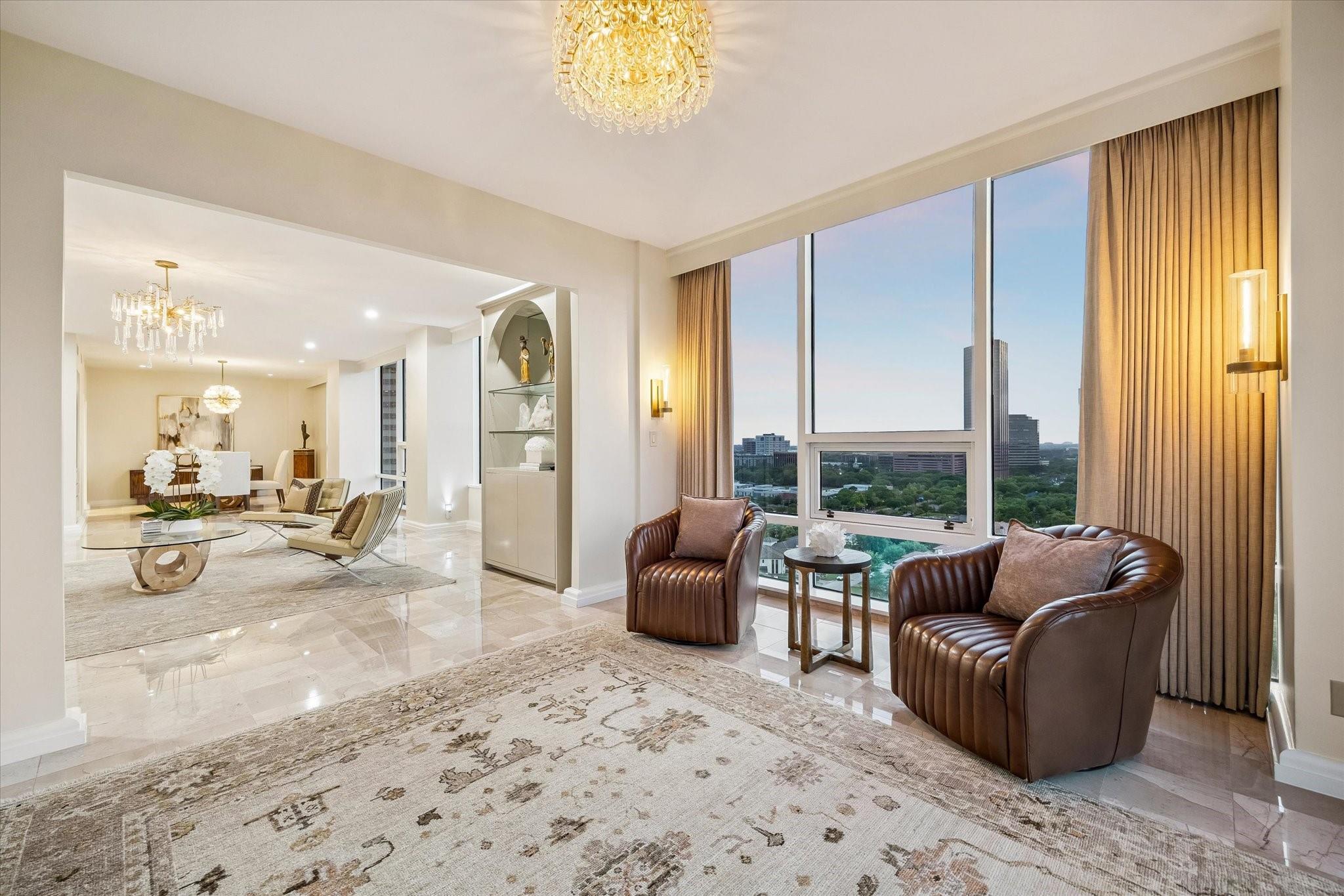Beautifully renovated 2,690 sq. ft. 16th floor residence with Northwest views overlooking Tanglewood and 9 acres of manicured resort style grounds at Four Leaf Towers. Warm neutral tones, marble flooring, designer lighting, thoughtful built-in cabinetry and excellent floor plan. Spacious living and dining rooms flow seamlessly with abundant light. Corner sunroom with floor to ceiling windows. Updated kitchen includes Wolf induction cooktop, porcelain counters, expanded pantry with 2nd sink, stacked washer/dryer. Spacious primary suite with floor to ceiling windows, 3 closets, custom cabinetry and spa bath with huge walk-in shower, freestanding soaking tub, lit mirrors and double sinks. Ensuite secondary bedroom with updated bath with walk-in shower and walk-in closet. Full service living w/24-hour concierge, valet, porter, fitness center, dry sauna, spa & party room. Nine acres of manicured gated grounds w/heated swimming pool, dog park, play area, grills & covered cabanas.