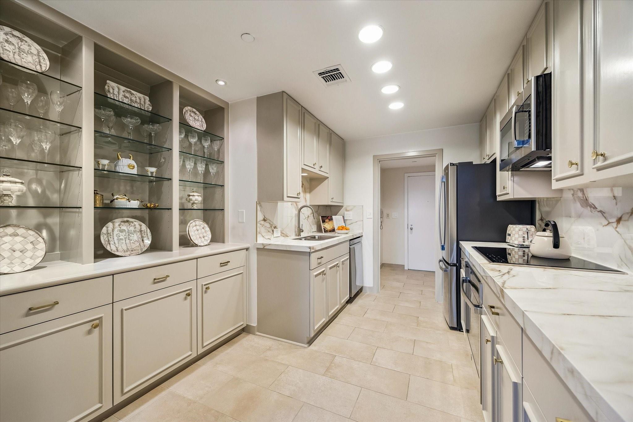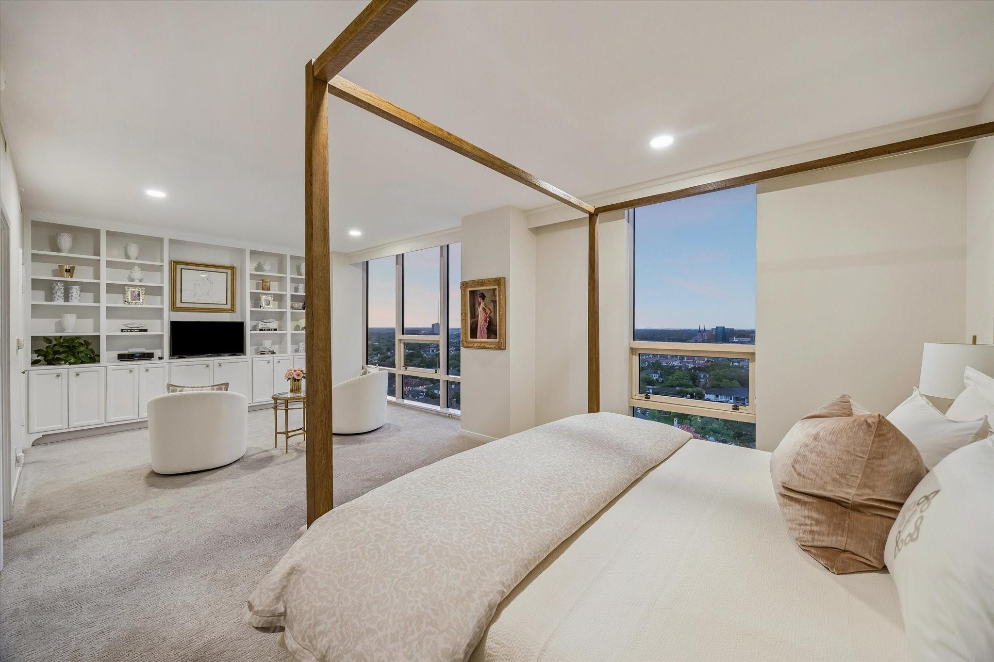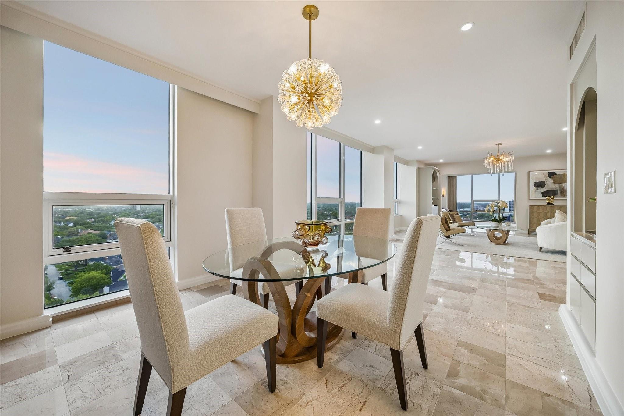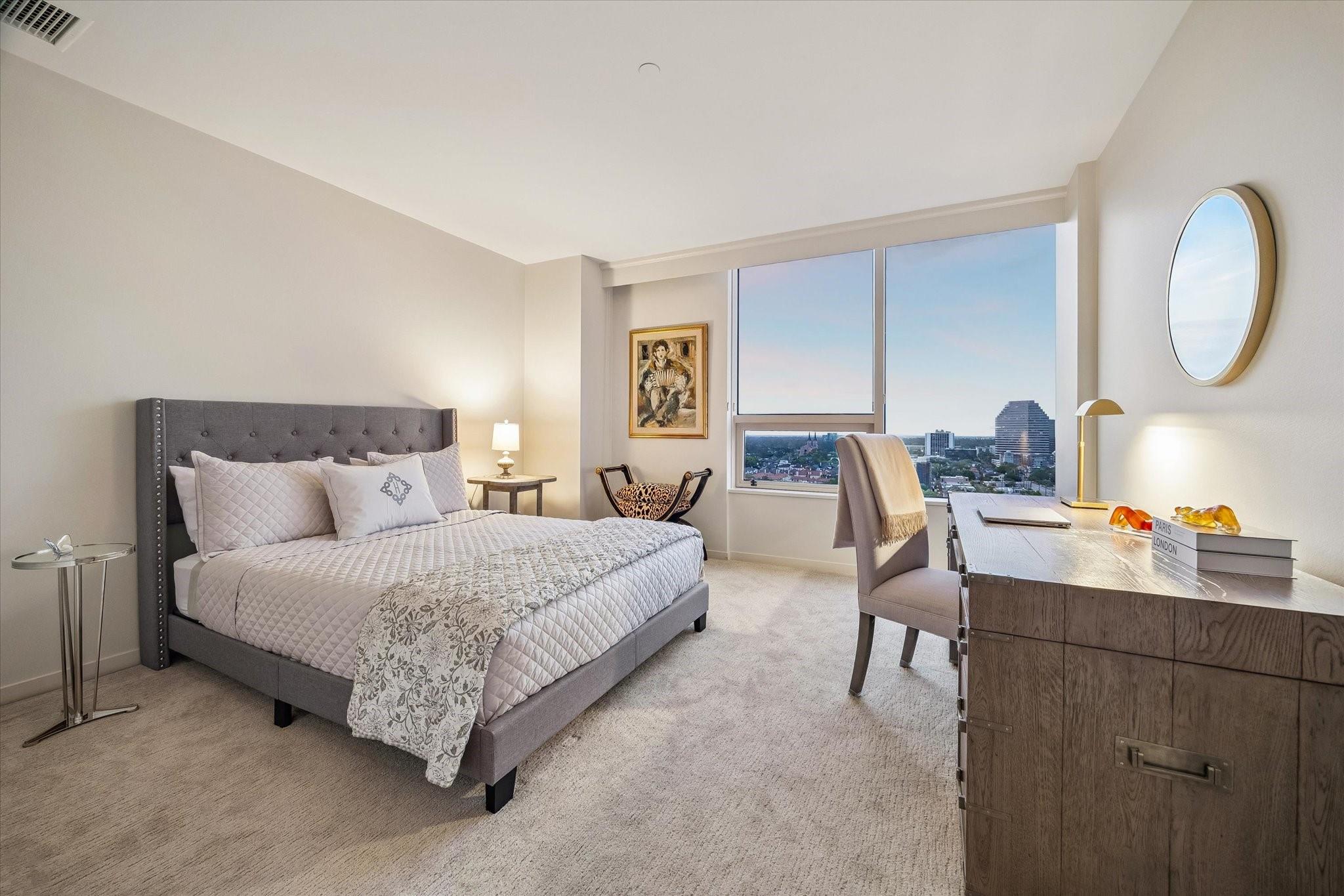 Beautifully renovated 2,690 sq. ft. 16th floor residence with Northwest views overlooking Tanglewood and 9 acres of manicured resort style grounds at Four Leaf Towers. Warm neutral tones, marble flooring, designer lighting, thoughtful built-in cabinetry and excellent floor plan. Spacious living and dining rooms flow seamlessly with abundant light. Corner sunroom with floor to ceiling windows. Updated kitchen includes Wolf induction cooktop, porcelain counters, expanded pantry with 2nd sink, stacked washer/dryer. Spacious primary suite with floor to ceiling windows, 3 closets, custom cabinetry and spa bath with huge walk-in shower, freestanding soaking tub, lit mirrors and double sinks. Ensuite secondary bedroom with updated bath with walk-in shower and walk-in closet. Full service living w/24-hour concierge, valet, porter, fitness center, dry sauna, spa & party room. Nine acres of manicured gated grounds w/heated swimming pool, dog park, play area, grills & covered cabanas.