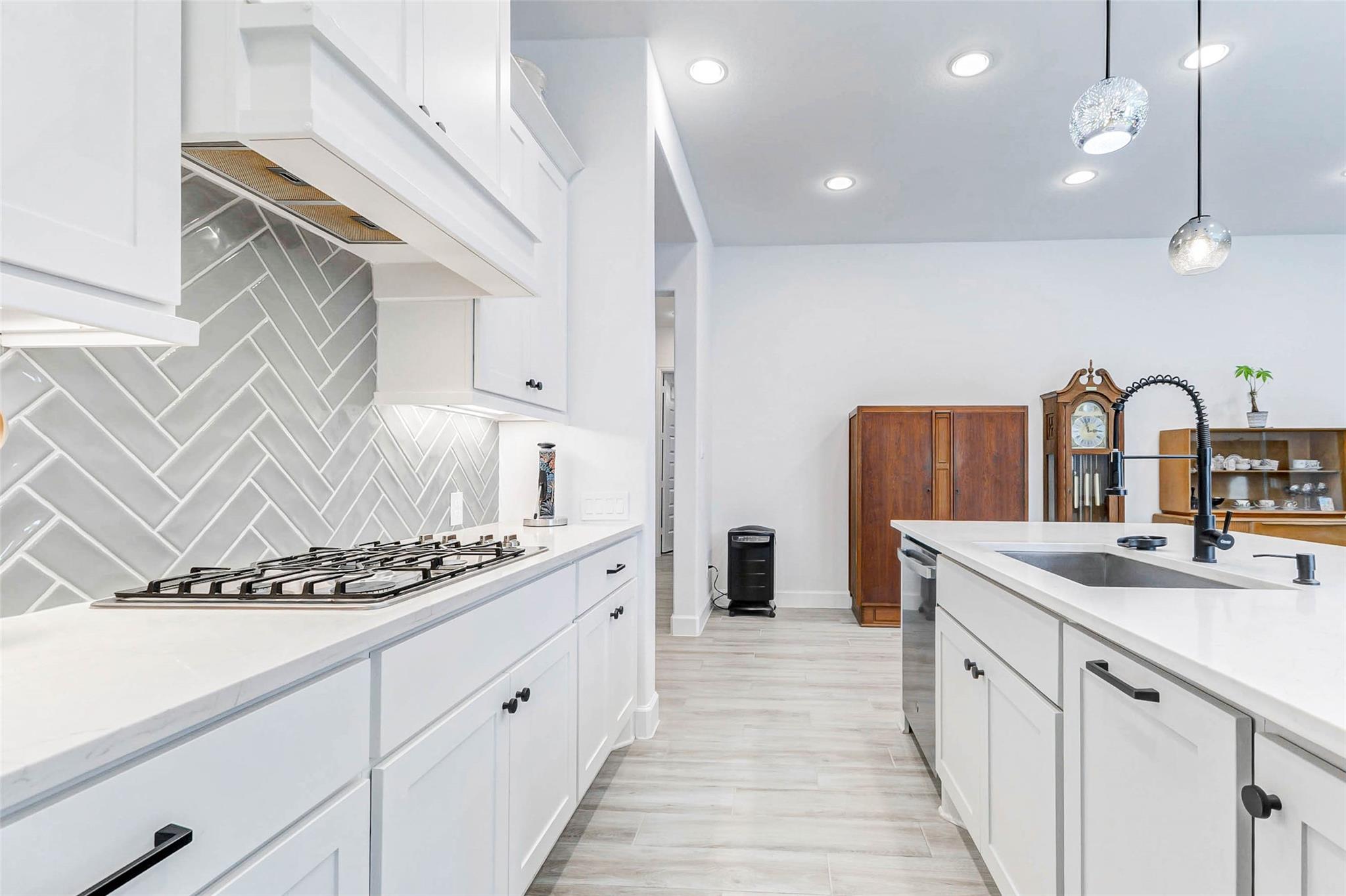 Stunning one-story brick home offering 4 bedrooms, 3.5 baths, and a 3-car garage with upgrades completed—no builder delays or added costs. Entry welcomes you with soaring ceilings and wood-look tile flooring throughout the main living areas. A private home office with glass French doors sits near the front. The heart of the home features a gorgeous kitchen with quartz countertops, abundant cabinetry, walk-in pantry, gas cooktop, breakfast bar, and under-cabinet lighting. Open-concept layout flows into the dining and living areas, highlighted by expansive windows with custom blinds and natural light. One secondary bedroom offers a private ensuite bath, while two additional bedrooms share a full bath. The primary suite features four large windows and a spa-like ensuite with dual vanities, soaking tub, and two walk-in closets. Enjoy a covered patio with ceiling fan and fully fenced backyard with no back neighbors. Security system included. Located in desirable Cross Creek West community.