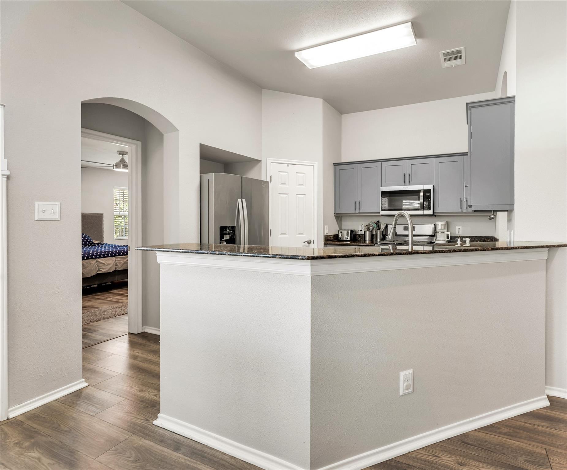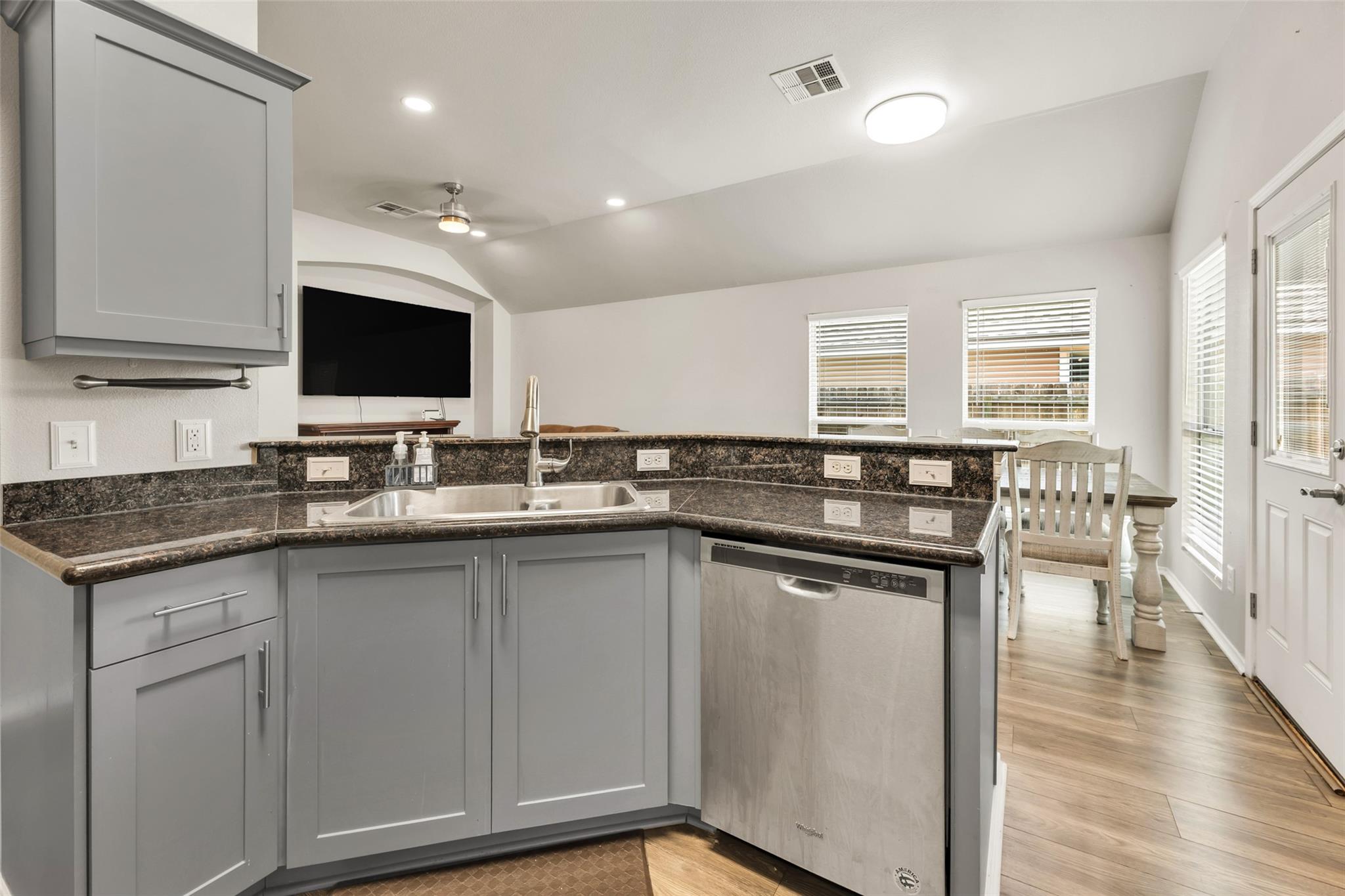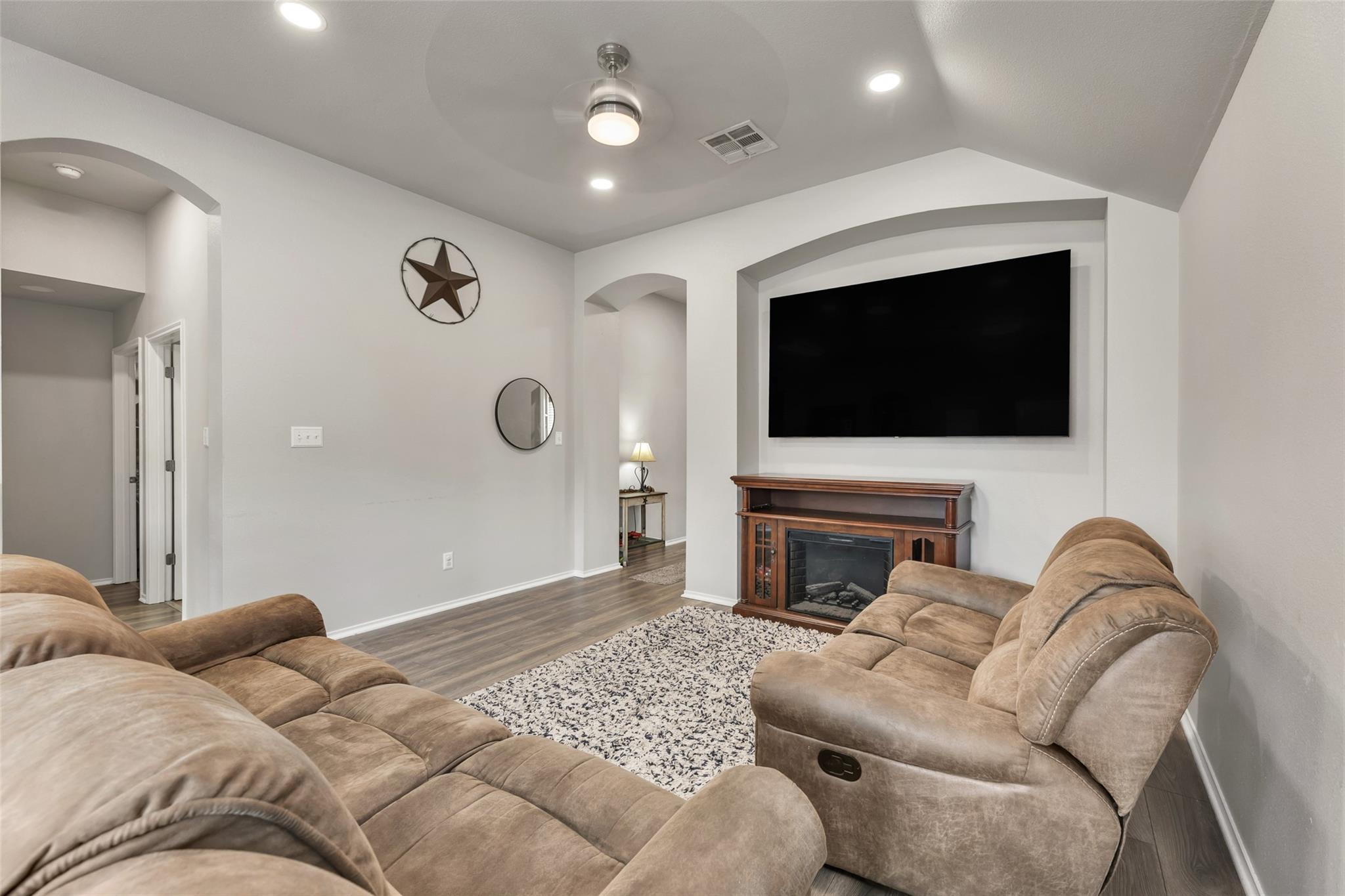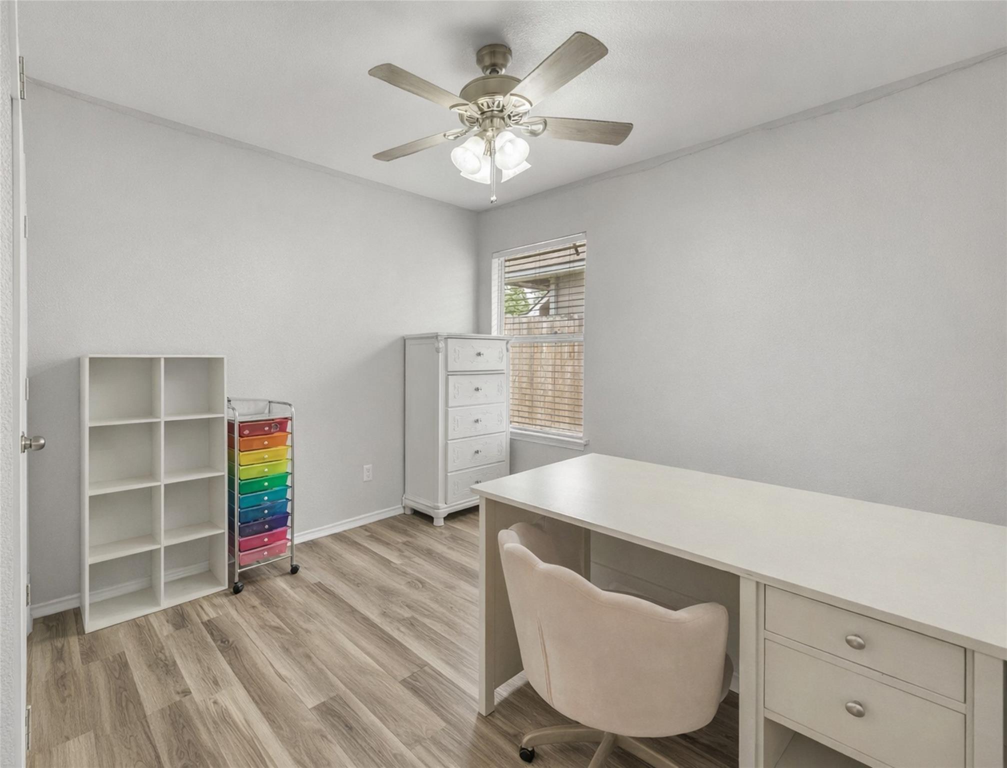 Thoughtfully updated 3-bedroom, 2-bath home with a study framed by French doors and built-in shelving. An open floorplan with an eating bar that seamlessly connects the kitchen, dining area and living room—where a raised ceiling and electric fireplace add light and warmth. The kitchen has tall cabinets, wraparound countertops and granite surfaces installed three years ago. Luxury vinyl flooring flows through the living areas and bedrooms, with tile in the baths. The master suite offers a large walk-in closet and a remodeled bathroom with double sinks and a tiled, separate shower. Recent improvements completed three years ago include new light fixtures and ceiling fans, fresh interior paint, and updated cabinet pulls and fixtures; the water heater was replaced five years ago. Practical touches include a partially floored attic and garage ventilation. A large backyard and the community pool and playground provides room for entertaining. USDA financing is available for eligible buyers.