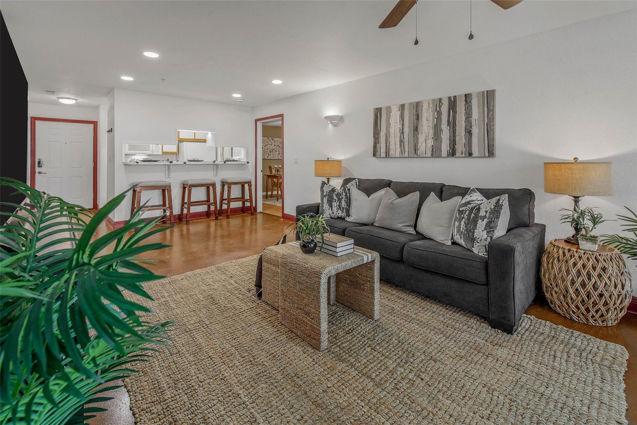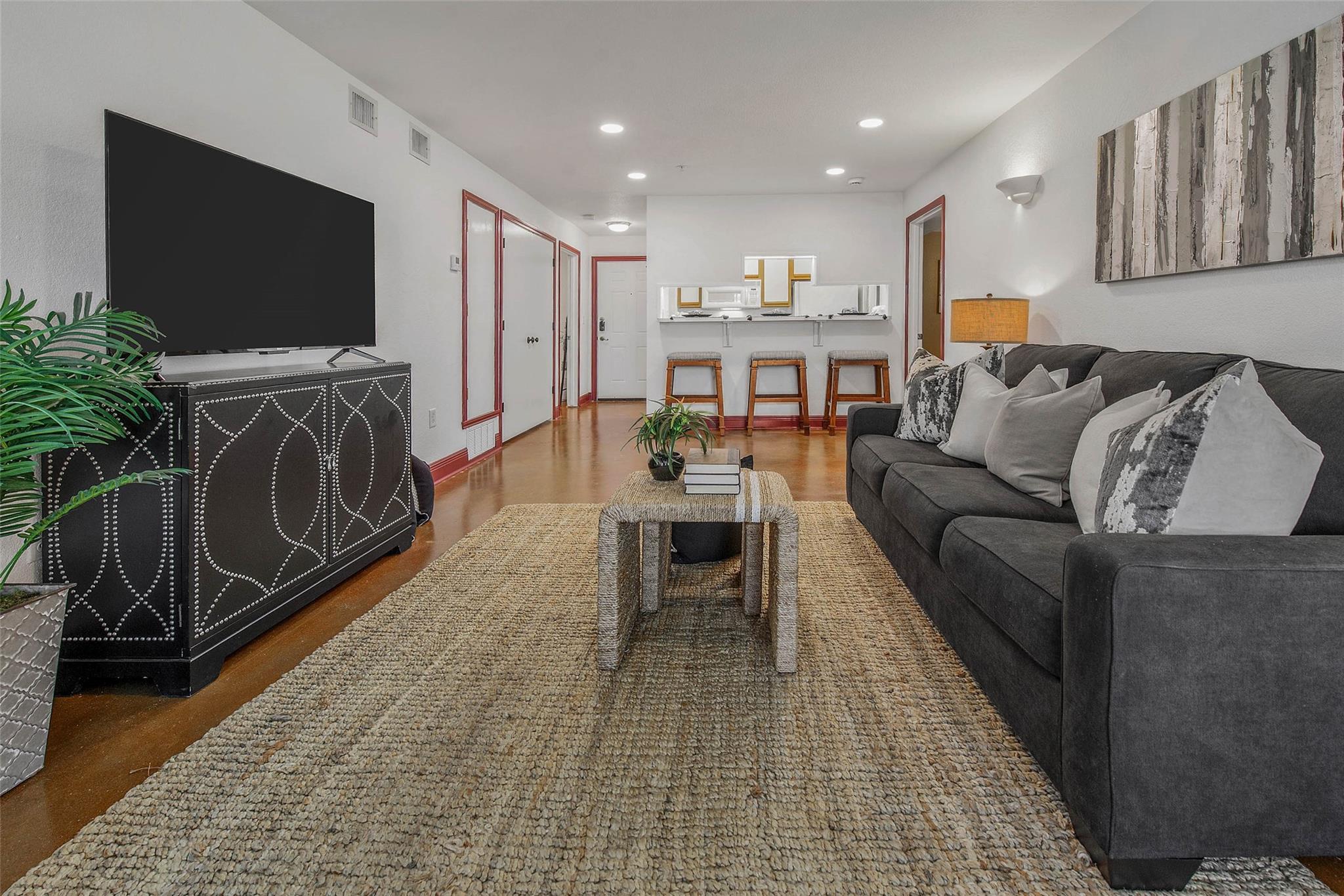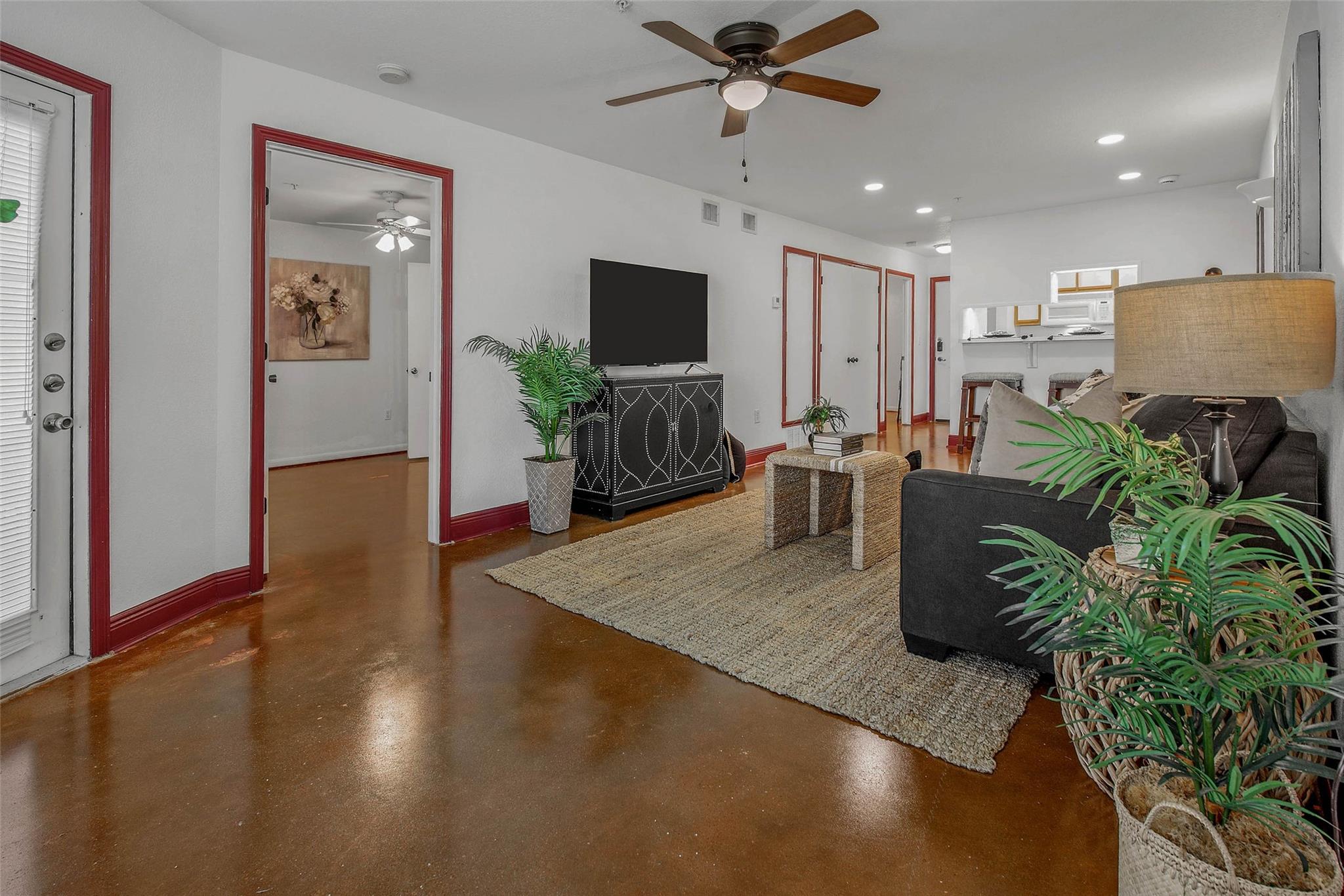 InteriorFloors:Concrete,LaminateCountertop:LaminateBathroom Description:Secondary Bath(s): Tub/Shower ComboBedroom Desc:En-Suite Bath,Walk-In ClosetRoom Description:1 Living Area,Family Room,Kitchen/Dining ComboHeating:Central ElectricCooling:Central ElectricDishwasher:YesDisposal:NoMicrowave:YesRange:Electric Cooktop,Electric RangeOven:Electric OvenAppliances:Dryer Included,Full Size,Refrigerator,Washer IncludedEnergy Feature:Ceiling Fans,Digital Program ThermostatInterior:Fire/Smoke Alarm