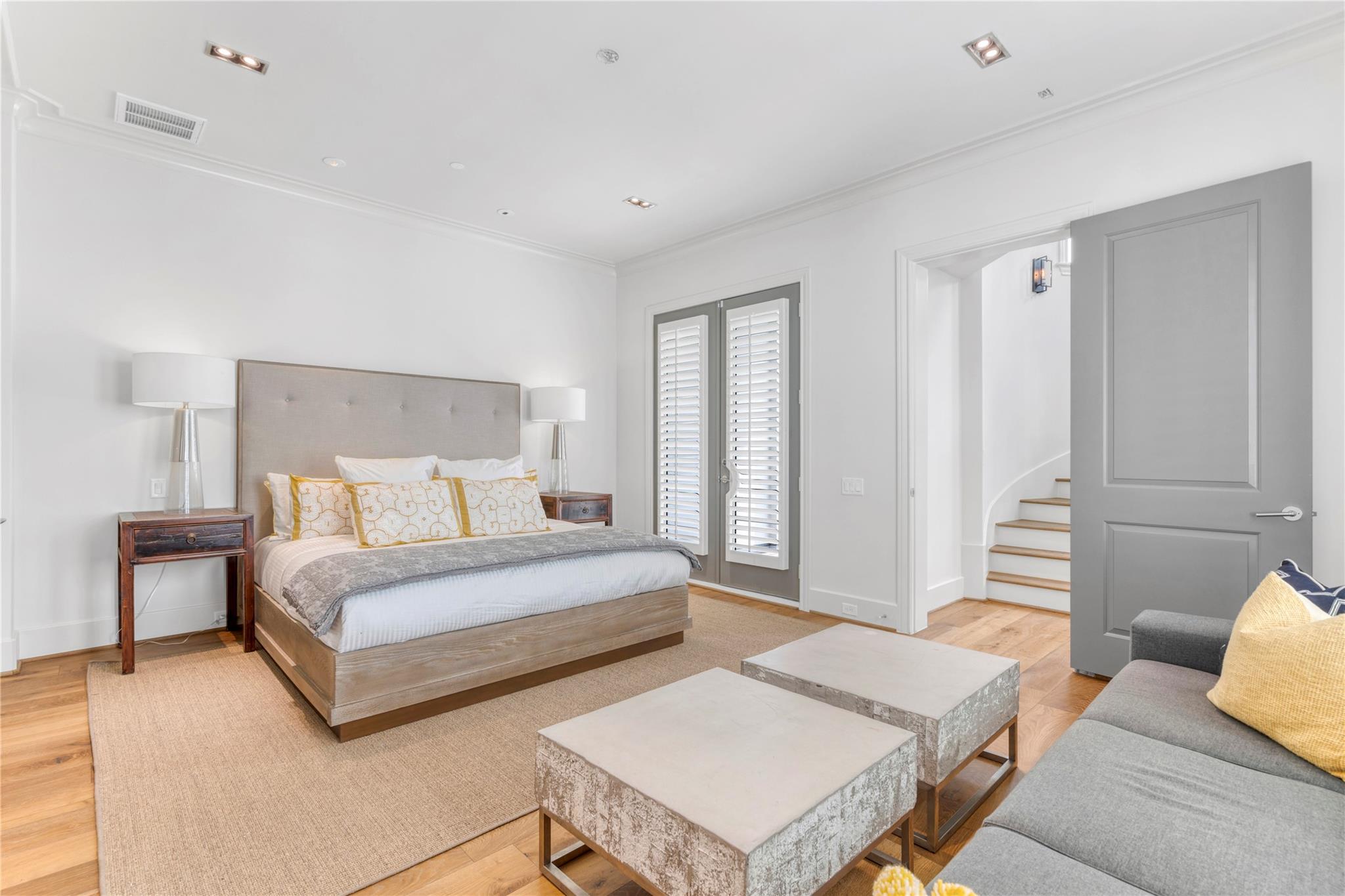 Fabulous home offering a luxury lock & leave lifestyle in the guard gated community of Caceres. The huge roof top terrace is designed for entertaining & has an incredible view of the Downtown skyline. Be wowed from the moment you walk through the wrought iron front door with the most beautiful free floating curved staircase you have ever seen. The chef's kitchen features Woodmode by Brookhaven furniture grade cabinets with high end Miele appliances & marble countertops. The luxurious primary suit encompasses a whole floor & includes a luxurious bath with marble flooring & countertops, double vanities, large jetted tub with a separate shower & 2 walk-in closets. Wood flooring & plantation shutters through out with an installed elevator to all levels. Fabulous location within walking distance to Memorial Park, minutes to fine shopping & dining & a short commute to Downtown, the community also offers a resort style pool, plenty of green space, & a central plaza with a beautiful fountain.