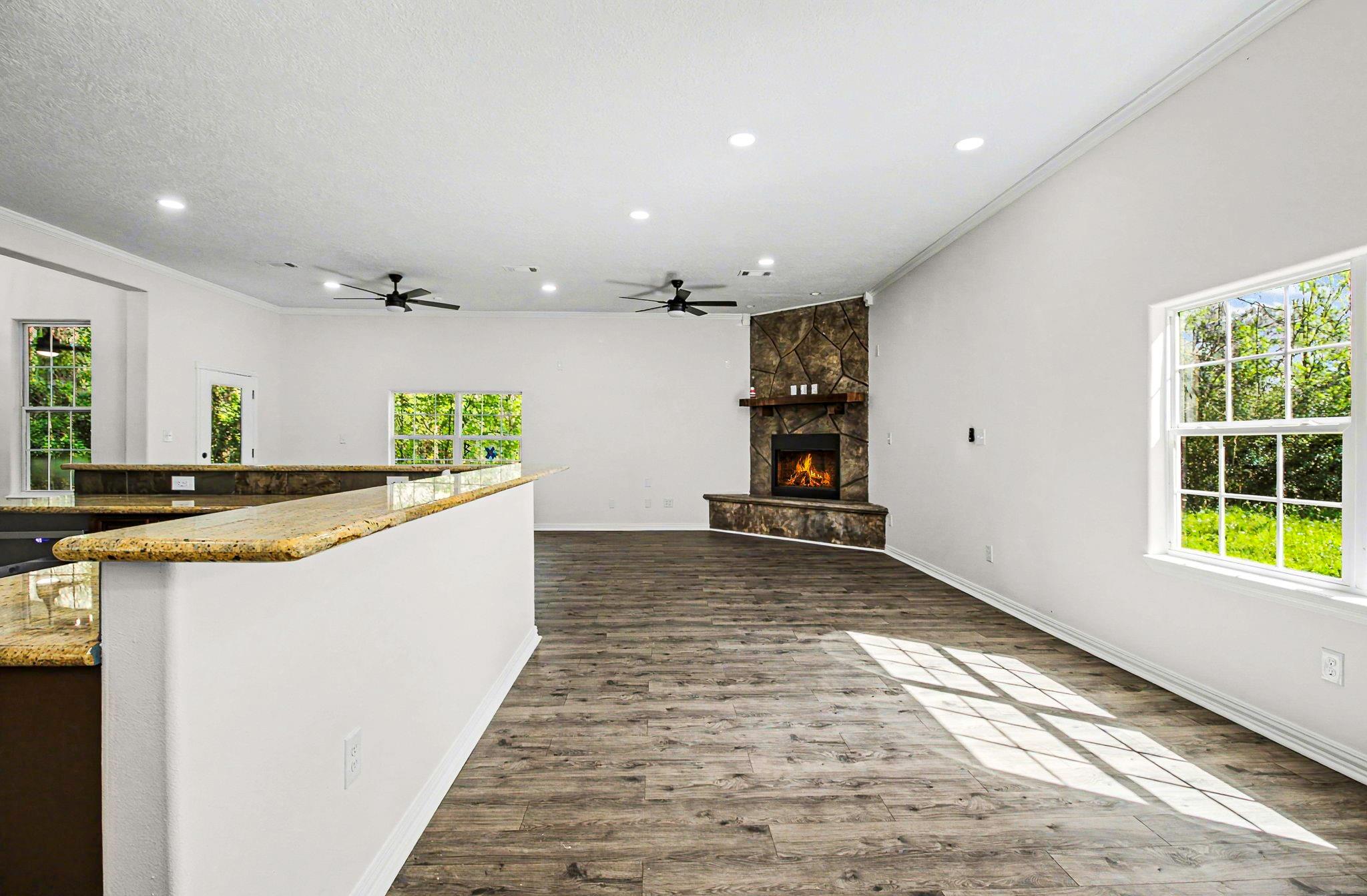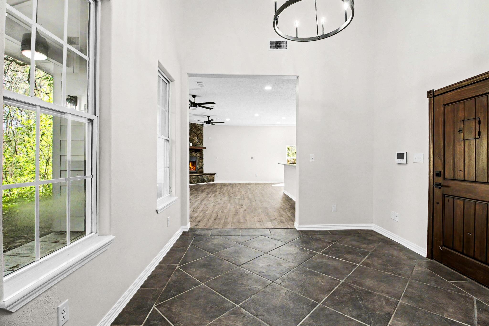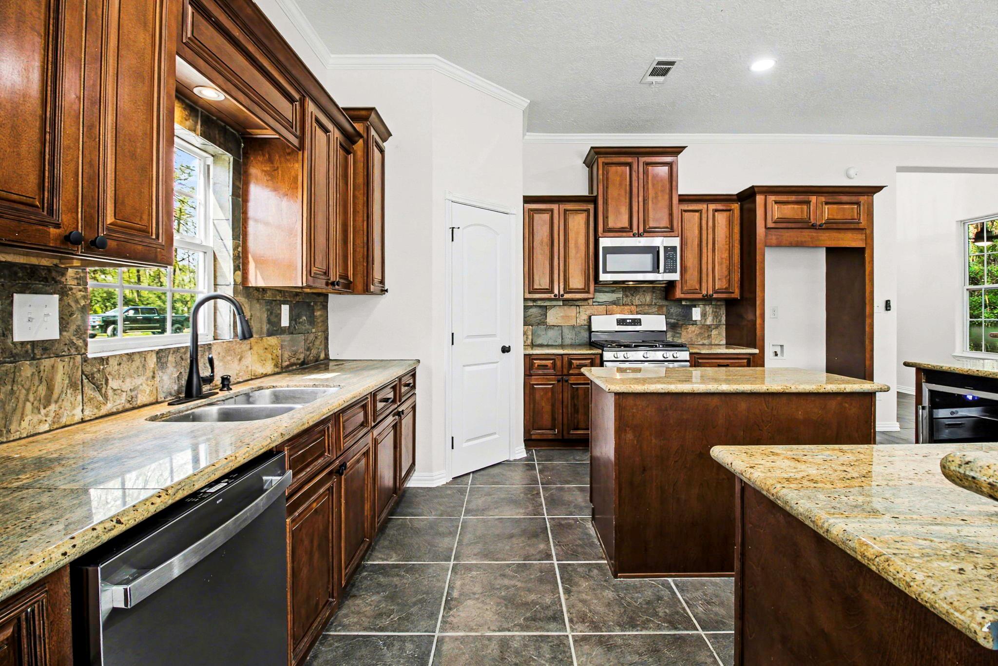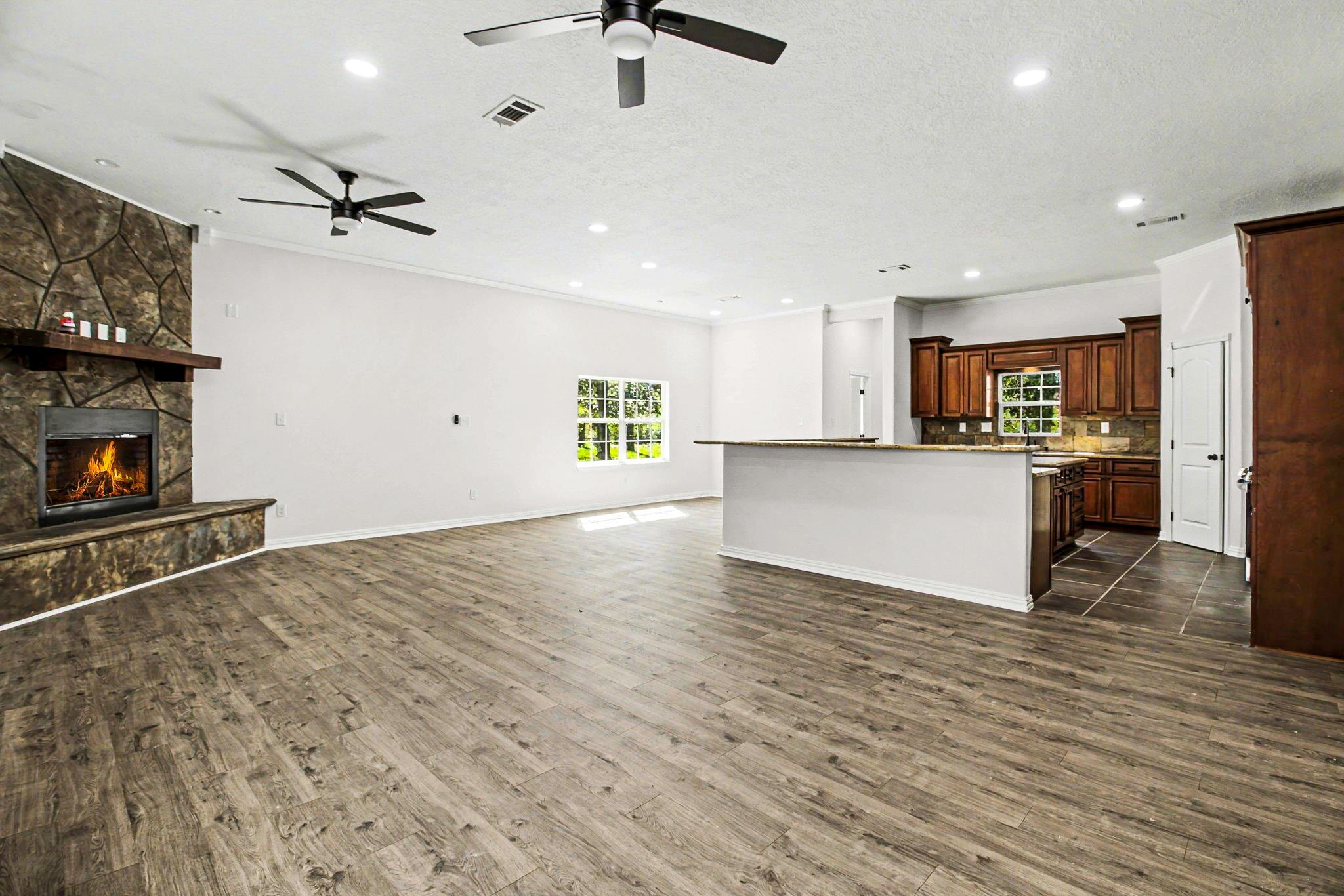 This Home is a Showplace on 5.75 Acres with Pond and Creek! Stone Archway welcomes you to Impressive 14' Entry Foyer. Inviting Ranch Style Open Concept Living. Huge Family Room w/Crown Molding, Stone Corner Fireplace. Massive Island Kitchen featuring Wrap Around Breakfast Bar, Gorgeous Custom Cabinetry with Granite Countertops, Stainless Appliances, GE Gas Range, New Fixtures, Abundant Cabinetry Storage, Counter Work Space and Walk-In Pantry. Designed for Entertaining and Family Living. Primary Ensuite has French Doors to Private Patio, Huge Walk-In Closet, Bonus/Flex Room ideal for Office-Nursery-or 4th Bedroom - Primary Bath features Double Vanities, Jetted Tub, Glass-Tile Shower. Private Drive and Wooded Acreage for Privacy with your Own Pond for Fishing or Sitting to Enjoy. Creek runs thru Property. Just 5 Minutes to Livingston Shopping, Restaurants.