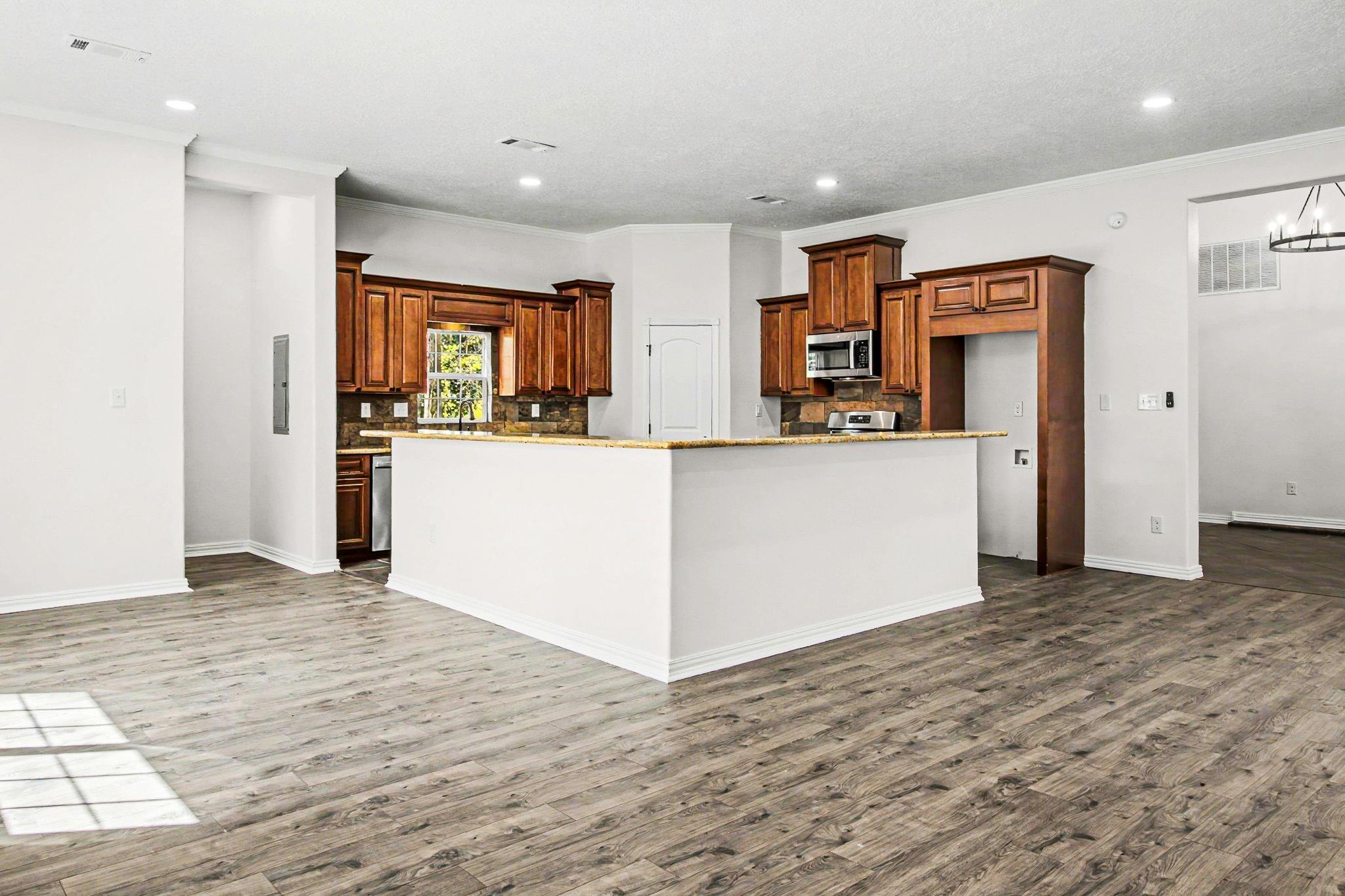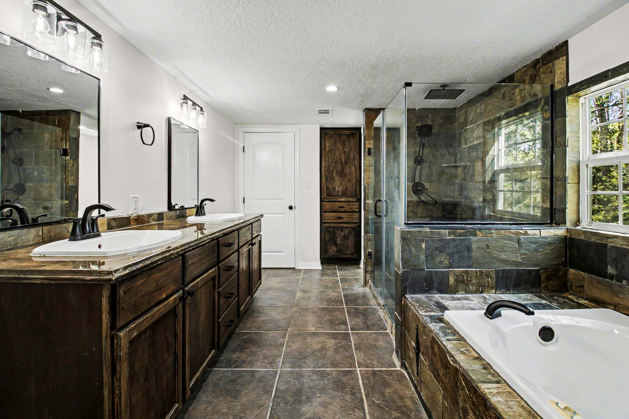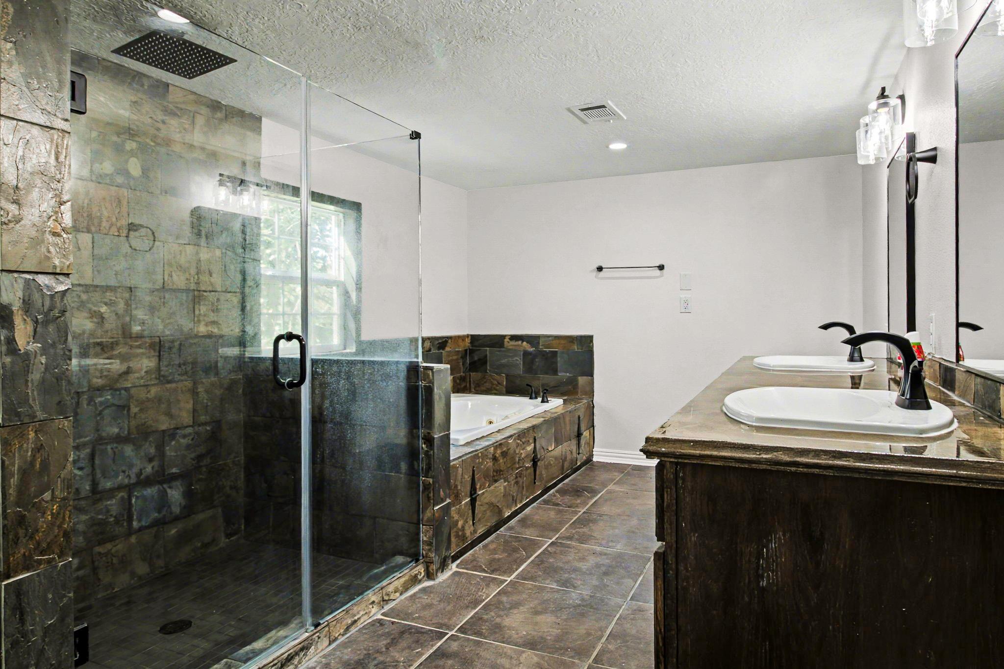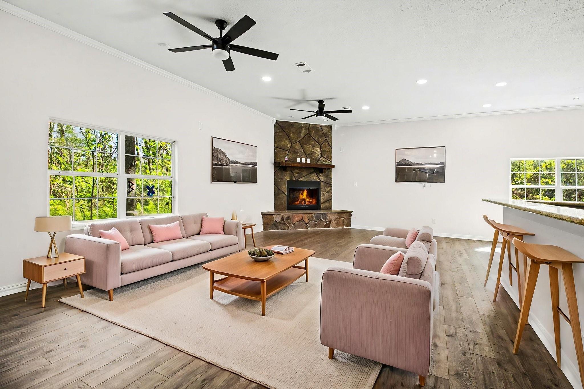 This Home is a Showplace on 5.75 Acres with Pond and Creek! Stone Archway welcomes you to Impressive 14' Entry Foyer. Inviting Ranch Style Open Concept Living. Huge Family Room w/Crown Molding, Stone Corner Fireplace. Massive Island Kitchen featuring Wrap Around Breakfast Bar, Gorgeous Custom Cabinetry with Granite Countertops, Stainless Appliances, GE Gas Range, New Fixtures, Abundant Cabinetry Storage, Counter Work Space and Walk-In Pantry. Designed for Entertaining and Family Living. Primary Ensuite has French Doors to Private Patio, Huge Walk-In Closet, Bonus/Flex Room ideal for Office-Nursery-or 4th Bedroom - Primary Bath features Double Vanities, Jetted Tub, Glass-Tile Shower. Private Drive and Wooded Acreage for Privacy with your Own Pond for Fishing or Sitting to Enjoy. Creek runs thru Property. Just 5 Minutes to Livingston Shopping, Restaurants.