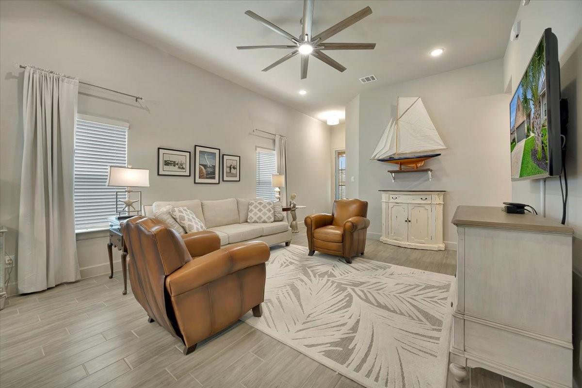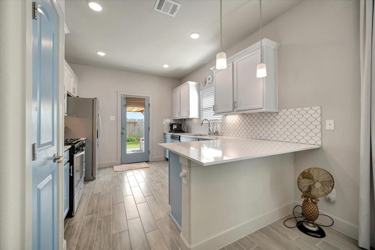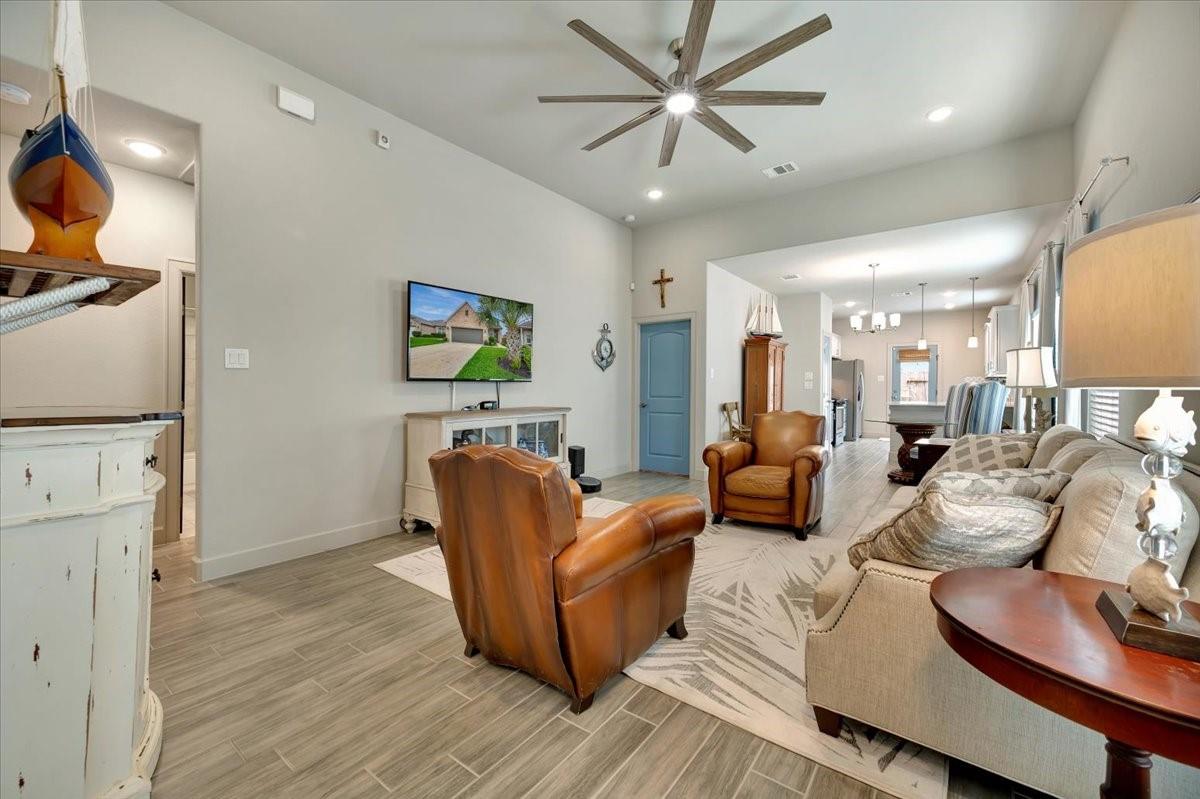 Gorgeously updated and like new, this charming 4-bedroom home is move-in ready! Built in 2019, the seller has enhanced the property with gutters, added kitchen cabinetry, ceiling fans in all bedrooms, and a beautiful pergola with an extended backyard patio—perfect for outdoor entertaining. The gourmet kitchen opens to the spacious family room and features custom cabinetry, under-cabinet lighting, and LED can lighting. Additional highlights include 11-ft ceilings throughout, 5¼" baseboards, 2" faux wood blinds, and a tankless water heater. Refrigerator included. Schedule your private showing today