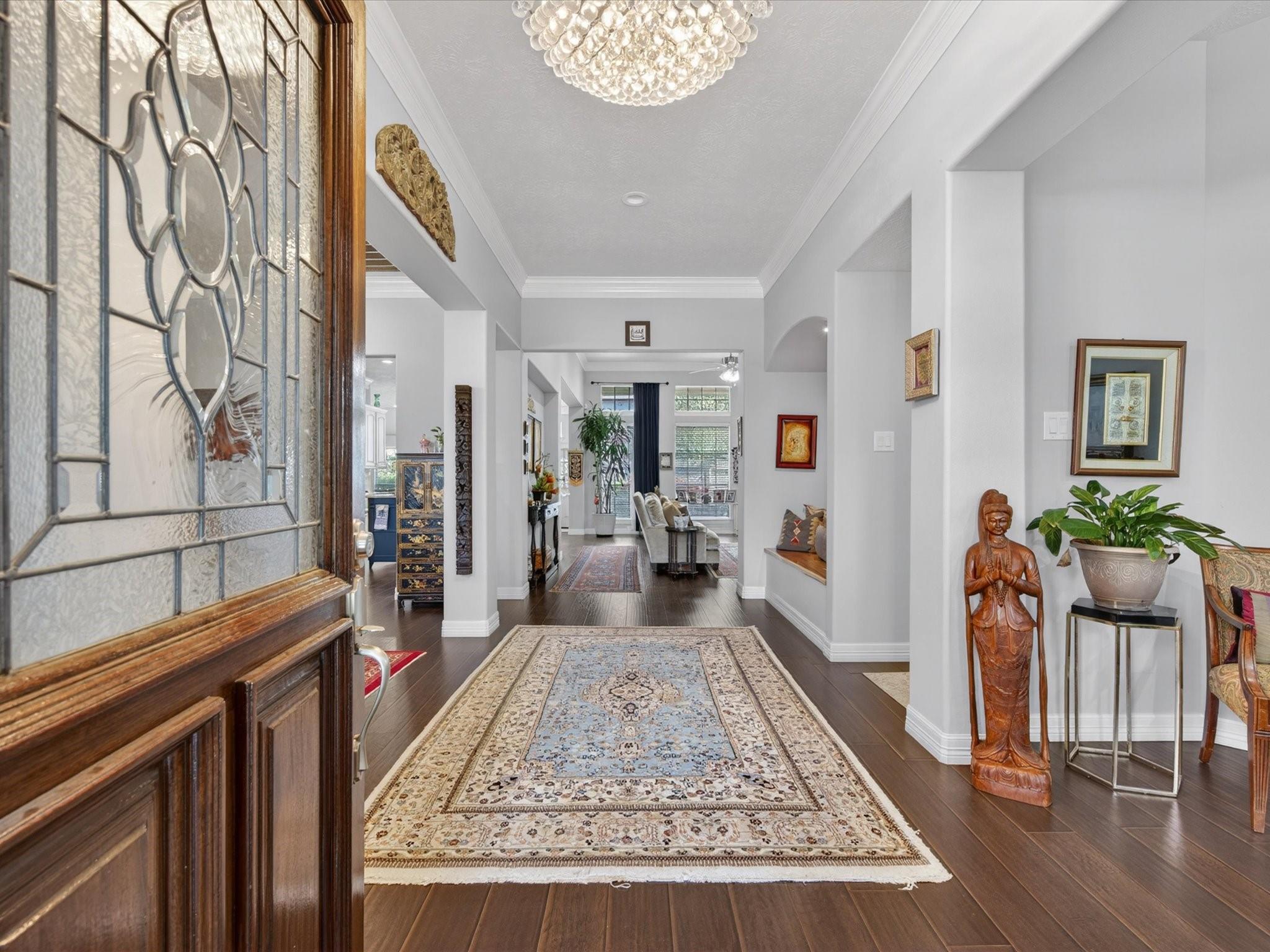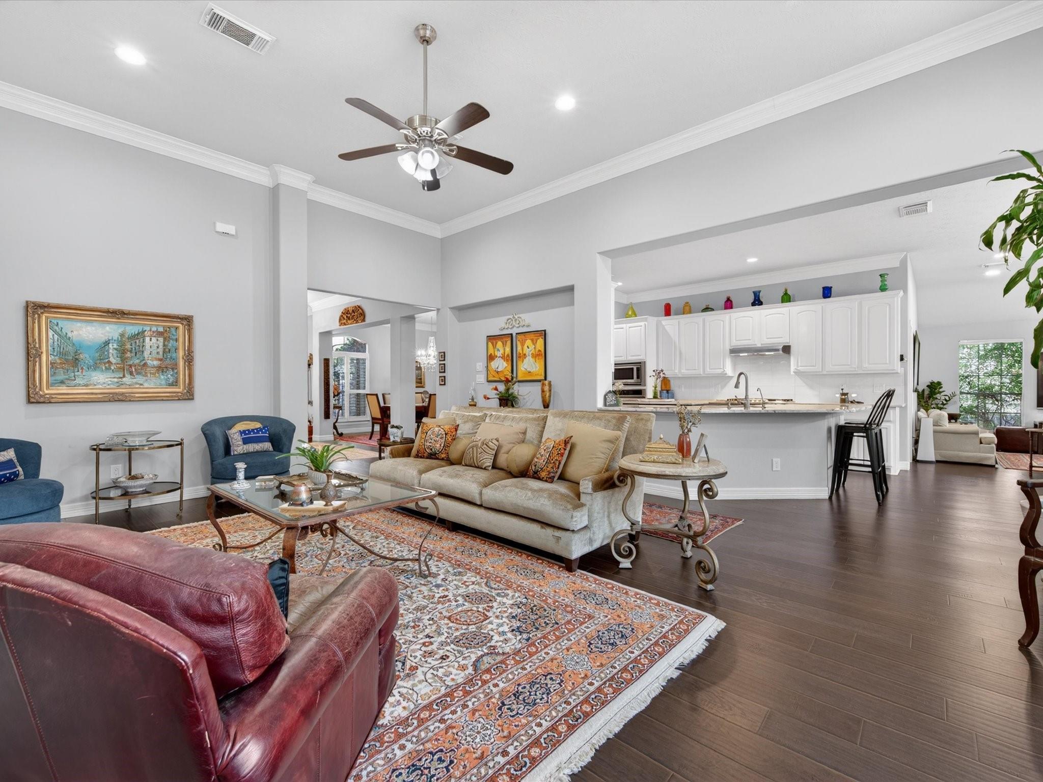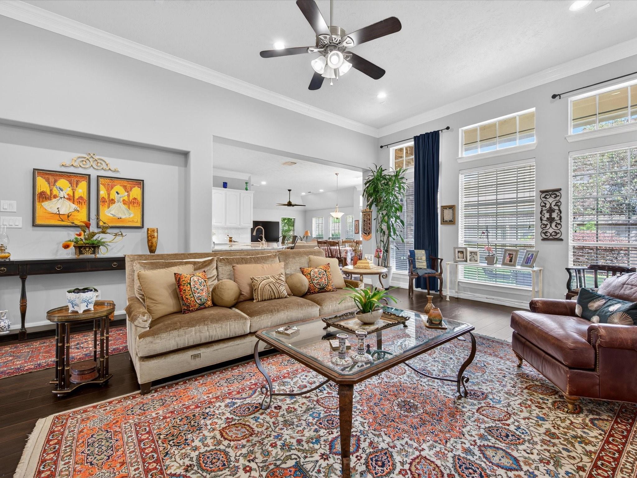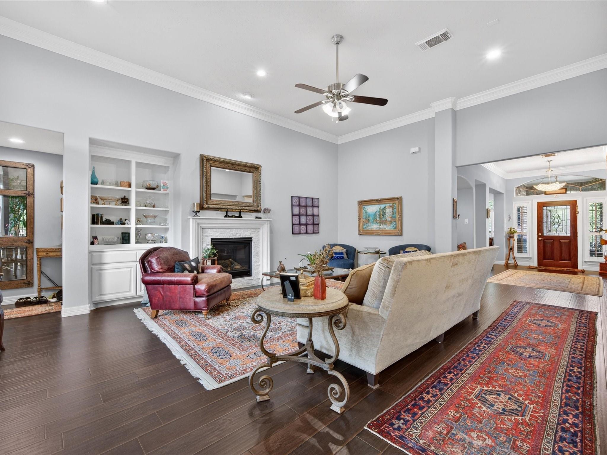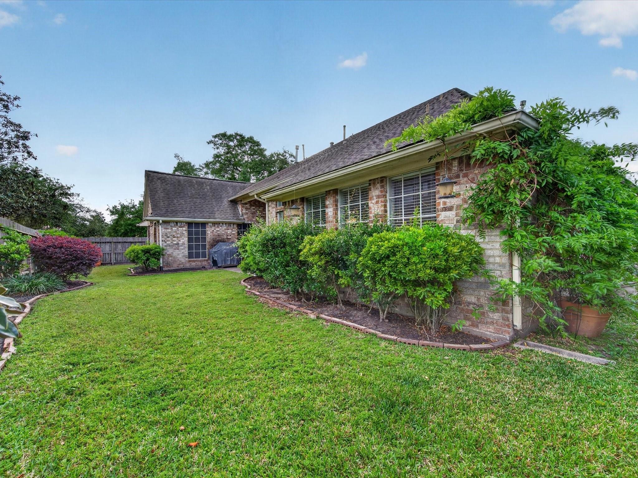Perfectly nestled on a corner cul-de-sac lot in Champions Forest, this beautifully updated one-story home blends style & comfort. Offering 4 BDRM, 3 FULL BTH, & 3247 SQFT of thoughtfully crafted updates! Be welcomed through a beautiful leaded glass front door; into a light-filled interior with soaring ceilings, crown molding, engineered hardwood & decorative niches throughout. The expansive floorplan provides flexibility while the spacious primary retreat features a luxurious en-suite w/ jetted tub, walk-in shower, dual sinks, generous storage, & expansive walk-in closet. The kitchen is a chef’s dream featuring a 5-burner gas cooktop, stainless steel appliances, & gleaming granite countertops, all seamlessly opening to the living area w/ cozy gas-log fireplace. Additional highlights include window shutters, private courtyard entry, covered patio, generator hookup, & 3-car tandem garage with extended space (2020). Experience refined living —schedule your private showing today!