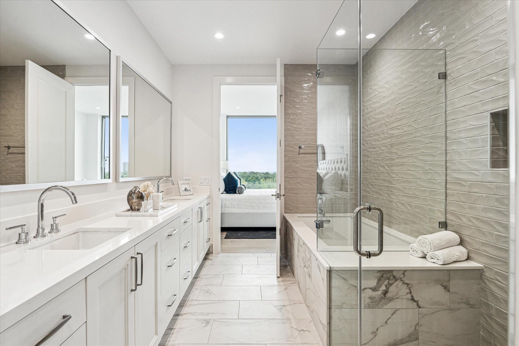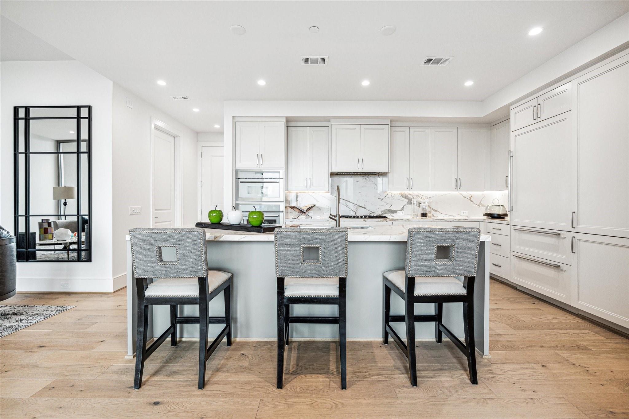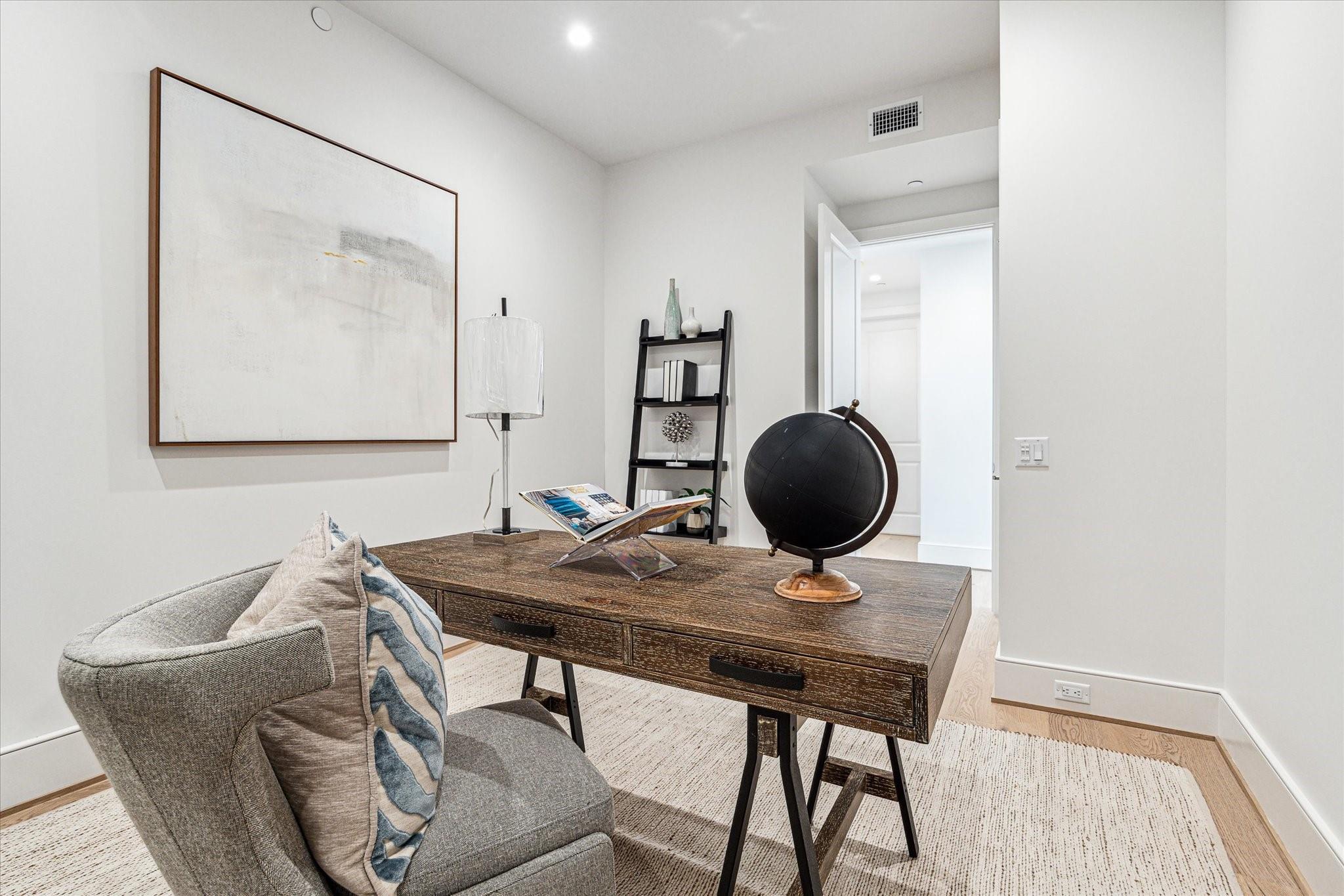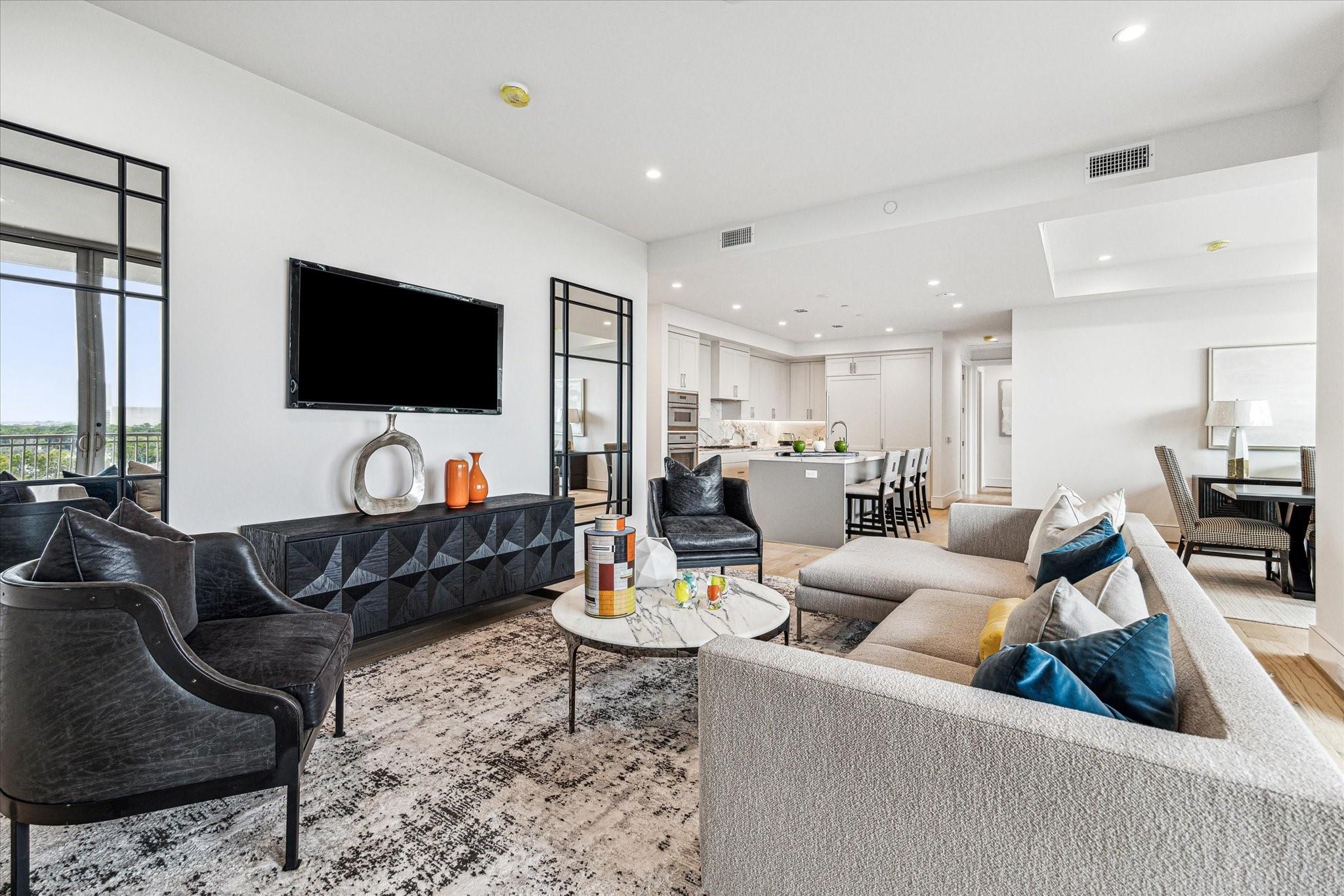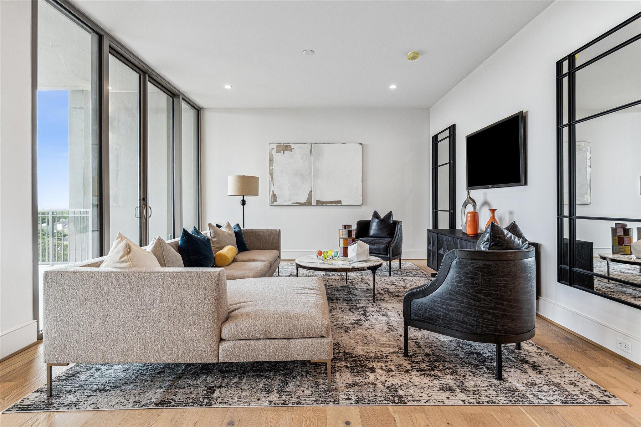 A sophisticated 2-bedrooom, 3-bathroom and a study condominium nestled within an upscale Houston high-rise, offering unparalleled sophistication & comfort. It exudes elegance with exquisite designer touches throughout, including chick interiors & exclusive outdoor spaces. Step inside & enjoy 10-foot ceilings, floor-to-ceiling windows & wide-plank flooring. Spacious living & dining areas seamlessly transition onto a generous terrace, ideal for relaxation & entertainment. Gourmet kitchen is culinary haven, boasting sleek cabinetry and top-of-the-line appliances. Enjoy exceptional amenities, such as state-of-the-art gym, chic lounges, guest accommodations, pet-friendly area, storage options & resort-style pool with cabanas. Close proximity to premier shopping, dining & entertainment destinations including Uptown Park, River Oaks district & the Galleria.