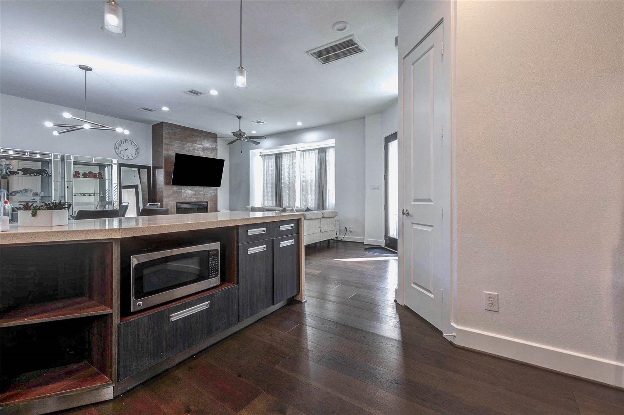 InteriorFireplace:1/Gaslog FireplaceFloors:Tile,Travertine,WoodCountertop:QuartzBathroom Description:Half Bath,Primary Bath: Double Sinks,Primary Bath: Jetted Tub,Primary Bath: Separate Shower,Secondary Bath(s): Shower Only,Secondary Bath(s): Tub/Shower ComboBedroom Desc:1 Bedroom Down - Not Primary BR,En-Suite Bath,Primary Bed - 3rd Floor,Walk-In ClosetKitchen Desc:Breakfast Bar,Kitchen open to Family Room,Pantry,Soft Closing Cabinets,Soft Closing Drawers,Under Cabinet LightingRoom Description:1 Living Area,Family Room,Kitchen/Dining Combo,Living Area - 2nd Floor,Living/Dining Combo,Utility Room in HouseHeating:Central GasCooling:Central ElectricDishwasher:YesDisposal:YesCompactor:NoMicrowave:YesRange:Gas RangeOven:Gas OvenIce Maker:NoAppliances:Dryer Included,Full Size,Refrigerator,Washer IncludedEnergy Feature:Ceiling Fans,Digital Program Thermostat,Insulated/Low-E windows,Solar PV Electric PanelsInterior:Balcony,Fire/Smoke Alarm,High Ceiling,Refrigerator Included