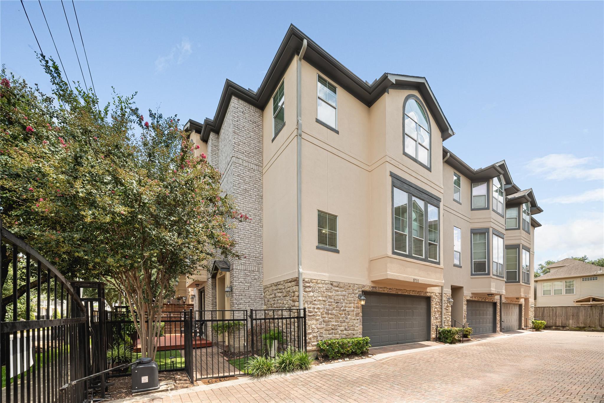 Welcome to this beautifully maintained corner unit townhome in the heart of gated Cottage Grove, just minutes from The Heights, downtown, and Memorial Park. This rare find offers a private front patio oasis with raised deck—perfect for entertaining or relaxing with friends and family. Inside, all bedrooms feature en-suite baths and walk-in closets. The first-floor suite with patio access is ideal for guests, roommates, or multi-generational living. Upstairs, enjoy an open-concept living and dining space with engineered hardwood floors. The extra-large garage easily fits a full-size truck with room to spare. Recent foundation repair with transferable warranty, hurricane/tornado proof roof installed in 2024 with transferable warranty, and all new appliances stay! Just pack your bags and move in today! Walk to nearby parks, trails, and restaurants with unbeatable access to major highways, the Energy Corridor, and revamped Memorial Park. This home blends location, lifestyle, and comfort!