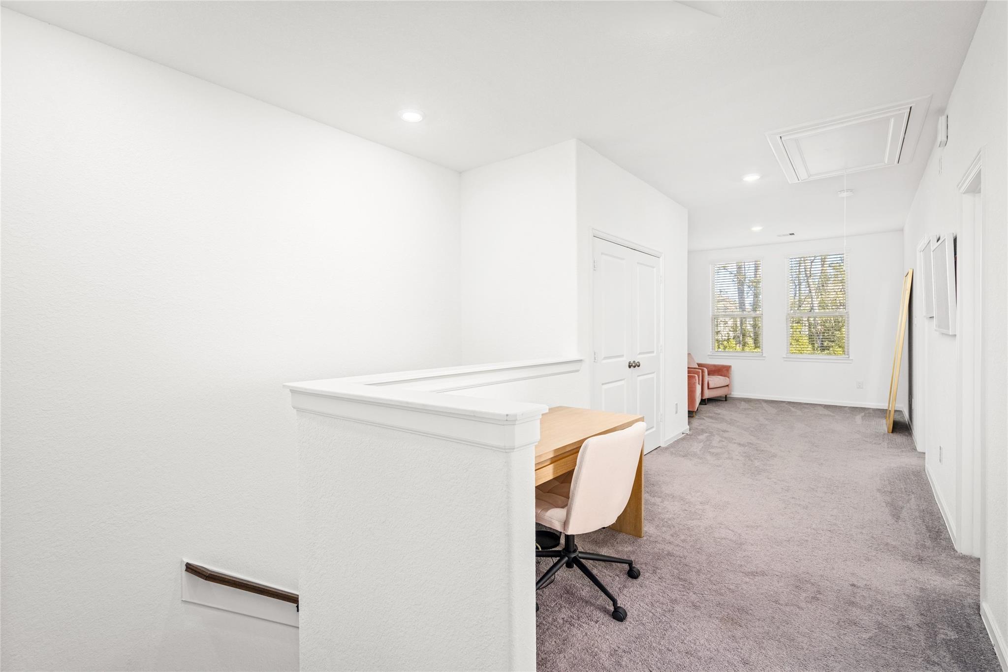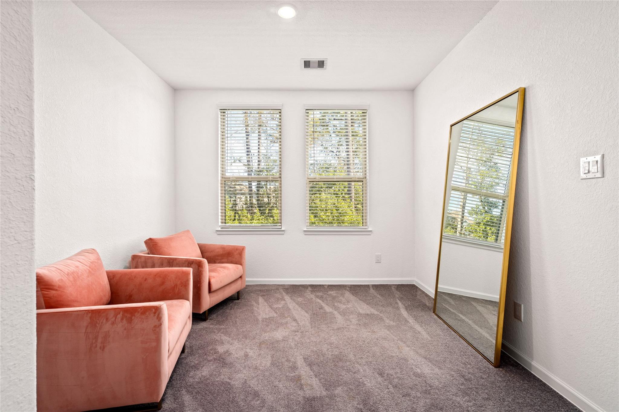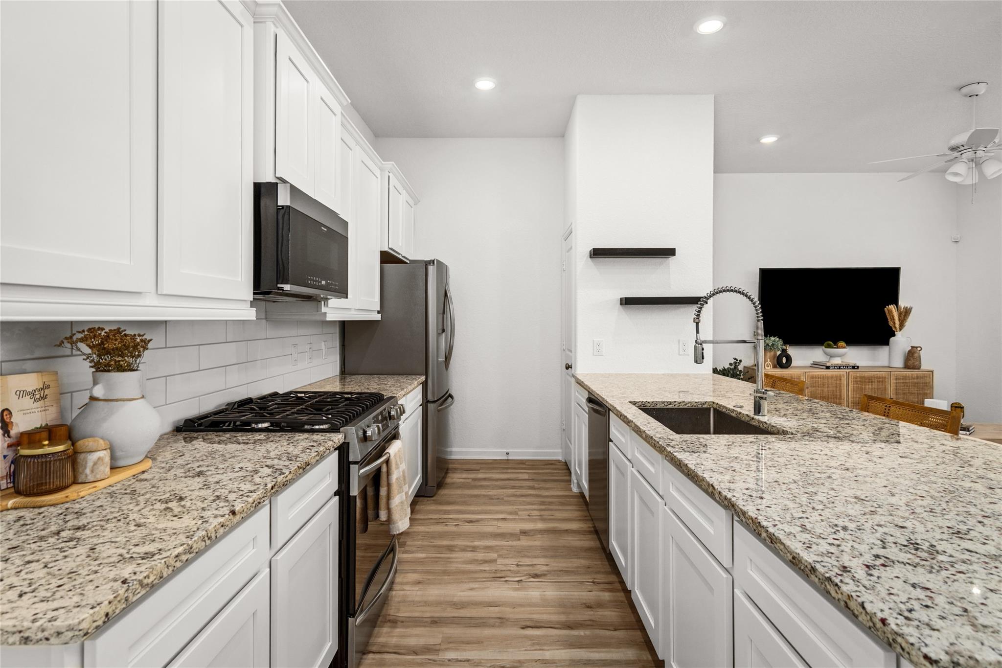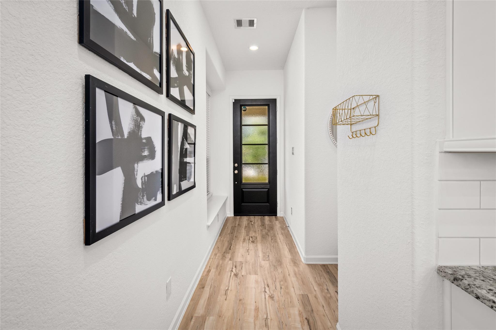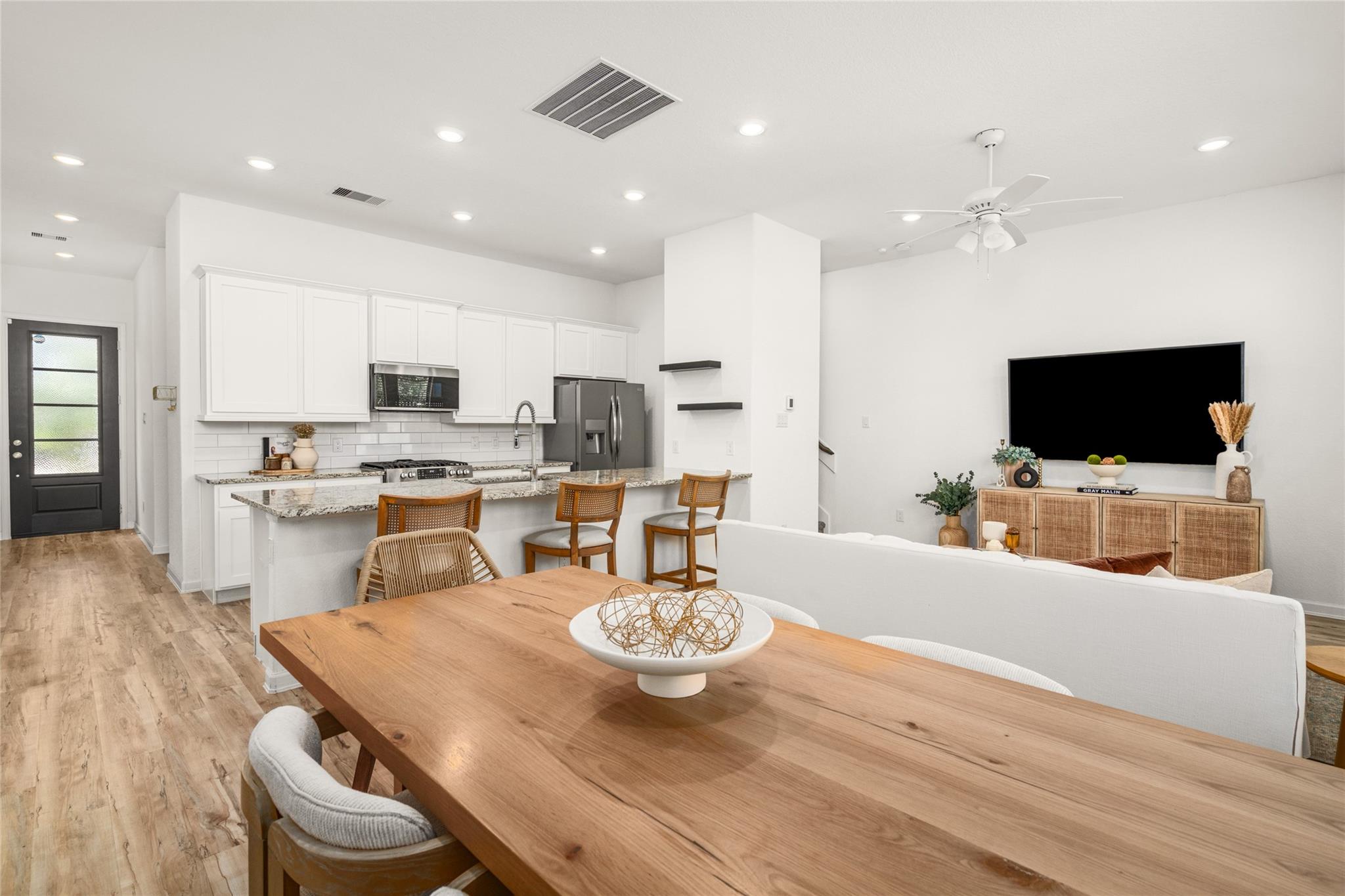 Well-maintained 3-bedroom 2.5-bathroom home on a private greenbelt lot with no back neighbors in the desirable master planned community of Grand Central Park. The open floor plan is filled with natural light and features natural vinyl plank flooring throughout the main living areas. The kitchen offers a large peninsula island, granite countertops, under-cabinet lighting, stainless steel appliances, and a 5-burner gas range. A wall of windows highlights the family room and overlooks the spacious fenced backyard. Upstairs features a large open flex space ideal for a home office, playroom, or additional living area. The primary suite features vaulted ceilings, abundant natural light, and an en-suite bath with an expansive countertop, a subway-tiled shower, and a large walk-in closet. Community amenities include a resort-style pool, fitness center with lake views, fishing lakes, parks, playgrounds, and a dog park.