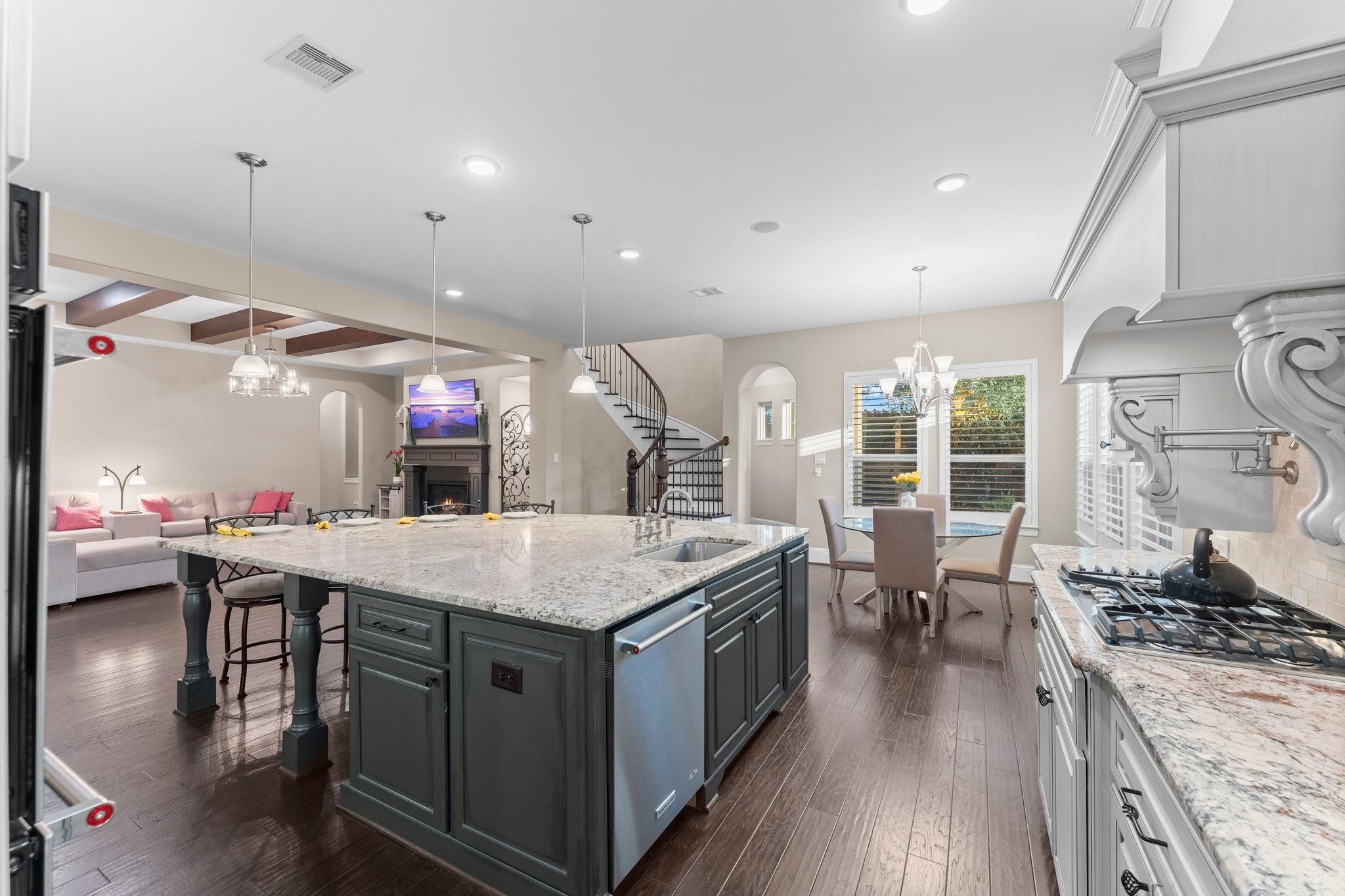 InteriorFireplace:1/Gaslog FireplaceFloors:Carpet,Engineered Wood,TileCountertop:GRANITEBathroom Description:Half Bath,Primary Bath: Double Sinks,Primary Bath: Jetted Tub,Primary Bath: Separate Shower,Secondary Bath(s): Tub/Shower Combo,Vanity AreaBedroom Desc:1 Bedroom Up,All Bedrooms Down,En-Suite Bath,Primary Bed - 1st Floor,Sitting Area,Split Plan,Walk-In ClosetKitchen Desc:Island w/o Cooktop,Kitchen open to Family Room,Pantry,Pot Filler,Soft Closing Cabinets,Soft Closing Drawers,Under Cabinet Lighting,Walk-in PantryRoom Description:1 Living Area,Breakfast Room,Entry,Formal Dining,Gameroom Up,Home Office/Study,Kitchen/Dining Combo,Media,Utility Room in House,Wine RoomHeating:Central GasCooling:Central ElectricConnections:Electric Dryer Connections,Gas Dryer Connections,Washer ConnectionsDishwasher:YesDisposal:YesMicrowave:YesRange:Gas CooktopOven:Gas OvenEnergy Feature:Attic Vents,Ceiling Fans,Digital Program Thermostat,Energy Star Appliances,Generator,High-Efficiency HVAC,Insulated DoorsInterior:Alarm System - Owned,Crown Molding,Dry Bar,Fire/Smoke Alarm,Formal Entry/Foyer,High Ceiling,Spa/Hot Tub,Window Coverings,Wired for Sound