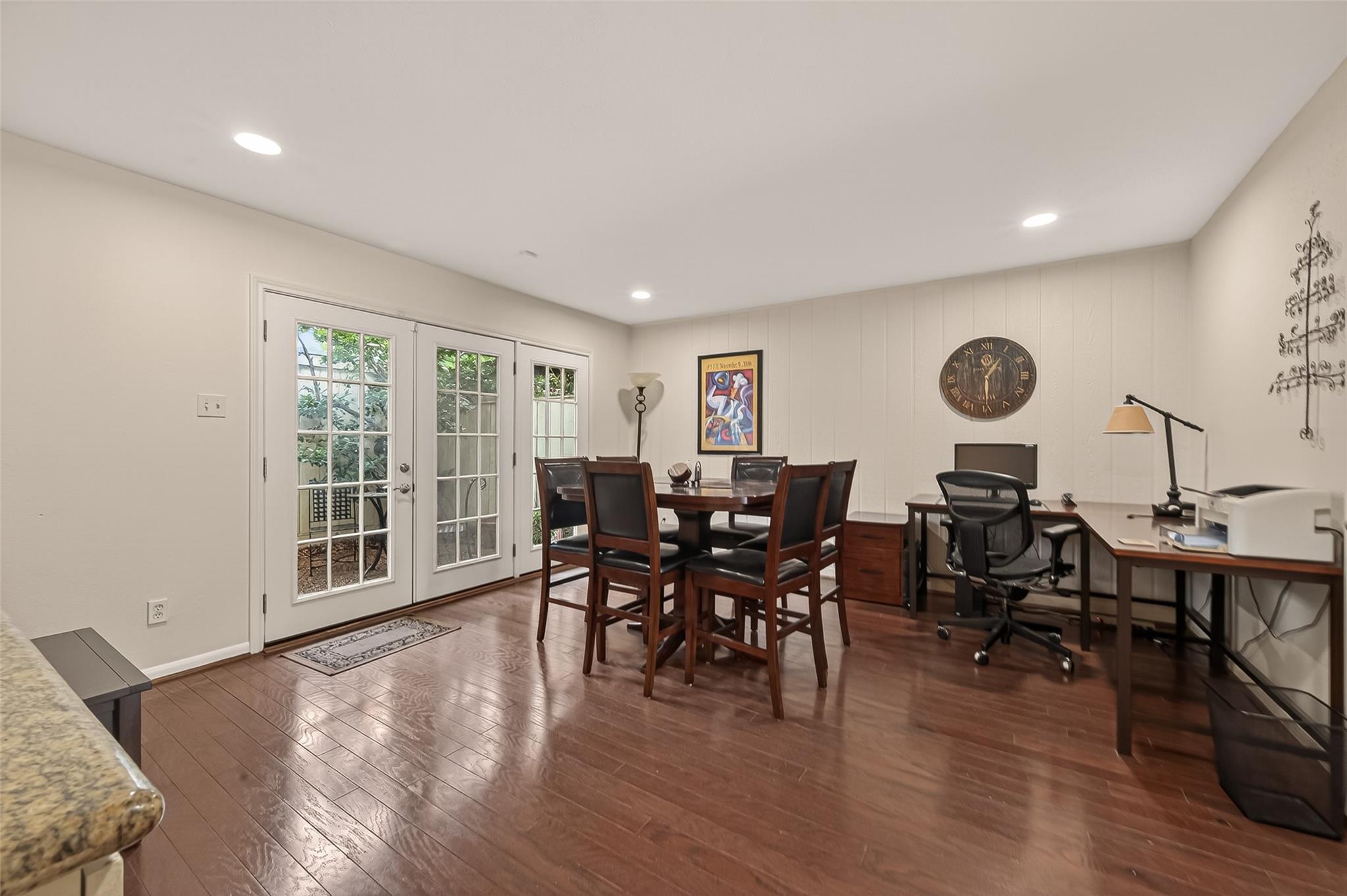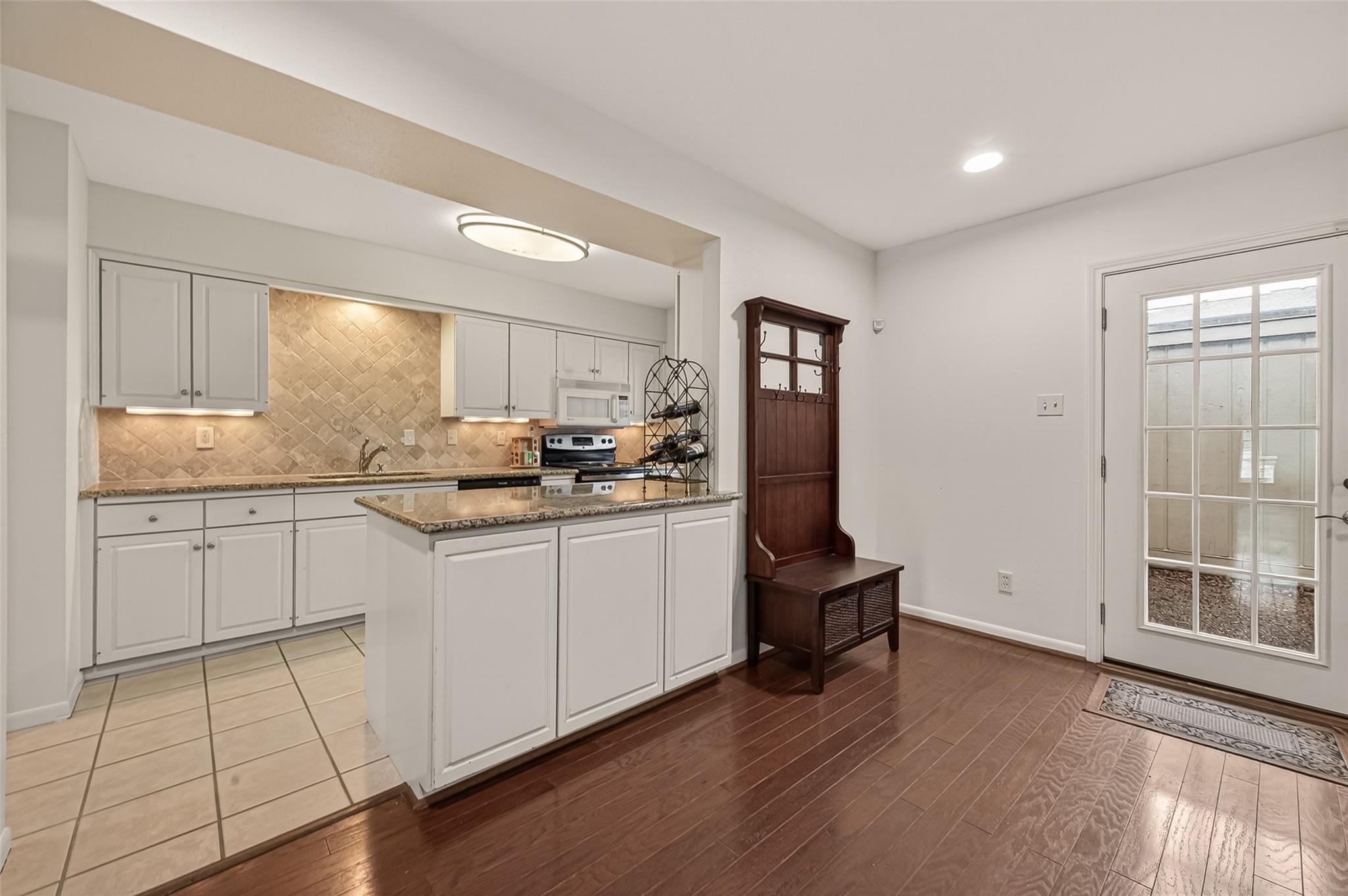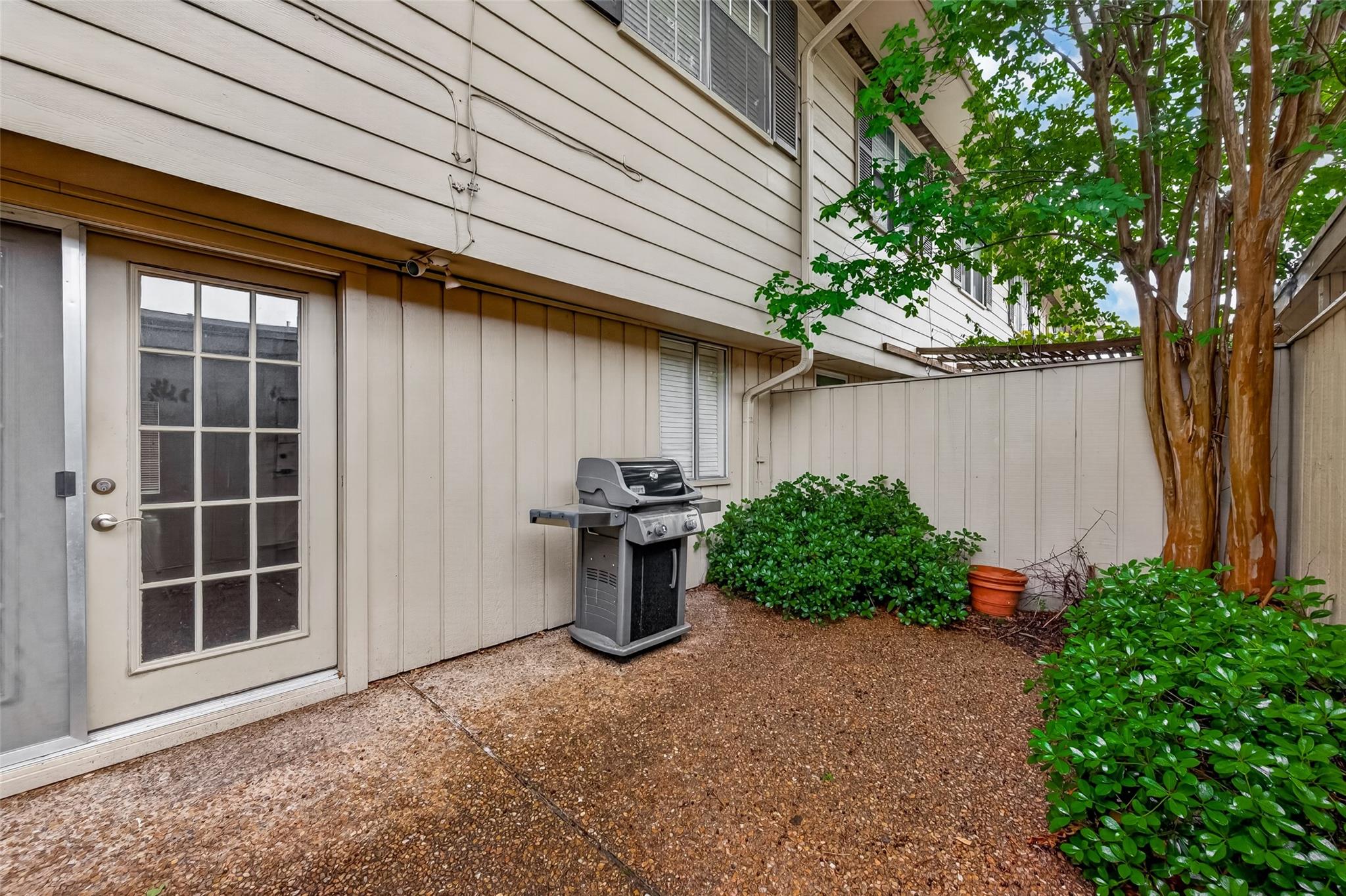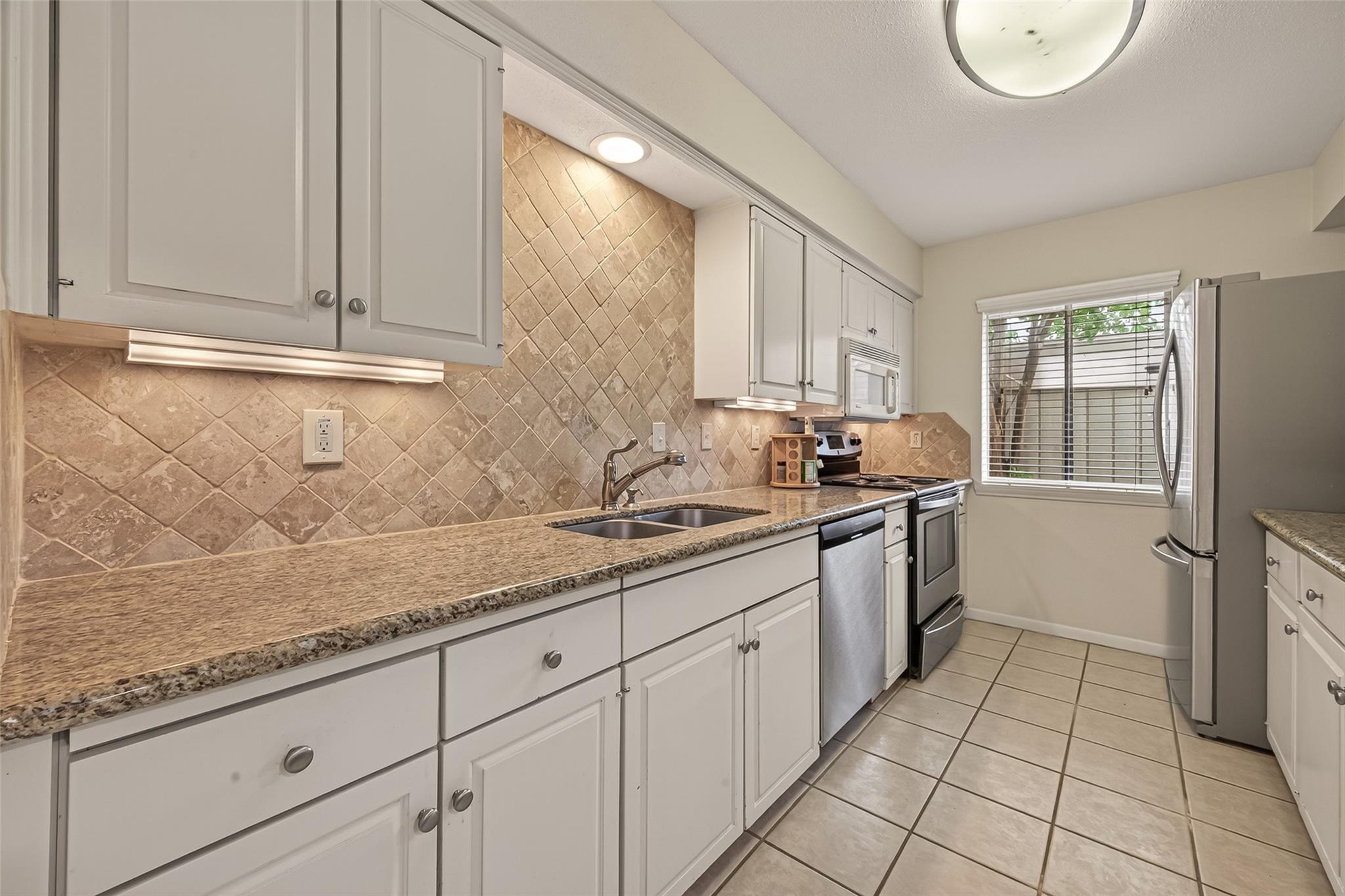 Located in the Tanglewest community (Tanglewood area), this well-maintained & thoughtfully updated townhome features a functional layout w/first floor living areas. The entry opens to a bright Living Room w/ engineered hardwood floors, recessed lighting, & an east-facing window. Dining or casual living area opens to the Kitchen & includes a paneled accent wall w/access to the patio & covered carport. Galley-style kitchen standouts include granite countertops, stainless undermount sink, tumbled marble backsplash, ample cabinetry, and a walk-in pantry. Refrigerator included. Upstairs, the spacious Primary Suite features double-door entry, large walk-in closet, & en suite bath. Two secondary bedrooms share a hall bath, w/one offering built-in cabinetry & views of the patio. Additional highlights include full-size utility closet, under-stair storage, & first floor powder bath. Conveniently located near the swimming pool & playground w/easy access to shopping, dining, & major thoroughfares.
