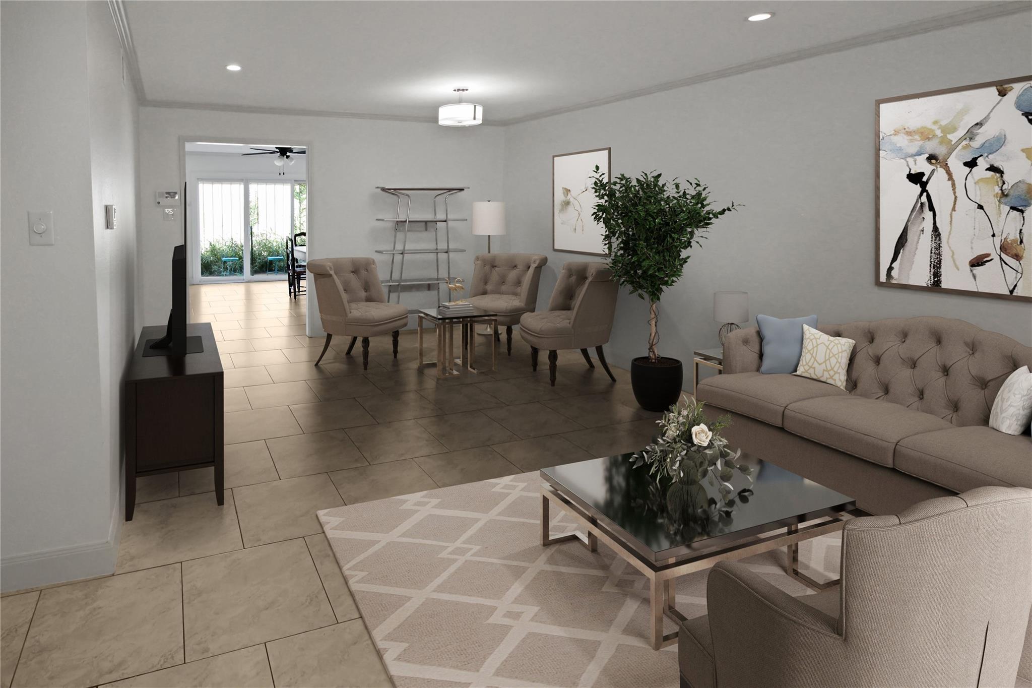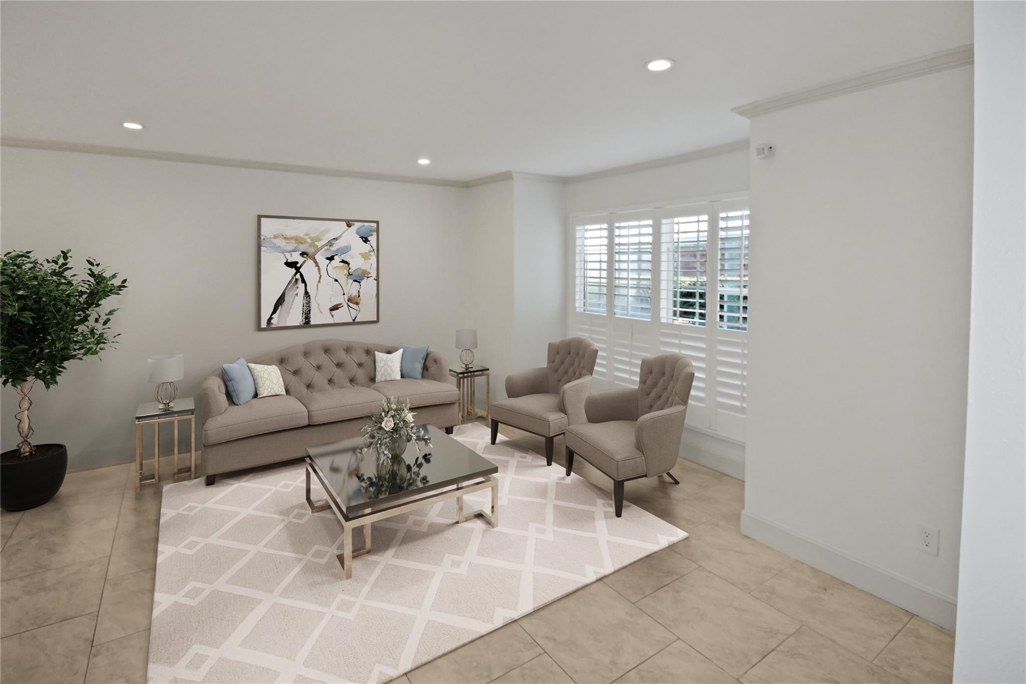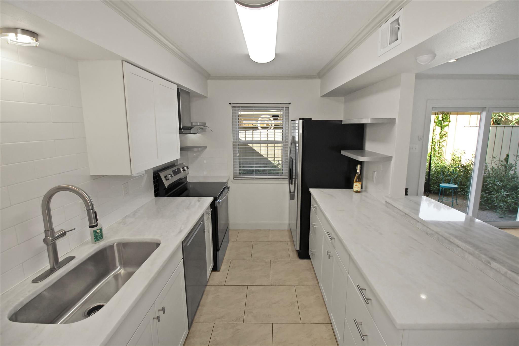 Move-in ready townhome overlooking a charming courtyard and park in the desirable Tanglewest subdivision! This 3-bedroom, 2.5-bath home features an open floor plan with spacious living and dining areas plus a versatile den. Fresh interior paint and warm, neutral flooring enhance the inviting feel. The kitchen shines with quartz countertops, a brand-new electric stove, full-size pantry, and all appliances included—refrigerator, washer, and dryer convey. Quartz countertops extend into the bathrooms for a clean, modern look. The oversized primary suite offers a seamless glass shower. Enjoy a beautifully landscaped private patio with a custom double-pane sliding door. Upgrades include a tankless water heater, ceiling fans, double-pane windows, plantation shutters, and recessed lighting. Low-maintenance living with convenient access to the Galleria, shopping, YMCA, and major highways—an exceptional opportunity in a prime location.