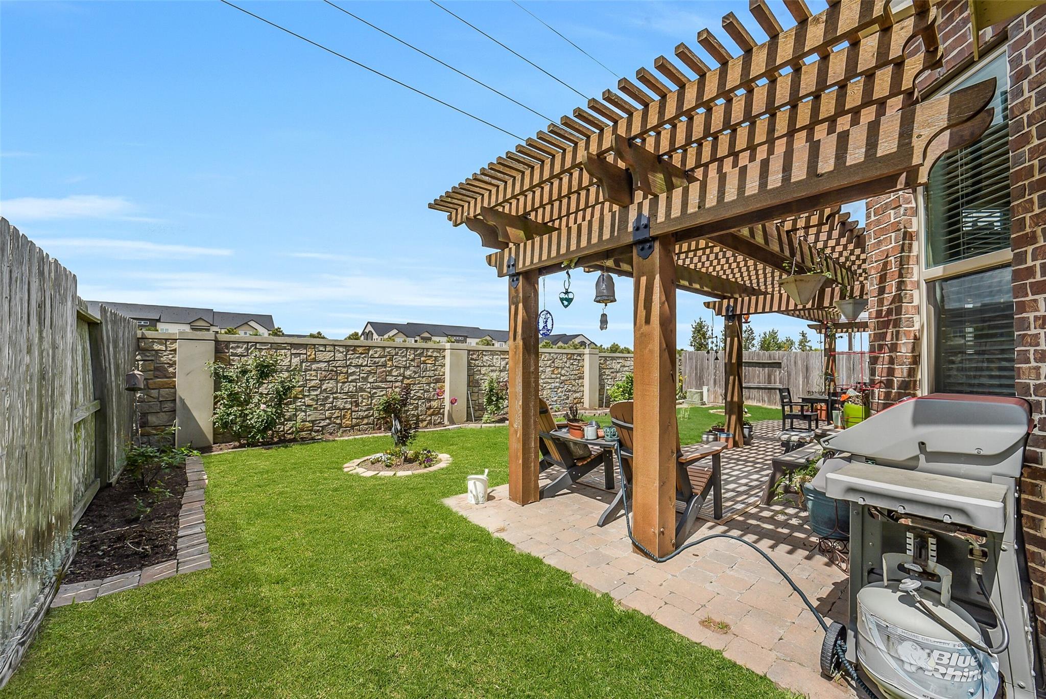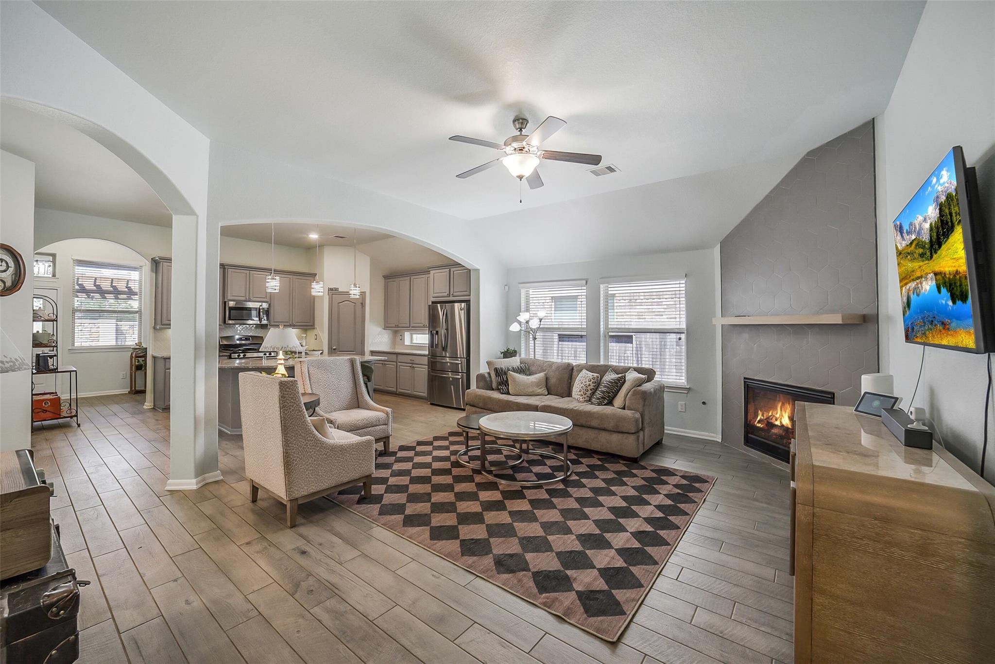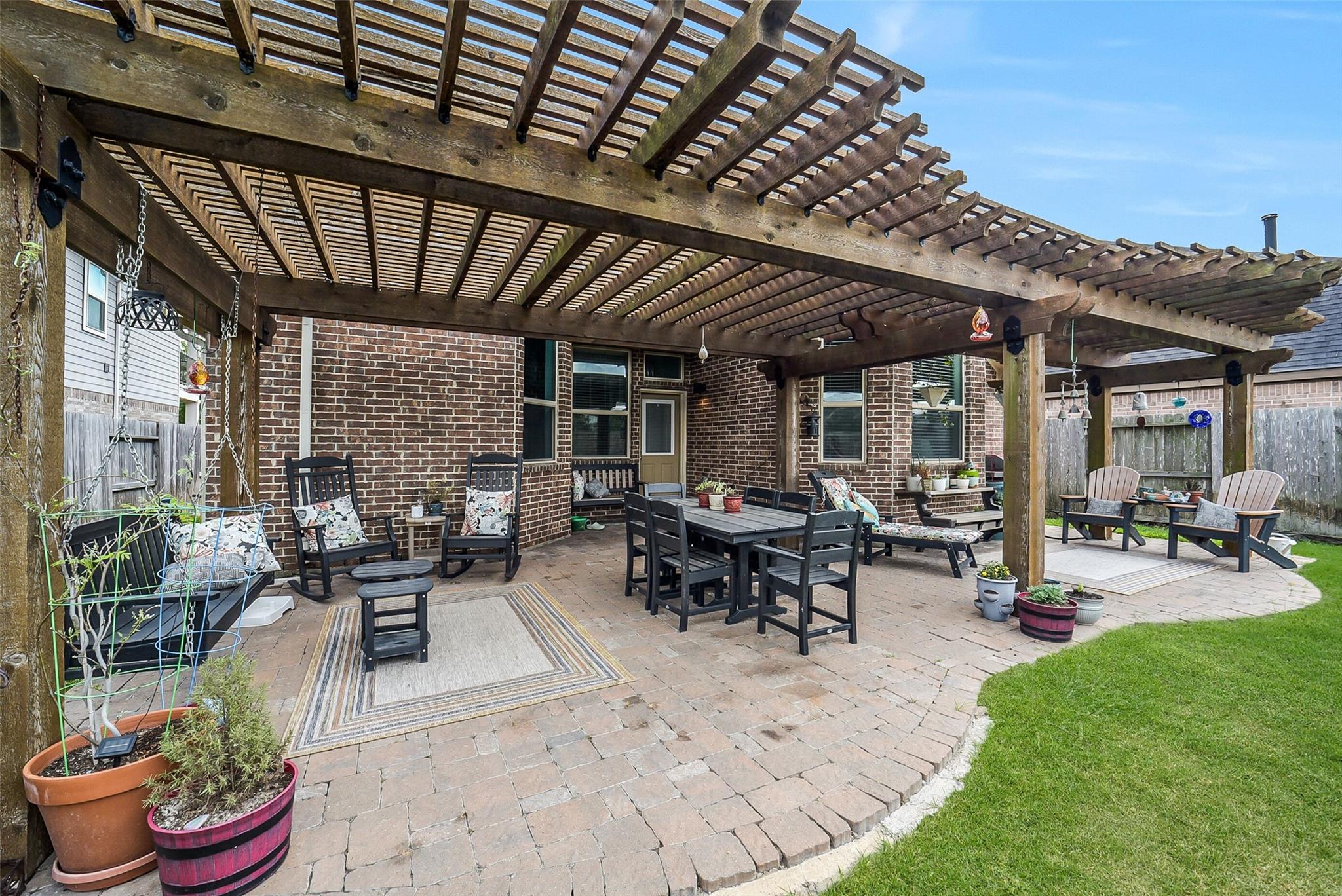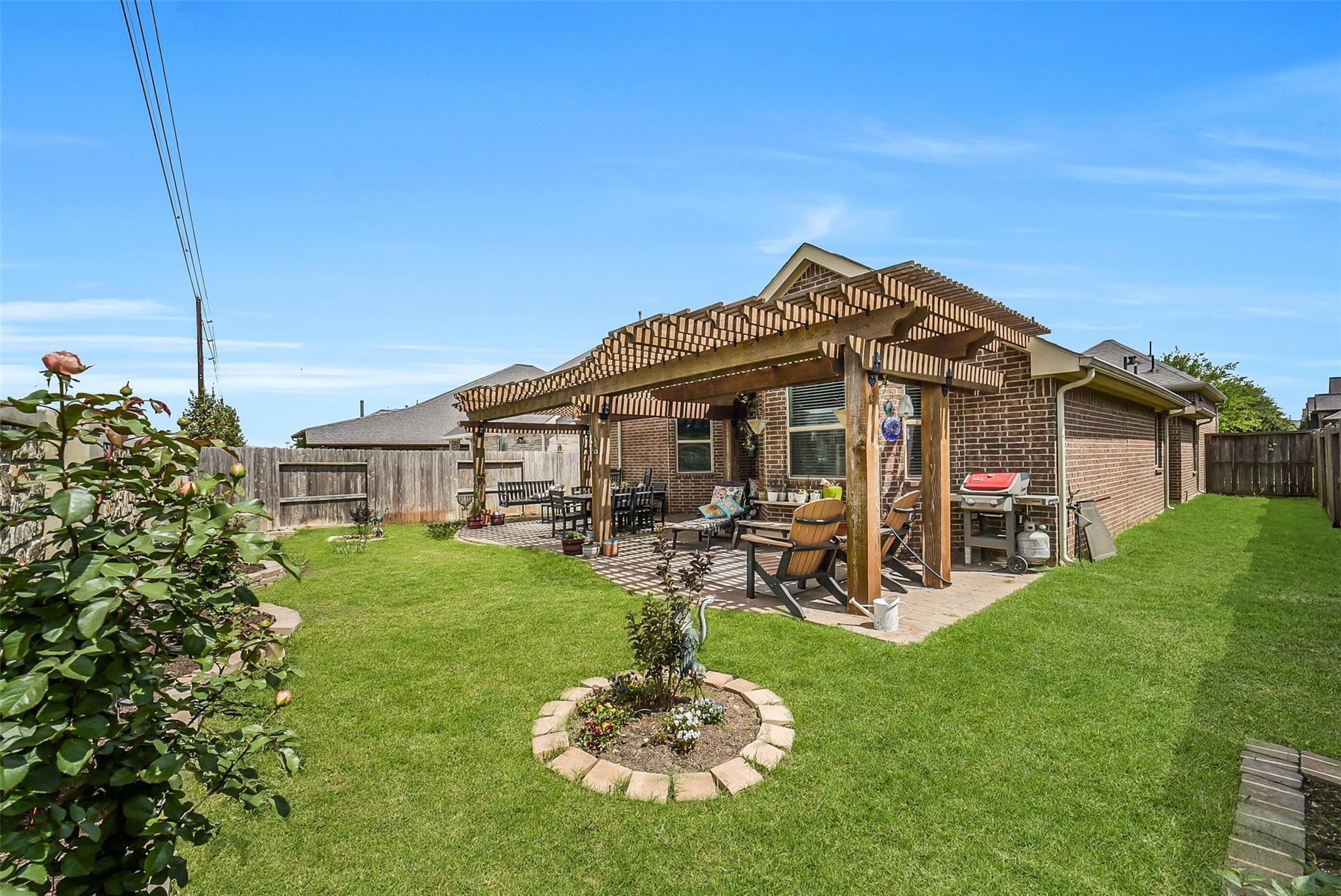 Beautiful one story home in Cross Creek Ranch featuring stylish upgrades, energy efficient, and open layout. The kitchen boasts a large island with breakfast bar seating, designer pendant lighting, painted cabinetry, under-cabinet lighting, stainless steel appliances, and a walk-in pantry. The kitchen connects to the spacious family room featuring a gas fireplace with an updated floor-to-ceiling surround. Wood-look tile flooring extends throughout the home. The primary suite is tucked away at the back of the home and offers a beautifully renovated bath with a freestanding soaking tub, frameless glass shower, and dual-sink vanity. A home office with French doors can also serve as a 4th bedroom. The utility room includes custom cabinetry for extra storage. Outdoors, enjoy outdoor living on the large paver patio that is covered by a pergola. Numerous community amenities include resort-style pools, fitness centers, parks, scenic lakes, and more. Zoned to sought-after LCISD schools.