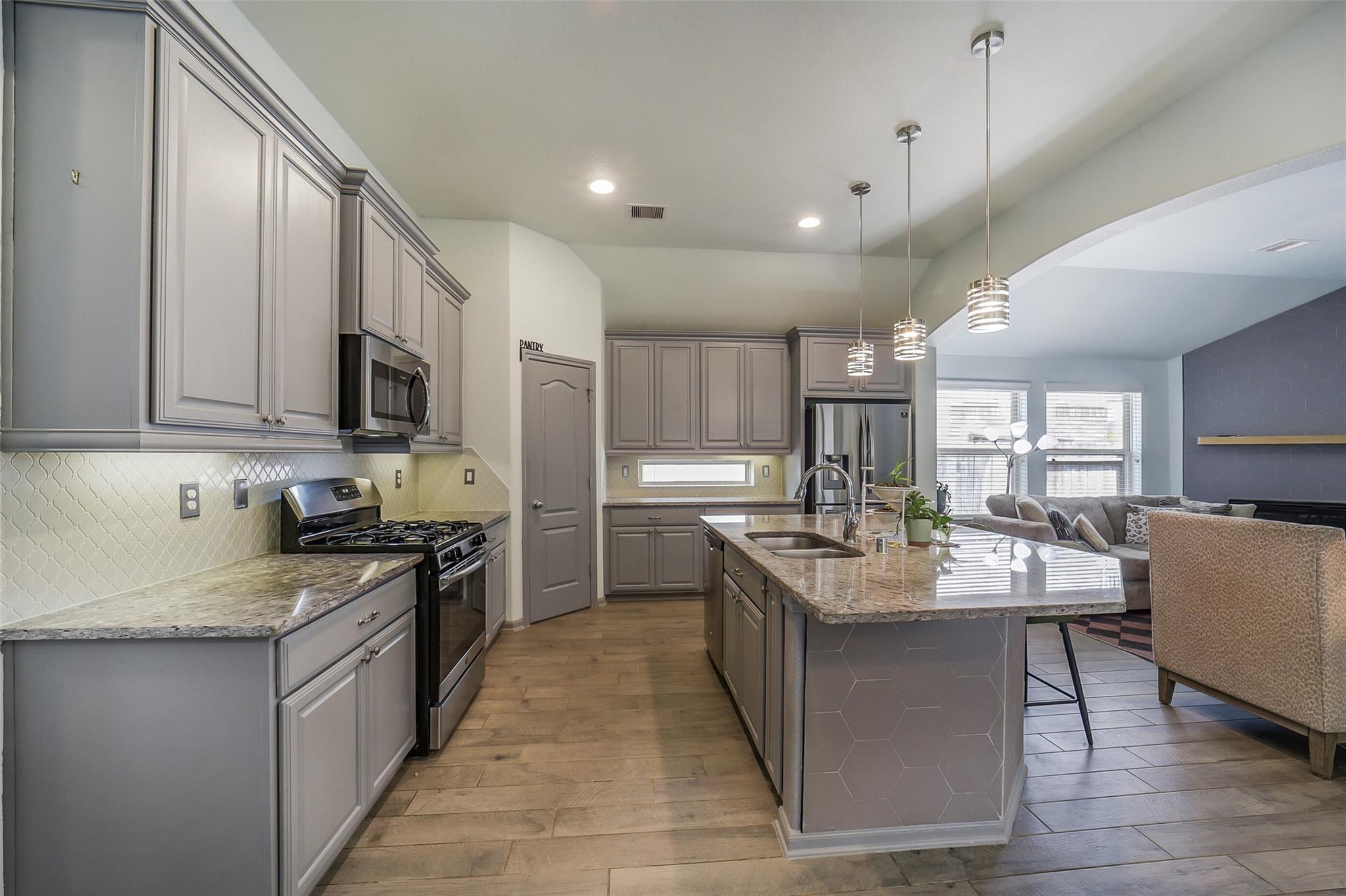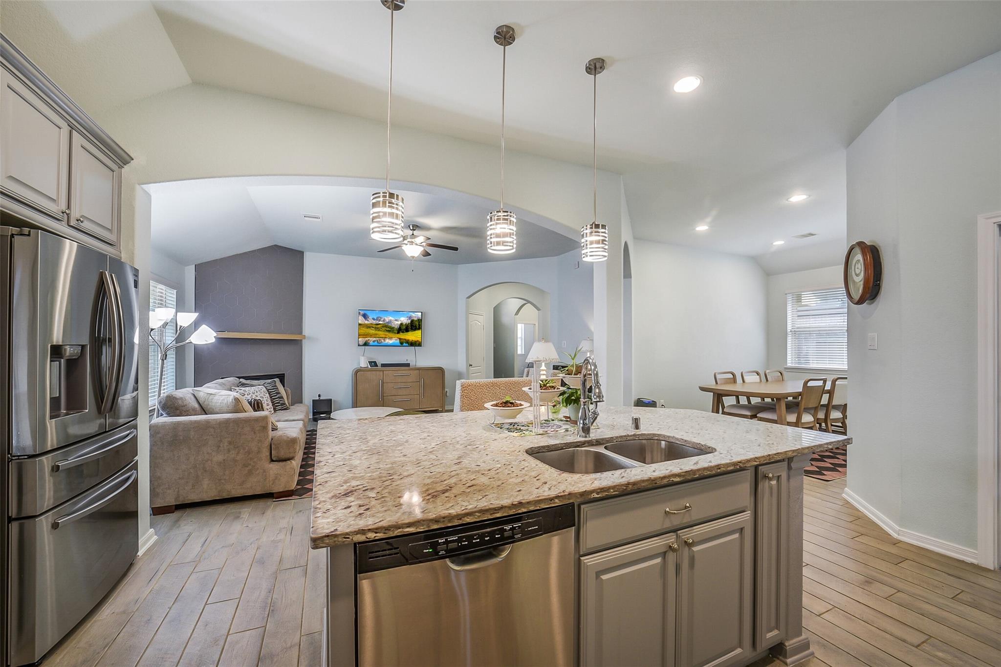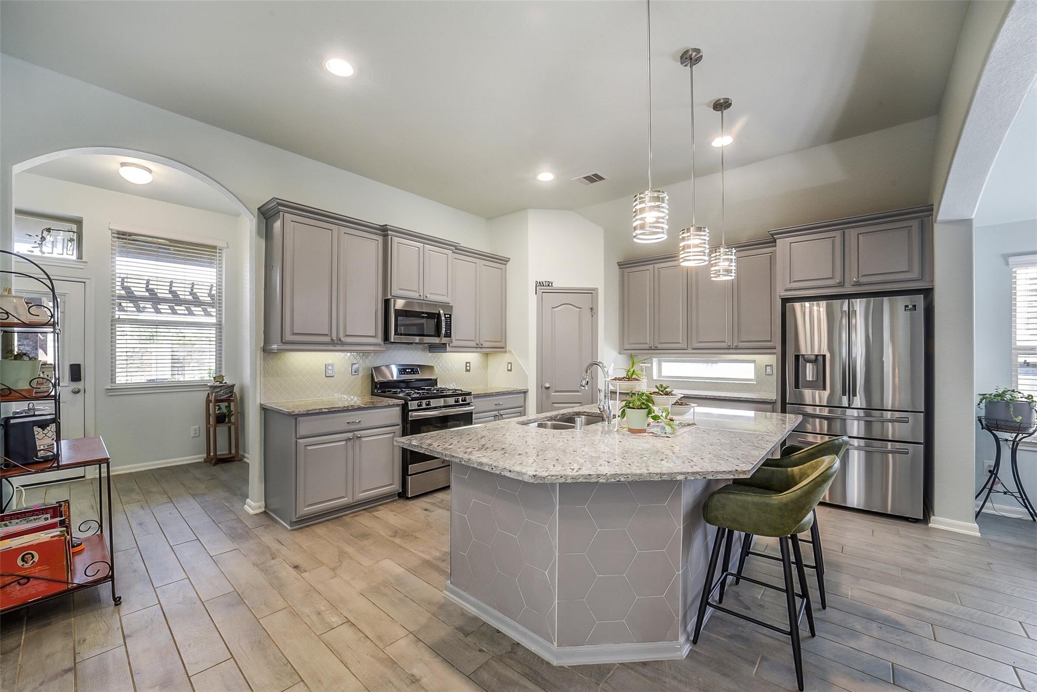 Beautiful one story home in Cross Creek Ranch featuring stylish upgrades, energy efficient, and open layout. The kitchen boasts a large island with breakfast bar seating, designer pendant lighting, painted cabinetry, under-cabinet lighting, stainless steel appliances, and a walk-in pantry. The kitchen connects to the spacious family room featuring a gas fireplace with an updated floor-to-ceiling surround. Wood-look tile flooring extends throughout the home. The primary suite is tucked away at the back of the home and offers a beautifully renovated bath with a freestanding soaking tub, frameless glass shower, and dual-sink vanity. A home office with French doors can also serve as a 4th bedroom. The utility room includes custom cabinetry for extra storage. Outdoors, enjoy outdoor living on the large paver patio that is covered by a pergola. Numerous community amenities include resort-style pools, fitness centers, parks, scenic lakes, and more. Zoned to sought-after LCISD schools.