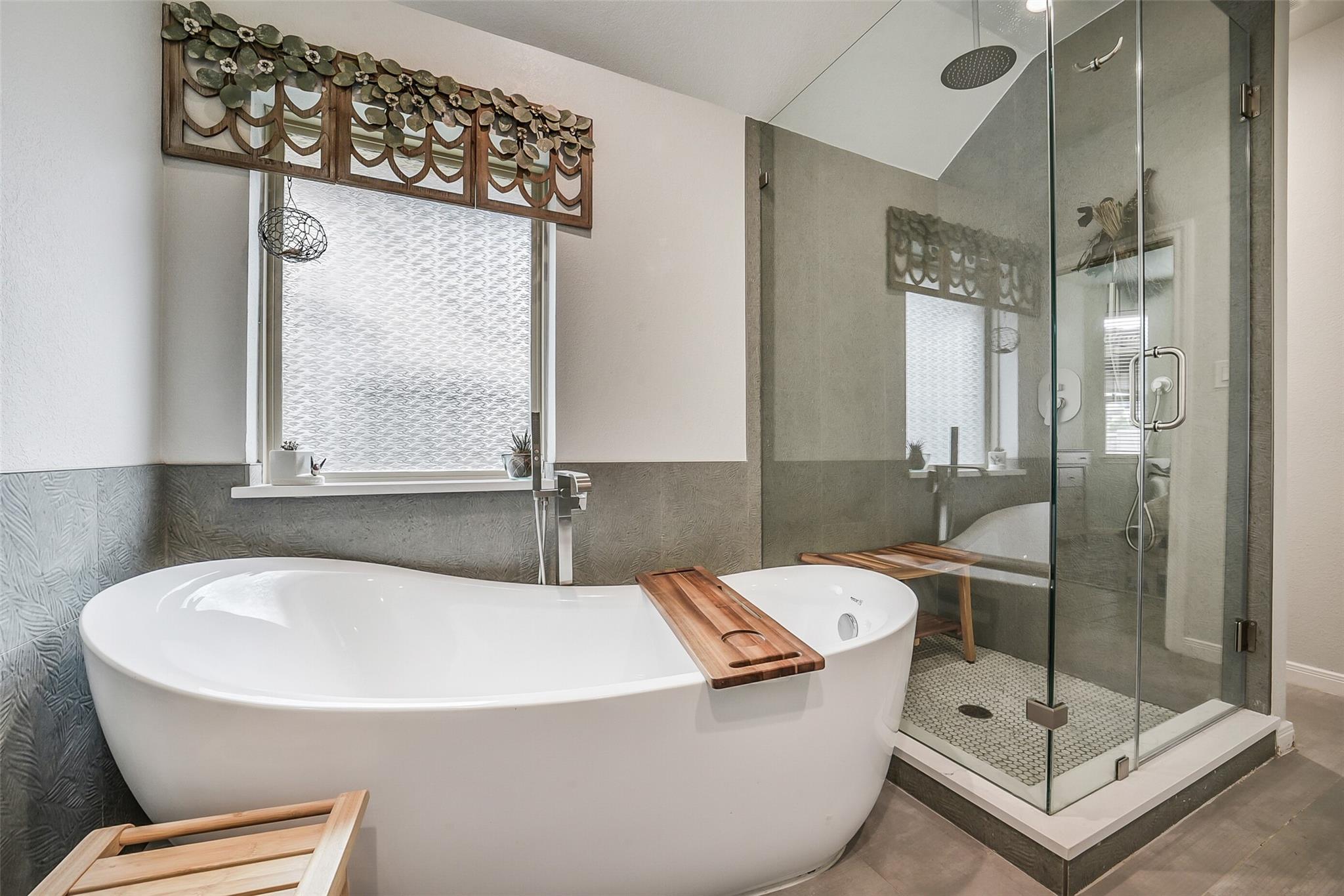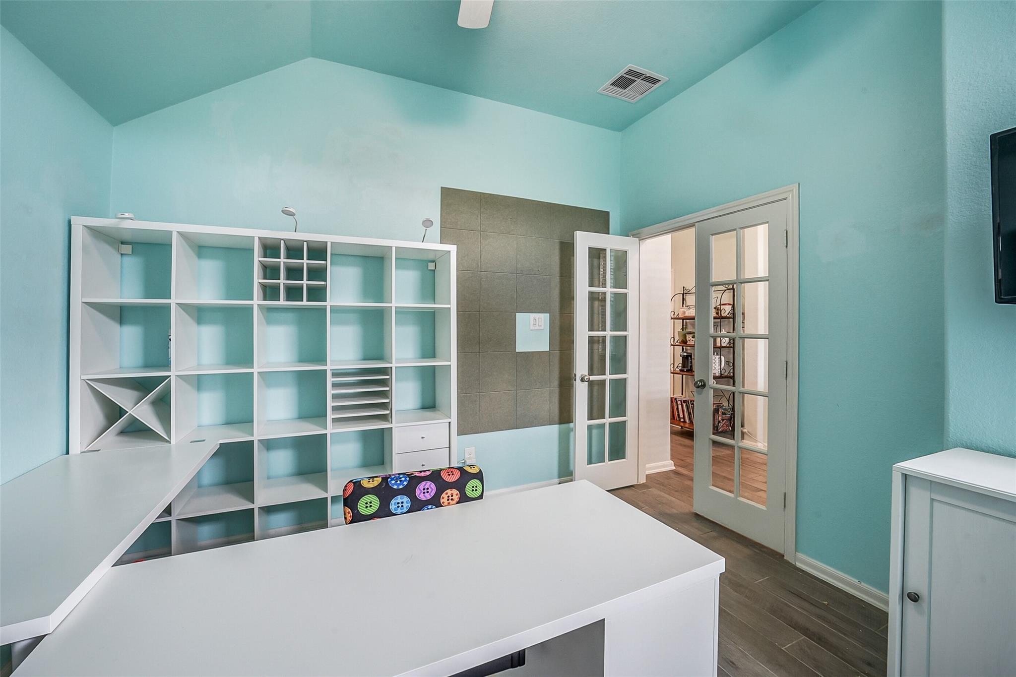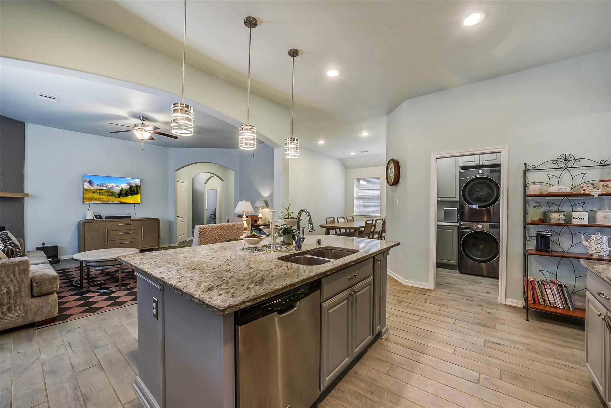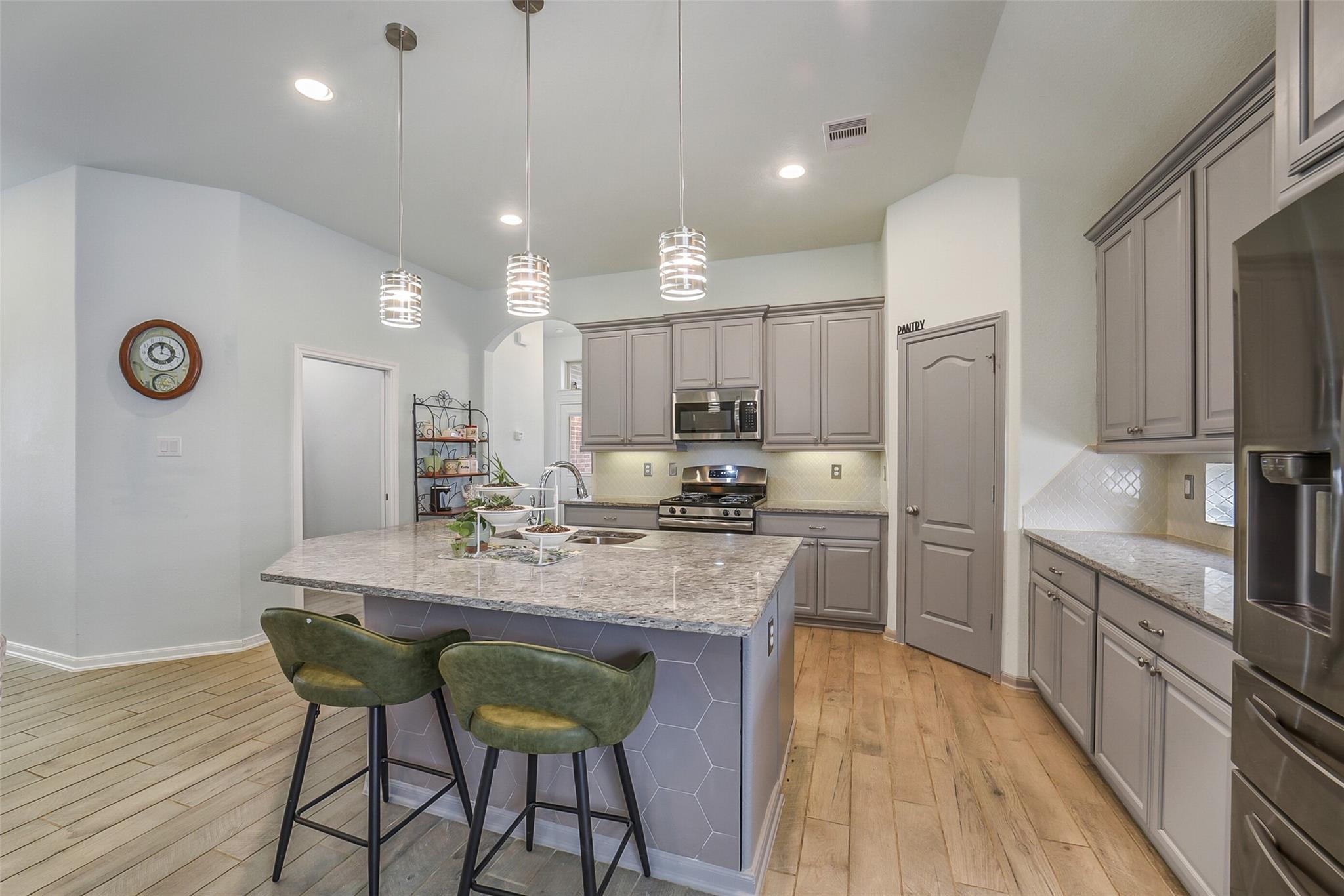 Beautiful one story home in Cross Creek Ranch featuring stylish upgrades, energy efficient, and open layout. The kitchen boasts a large island with breakfast bar seating, designer pendant lighting, painted cabinetry, under-cabinet lighting, stainless steel appliances, and a walk-in pantry. The kitchen connects to the spacious family room featuring a gas fireplace with an updated floor-to-ceiling surround. Wood-look tile flooring extends throughout the home. The primary suite is tucked away at the back of the home and offers a beautifully renovated bath with a freestanding soaking tub, frameless glass shower, and dual-sink vanity. A home office with French doors can also serve as a 4th bedroom. The utility room includes custom cabinetry for extra storage. Outdoors, enjoy outdoor living on the large paver patio that is covered by a pergola. Numerous community amenities include resort-style pools, fitness centers, parks, scenic lakes, and more. Zoned to sought-after LCISD schools.