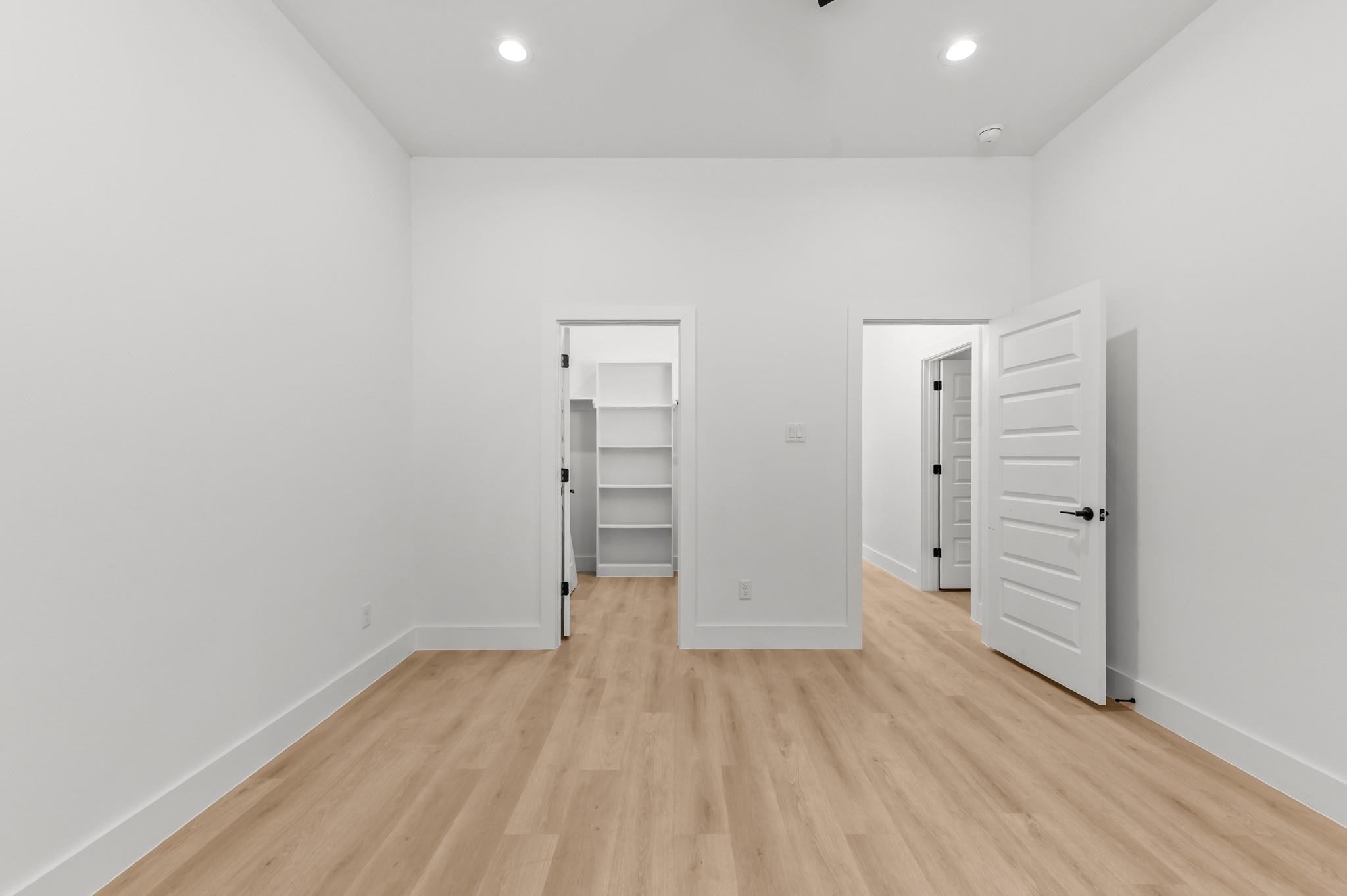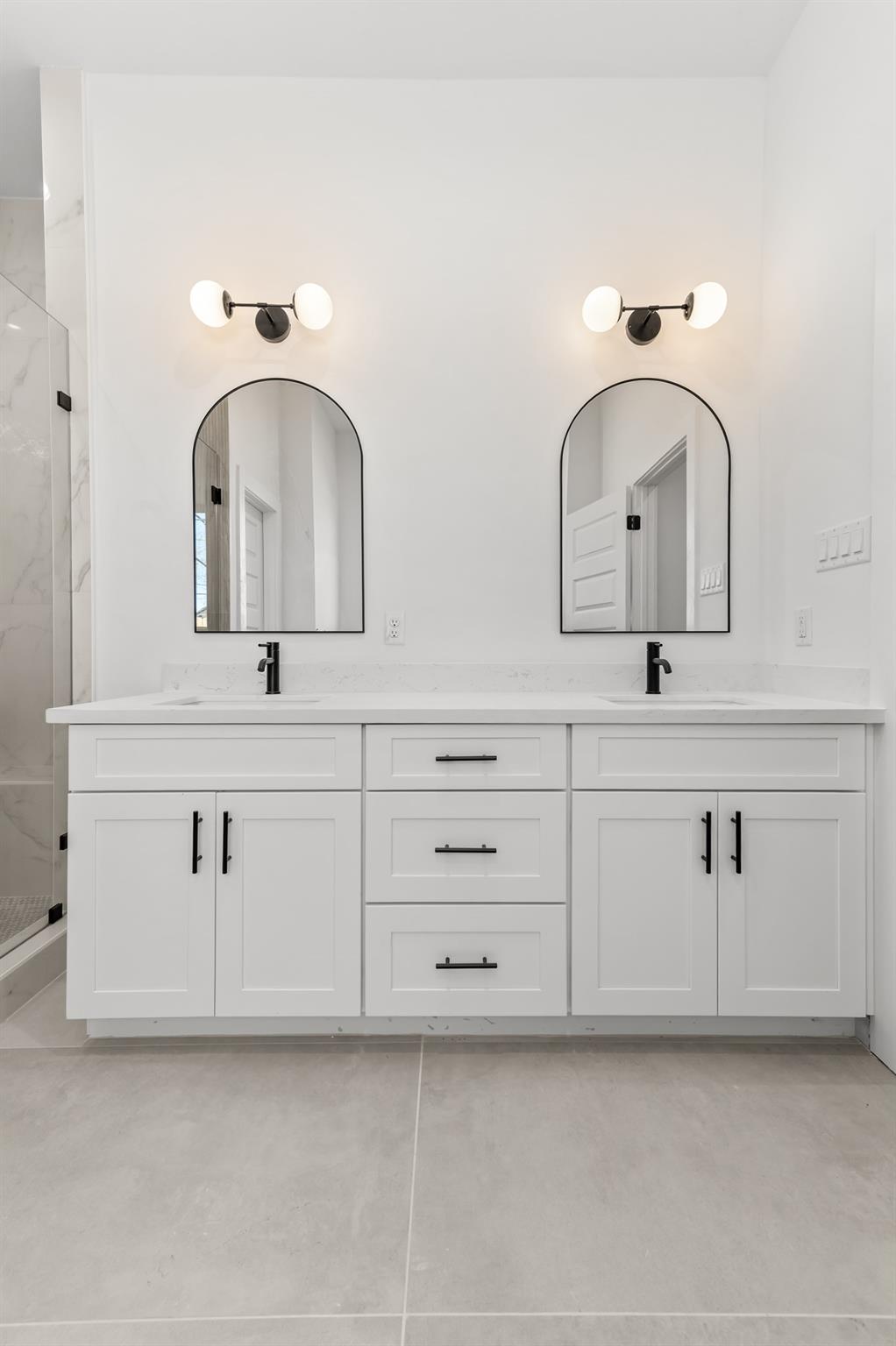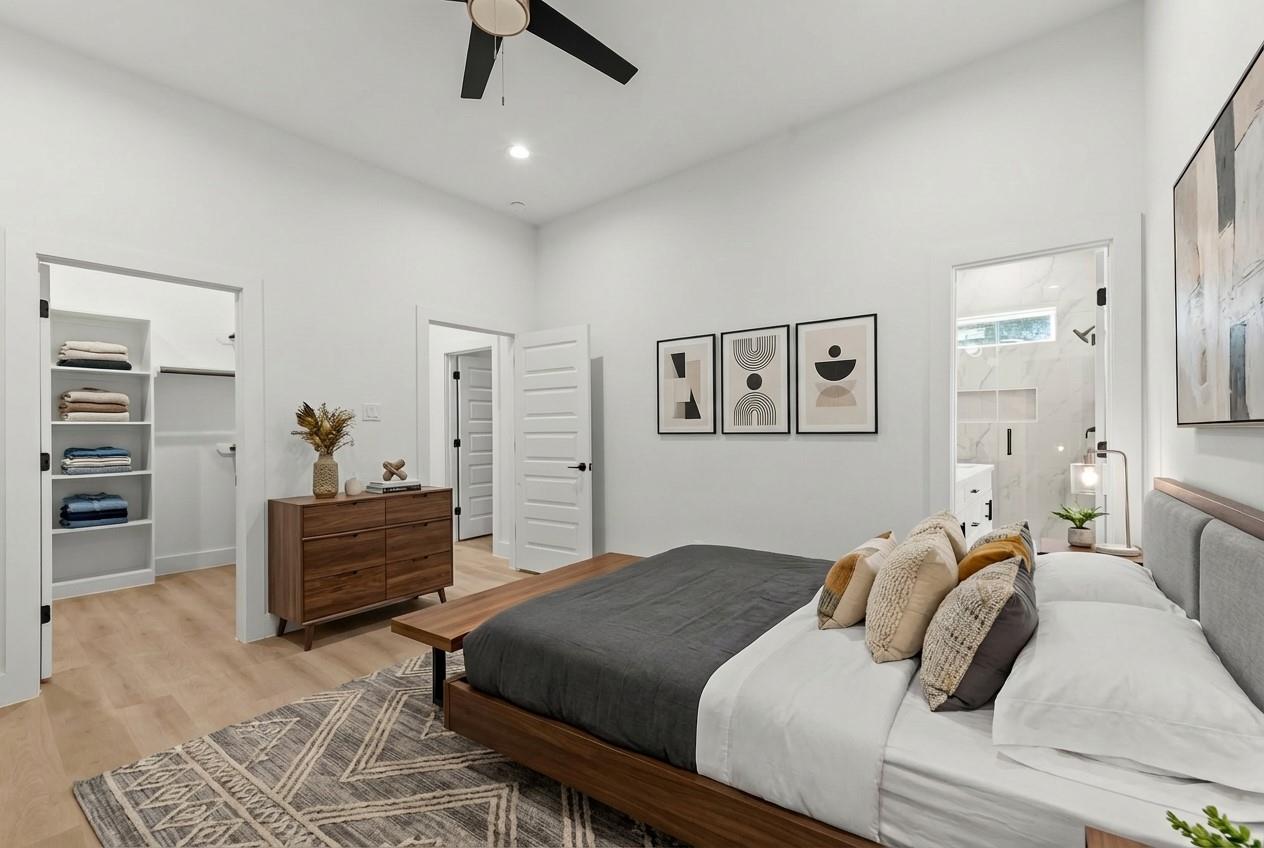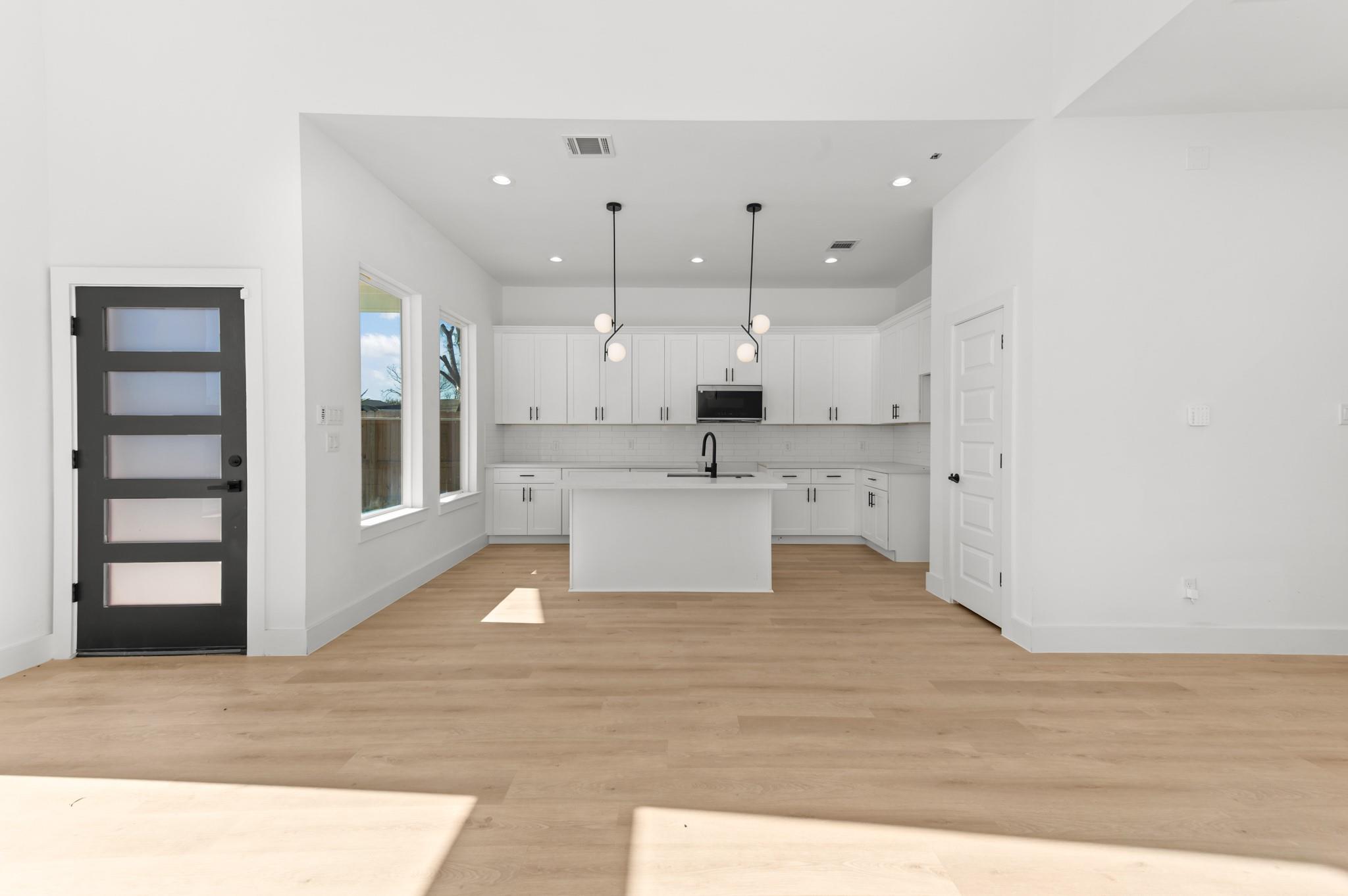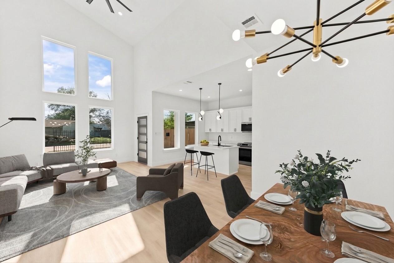This is a newly constructed modern duplex featuring a clean white and dark gray exterior, tall windows, and a gated driveway. The interior offers an open-concept kitchen with a great countertops, a large island, white cabinetry, and stainless steel appliances. The bathroom is spa-inspired, with a freestanding soaking tub, glass walk-in shower, and sleek black fixtures. The home is bright, modern, and thoughtfully designed, perfect for comfortable living or investment.