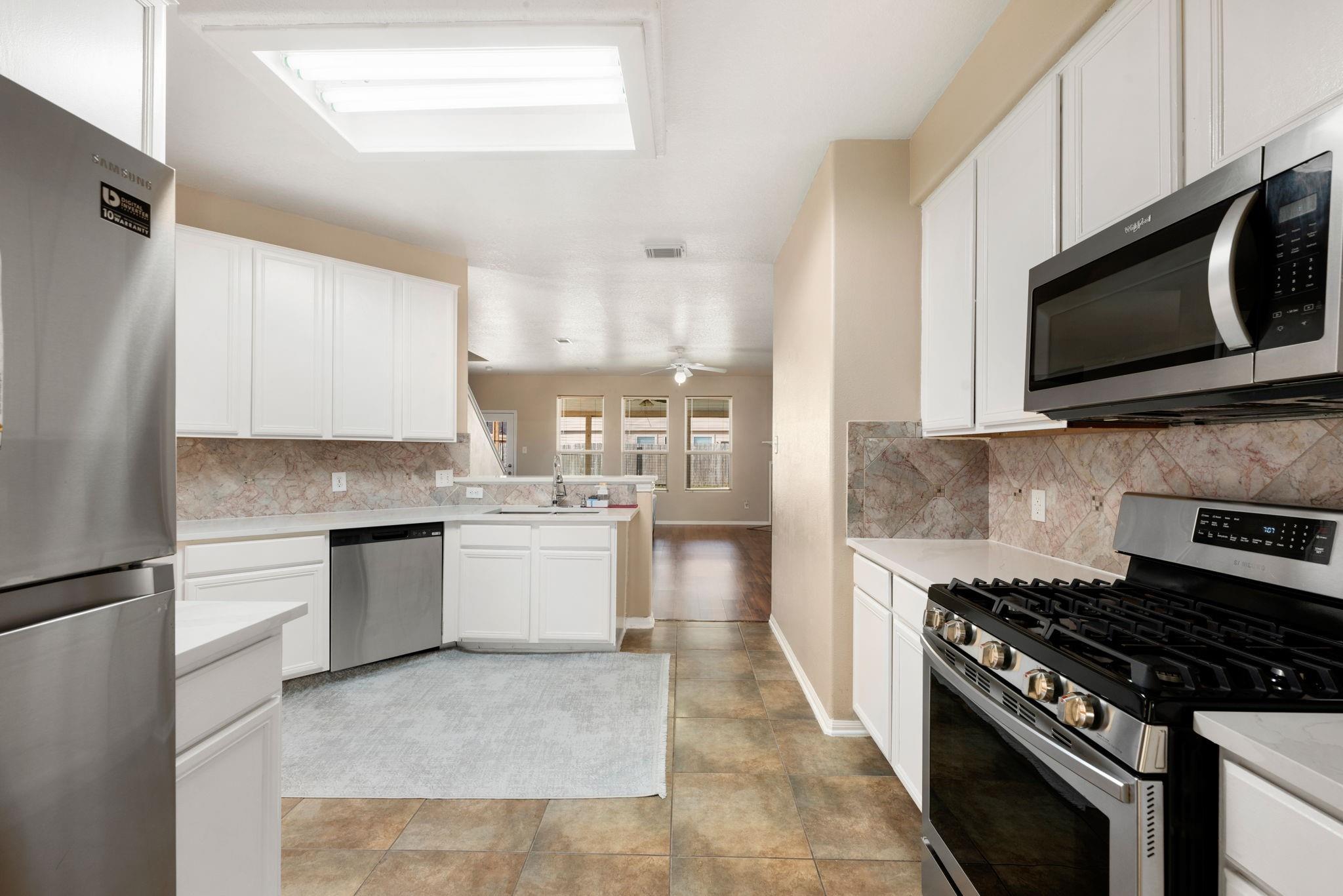 InteriorFireplace:1/Gas Connections,Gaslog FireplaceFloors:Laminate,TileCountertop:QuartzBathroom Description:Full Secondary Bathroom Down,Half Bath,Primary Bath: Double Sinks,Primary Bath: Separate Shower,Primary Bath: Soaking Tub,Secondary Bath(s): Shower Only,Secondary Bath(s): Tub/Shower ComboBedroom Desc:1 Bedroom Down - Not Primary BR,3 Bedrooms Up,En-Suite Bath,Primary Bed - 2nd Floor,Walk-In ClosetKitchen Desc:Breakfast Bar,Kitchen open to Family Room,Pantry,Walk-in PantryRoom Description:1 Living Area,Breakfast Room,Den,Formal Dining,Gameroom Up,Kitchen/Dining Combo,Living Area - 1st Floor,Utility Room in HouseHeating:Central GasCooling:Central ElectricConnections:Electric Dryer Connections,Gas Dryer Connections,Washer ConnectionsDishwasher:YesDisposal:YesCompactor:NoMicrowave:YesRange:Freestanding Range,Gas RangeOven:Freestanding Oven,Gas Oven,Single OvenIce Maker:NoEnergy Feature:Attic Vents,Ceiling Fans,Digital Program Thermostat,High-Efficiency HVAC,HVAC>15 SEER,Insulated/Low-E windowsInterior:Alarm System - Owned,Dryer Included,Fire/Smoke Alarm,High Ceiling,Refrigerator Included,Washer Included,Window Coverings