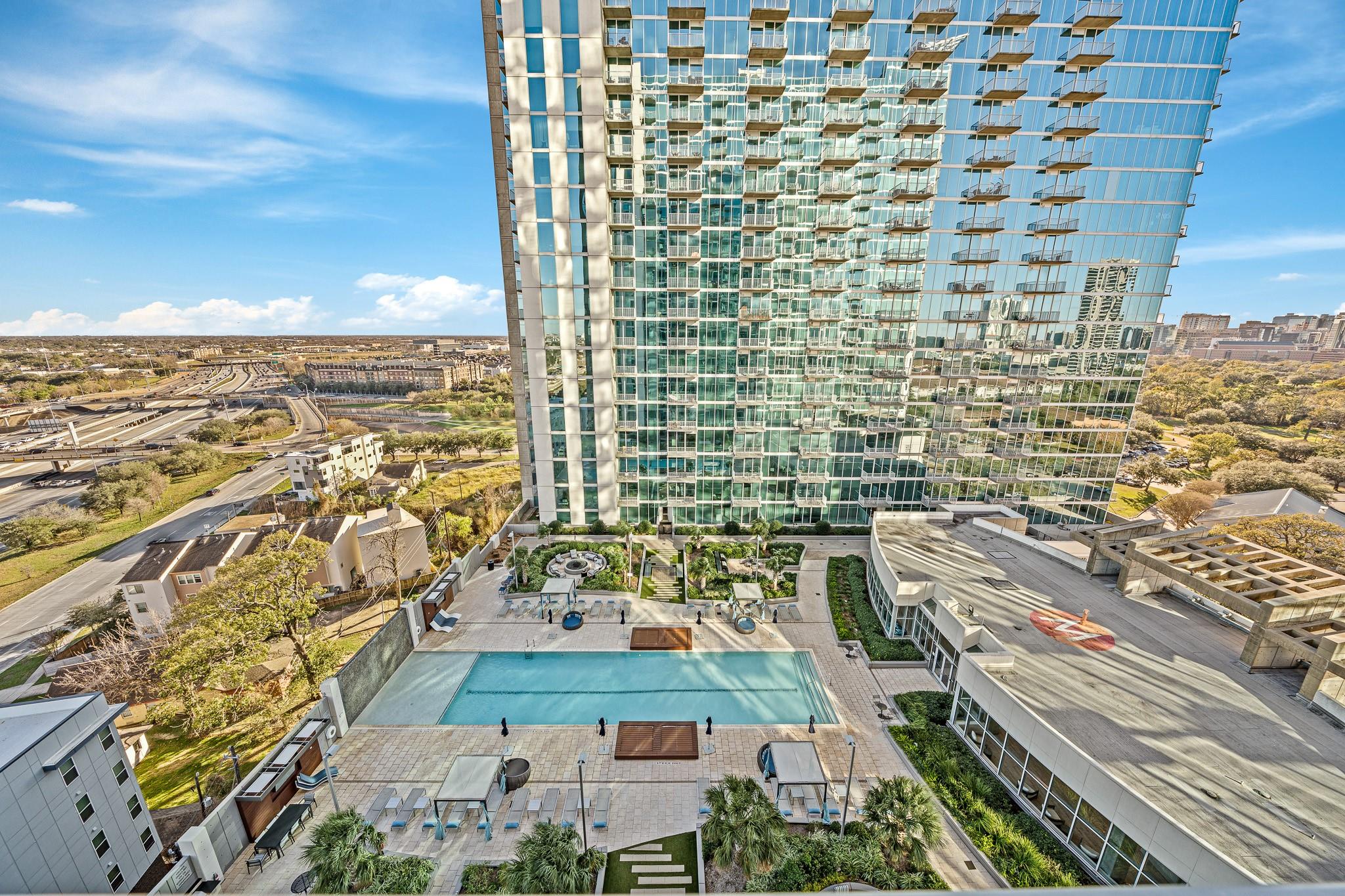 Luxury & Convenient 14th-floor residence with stunning views of the pool deck, Hermann Park, and the Texas Medical Center. Recently renovated with a sleek walk-in shower, updated flooring, and designer backsplash. Enjoy resort-style living with a state-of-the-art fitness center, steam & dry saunas, 24-hour boxing gym, one-acre pool deck with cabanas, hot tub, fire pits, and outdoor kitchen. Full-service building with concierge, valet, business center, social lounge, and weekday shuttle to the Medical Center