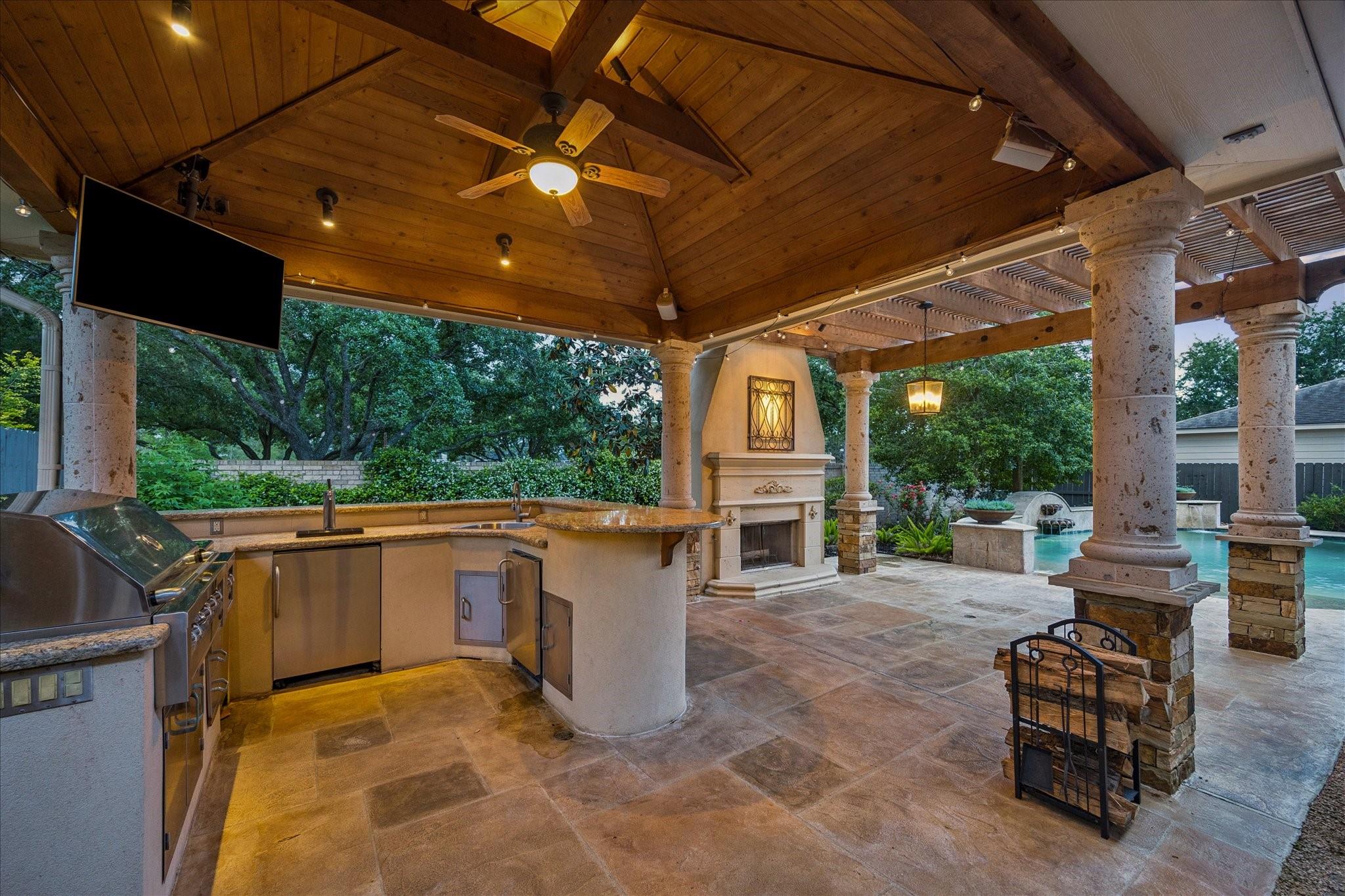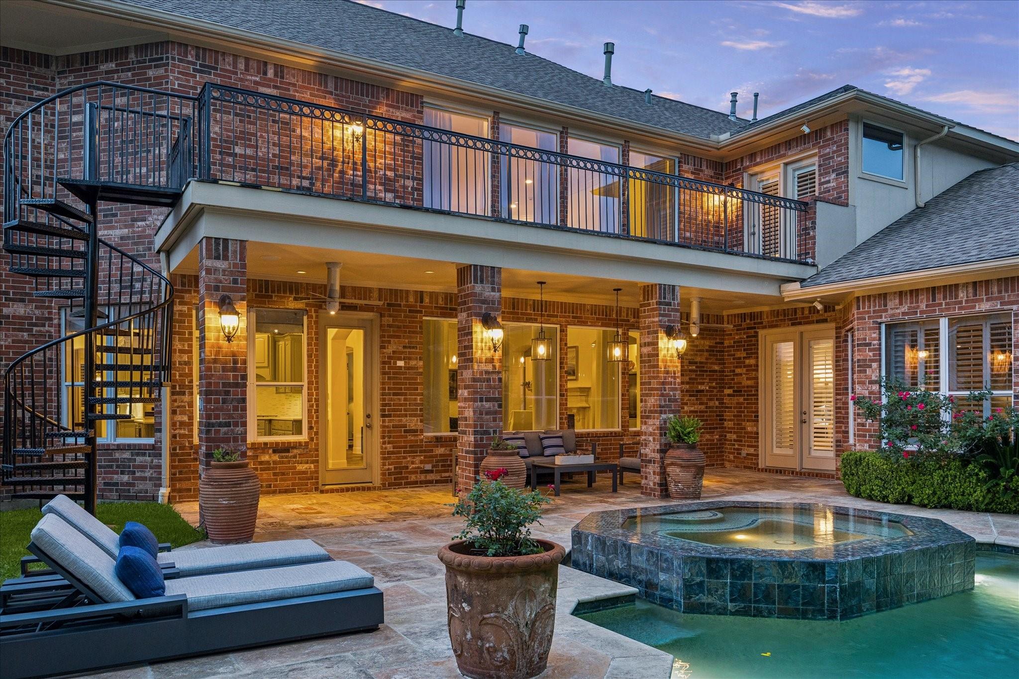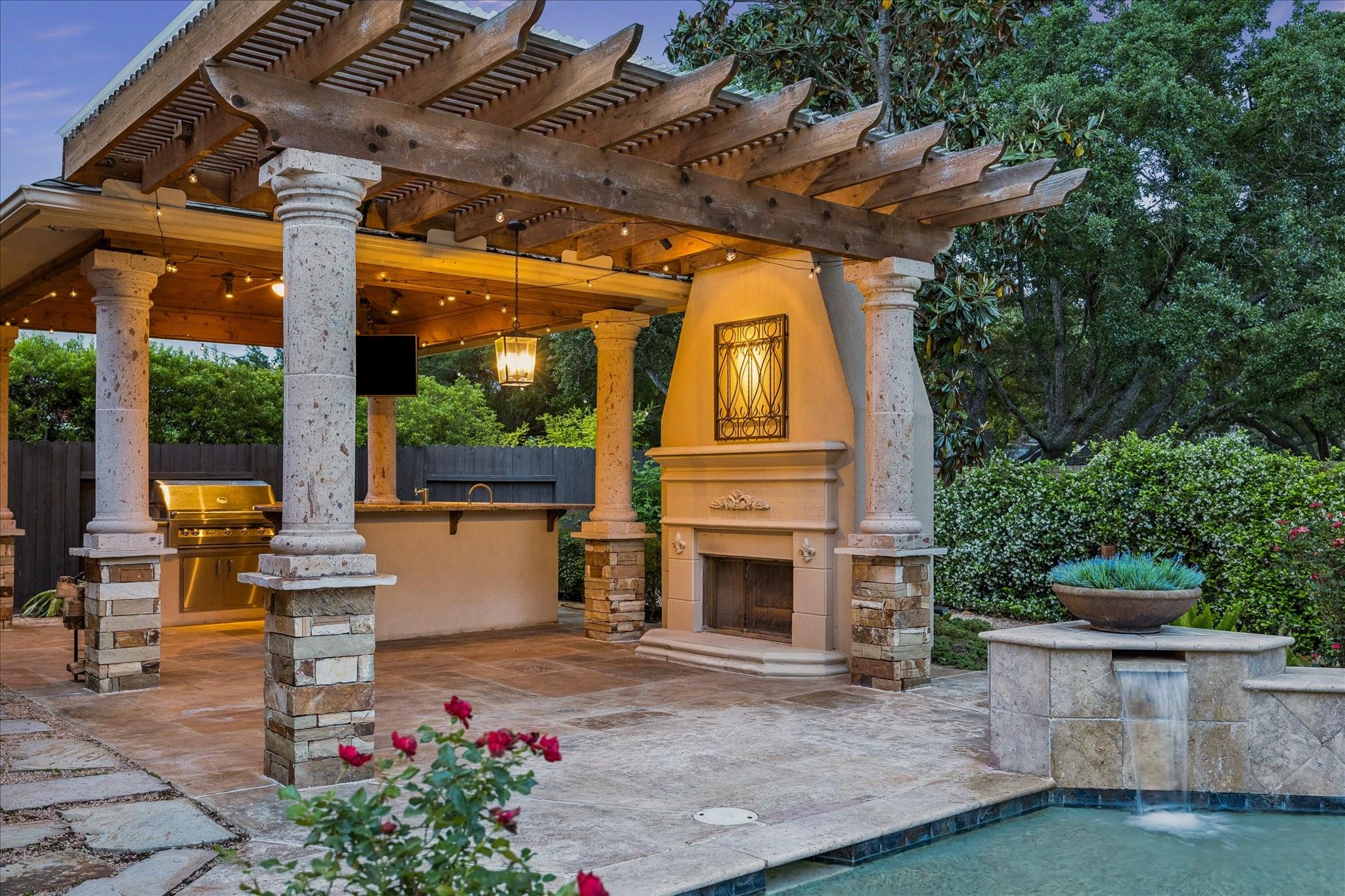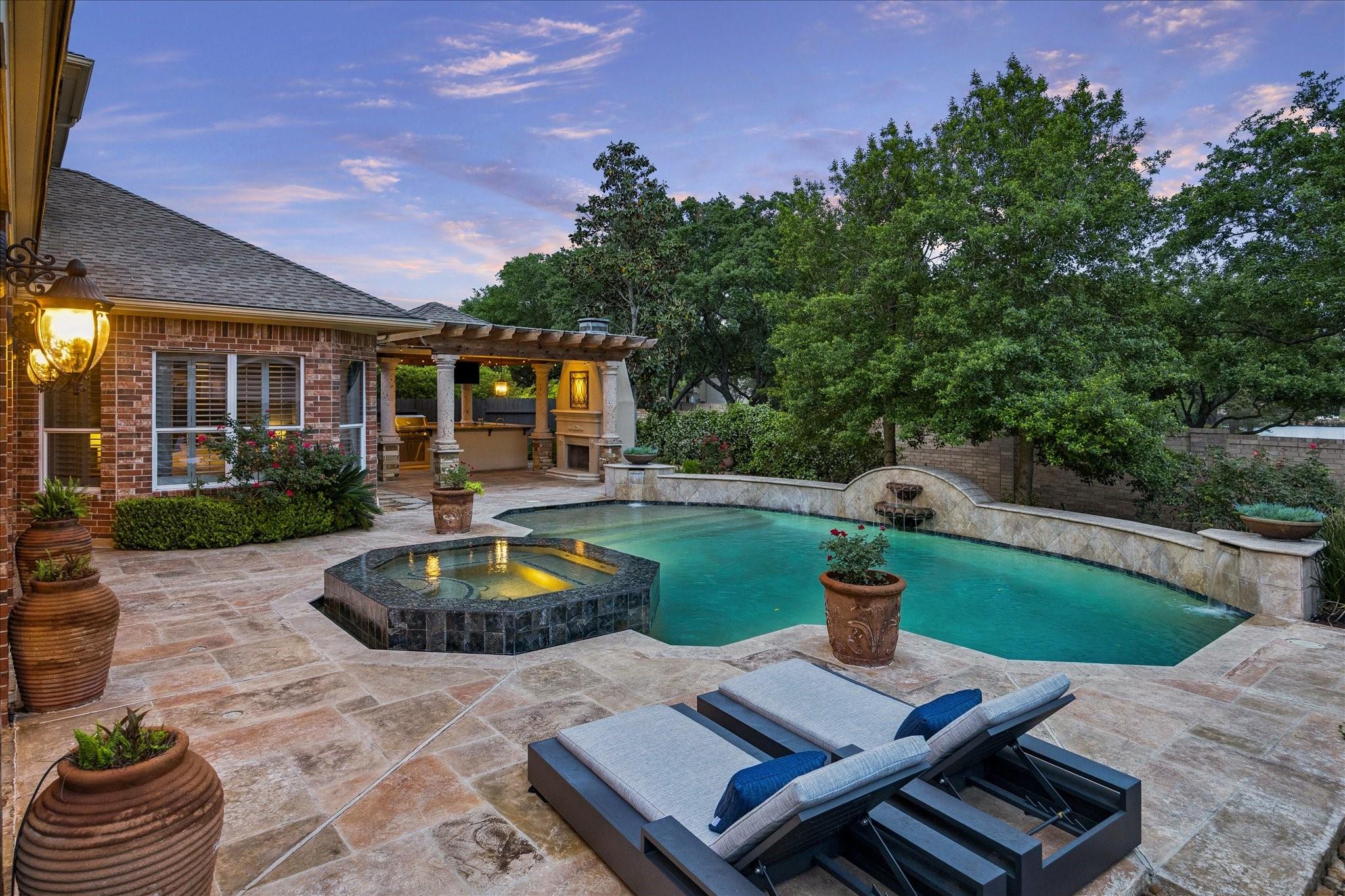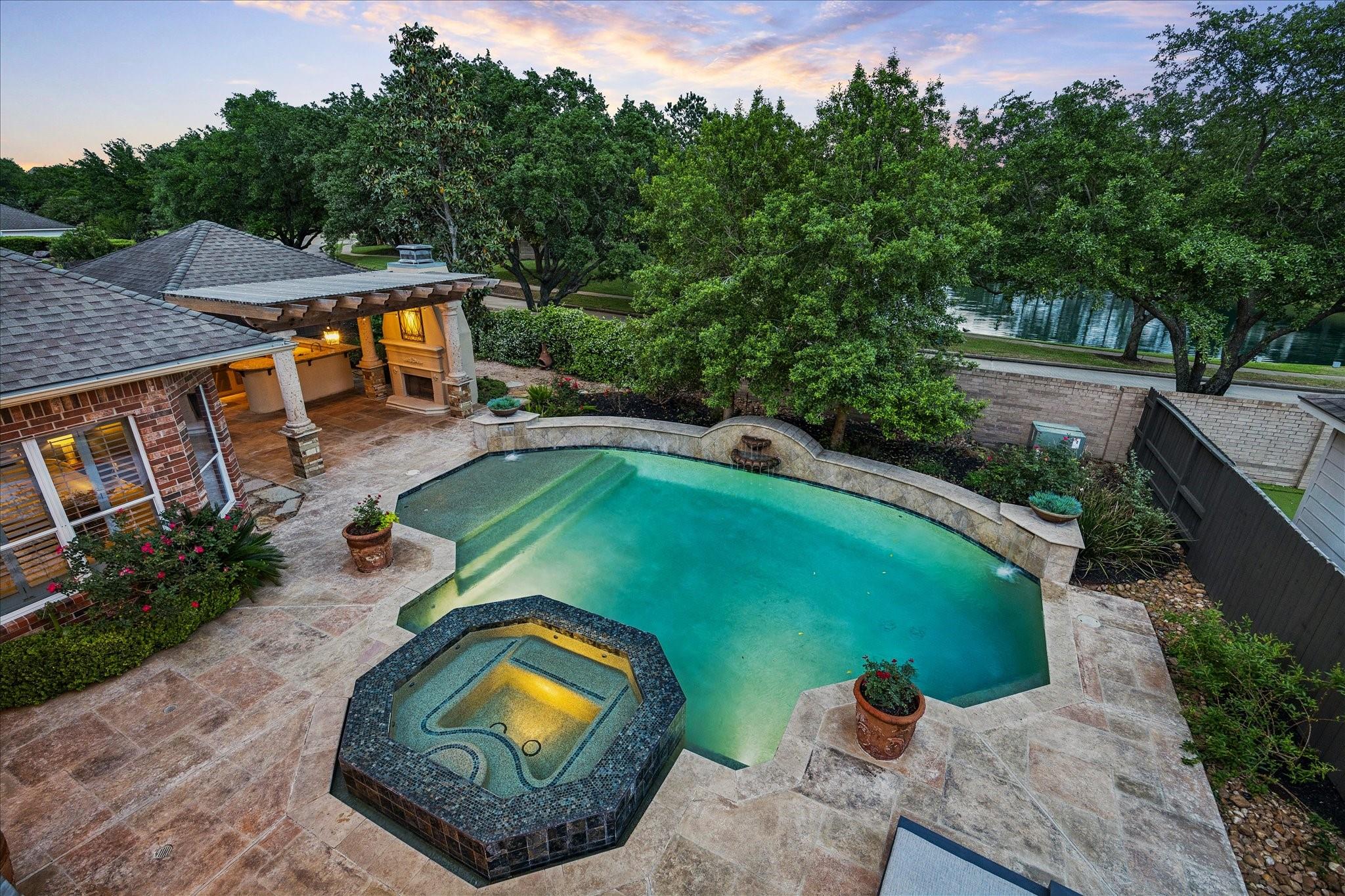 Experience luxury living in a manned-gated community. This home features soaring ceilings and a two-story foyer, dining, and family room that flood the interior with natural light. Designed for the ultimate host, the home boasts a custom wine grotto and a spectacular media room complete with a projector w/ screen and dry bar, offering direct access to a balcony with serene lake views. The primary suite and kitchen provide additional access points to the backyard for seamless indoor-outdoor flow. The resort-style oasis features two covered patios, an outdoor fireplace, and a pool with an attached spa. The summer kitchen with fully equipped outdoor kitchen is an entertainer's dream with a built-in BBQ, kegerator, ice maker, fridge, and sink. Recent updates include Arhaus chandeliers, 4 renovated baths, updated kitchen, replaced HVAC (2025), and 3-car garage w/ epoxy floors and built-ins. Enjoy community amenities and trails. Bus service available to Awty, British, and Village Schools.