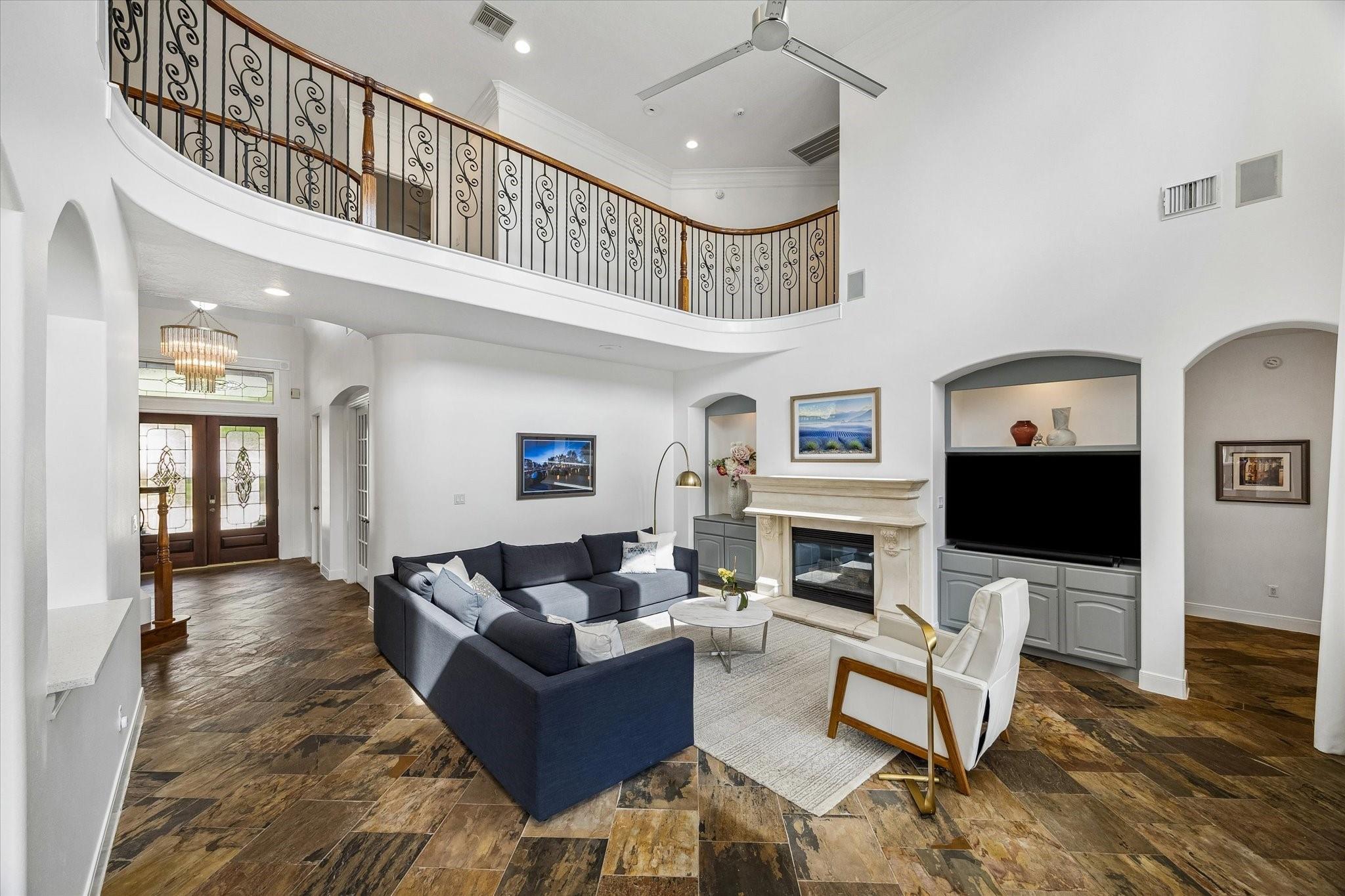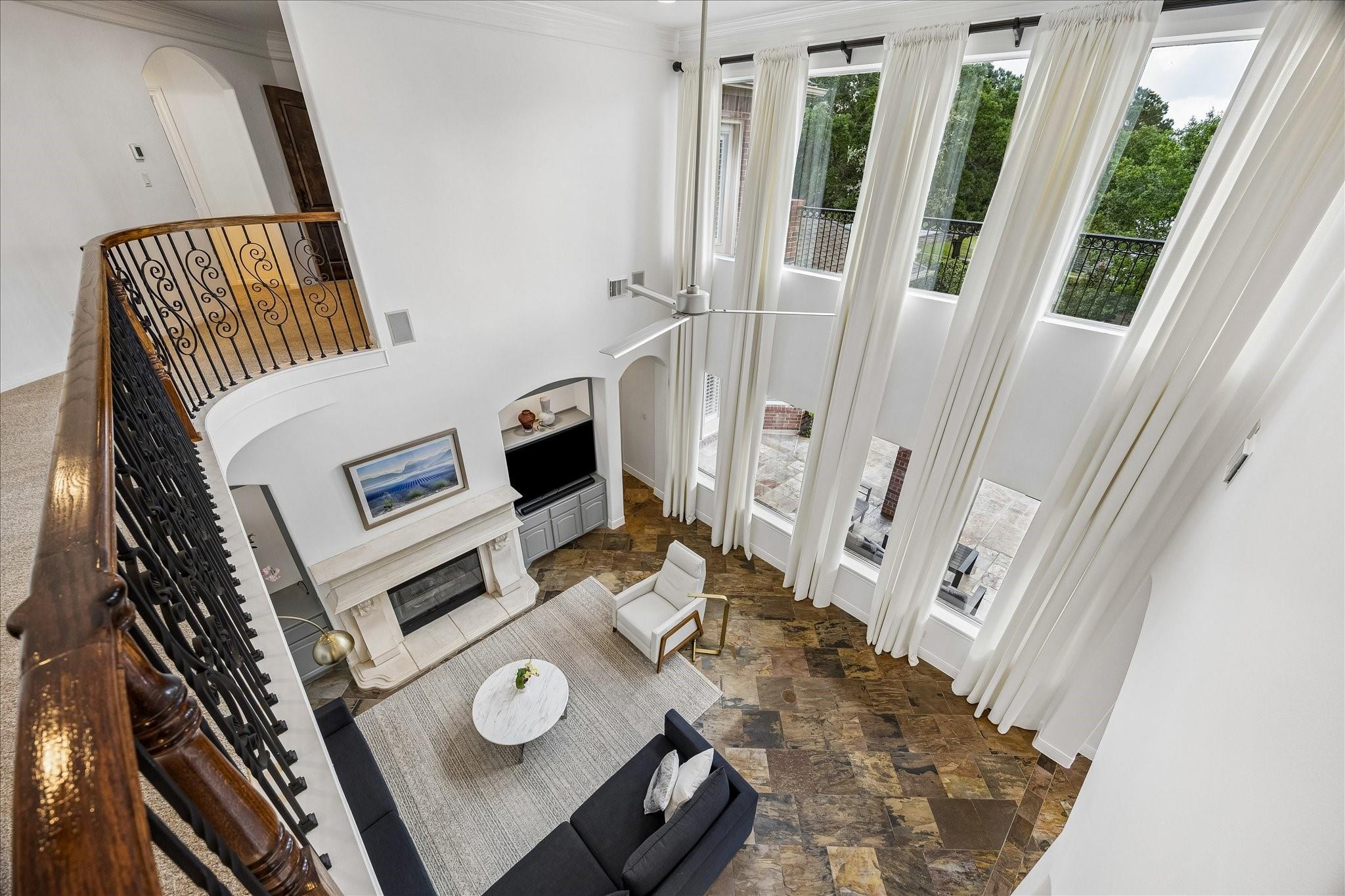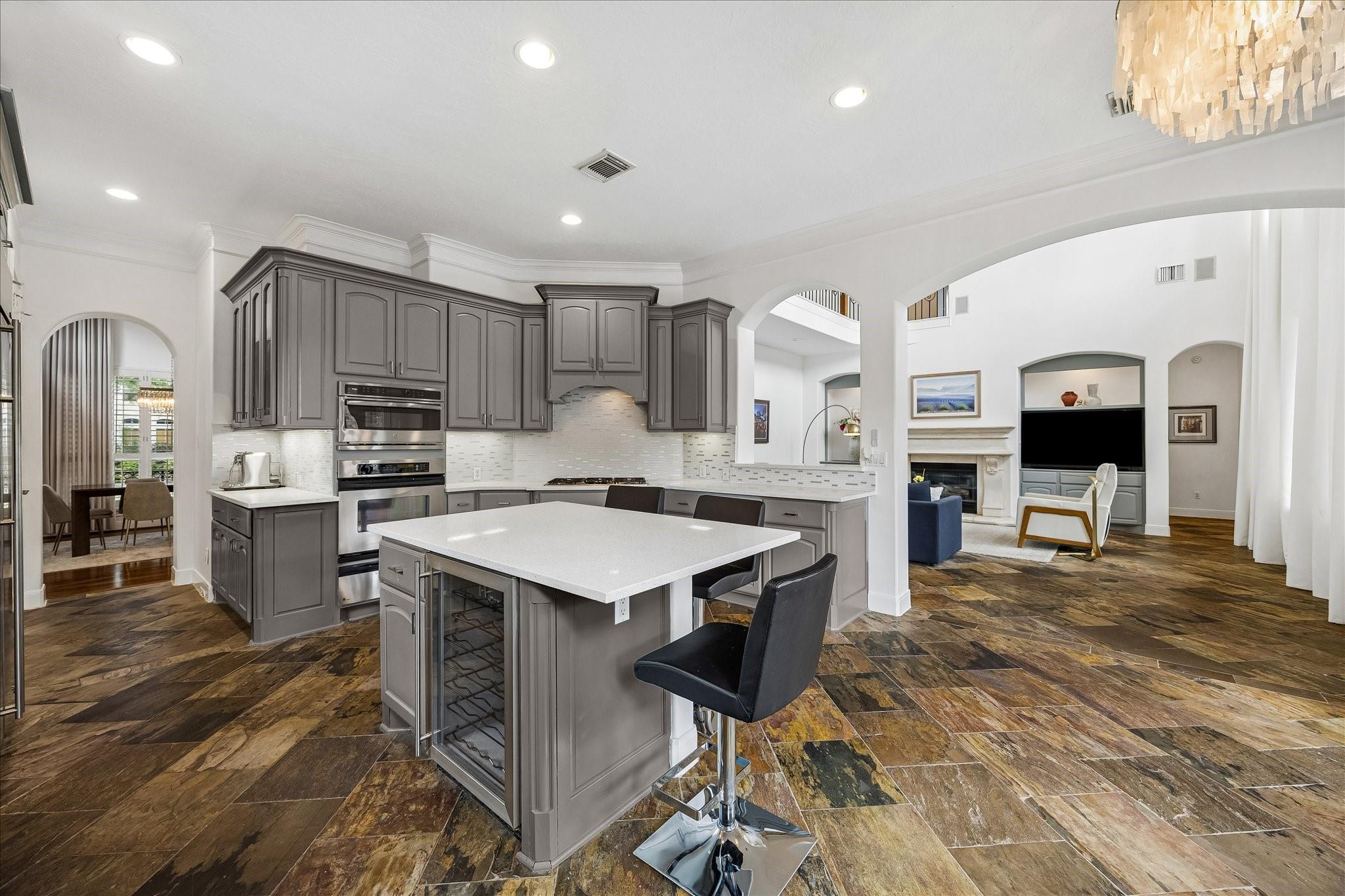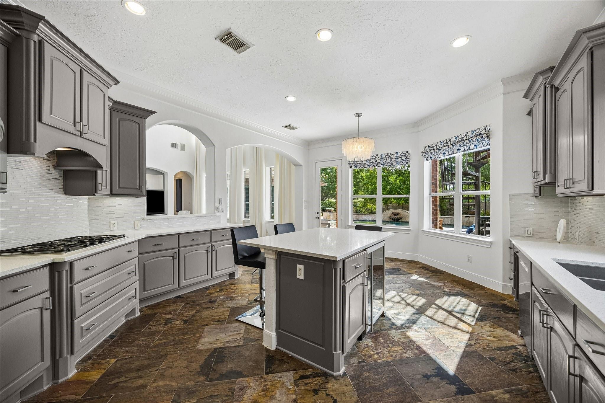 InteriorFireplace:1/Gaslog FireplaceFloors:Carpet,Engineered Wood,Slate,TileCountertop:QuartzBathroom Description:Half Bath,Primary Bath: Double Sinks,Primary Bath: Jetted Tub,Primary Bath: Separate Shower,Secondary Bath(s): Tub/Shower Combo,Vanity AreaBedroom Desc:En-Suite Bath,Primary Bed - 1st Floor,Walk-In ClosetKitchen Desc:Breakfast Bar,Island w/o Cooktop,Kitchen open to Family Room,Pantry,Walk-in PantryRoom Description:Breakfast Room,Entry,Family Room,Formal Dining,Gameroom Up,Home Office/Study,Living Area - 1st Floor,Utility Room in HouseHeating:Central GasCooling:Central ElectricConnections:Washer ConnectionsDishwasher:YesDisposal:YesMicrowave:YesRange:Gas CooktopOven:Single OvenIce Maker:NoEnergy Feature:Ceiling Fans,Digital Program Thermostat,Energy Star/CFL/LED Lights,High-Efficiency HVAC,Insulated/Low-E windowsInterior:Alarm System - Owned,Central Vacuum,Fire/Smoke Alarm,Formal Entry/Foyer,High Ceiling,Refrigerator Included,Spa/Hot Tub,Water Softener - Owned,Wet Bar,Window Coverings,Wine/Beverage Fridge,Wired for Sound