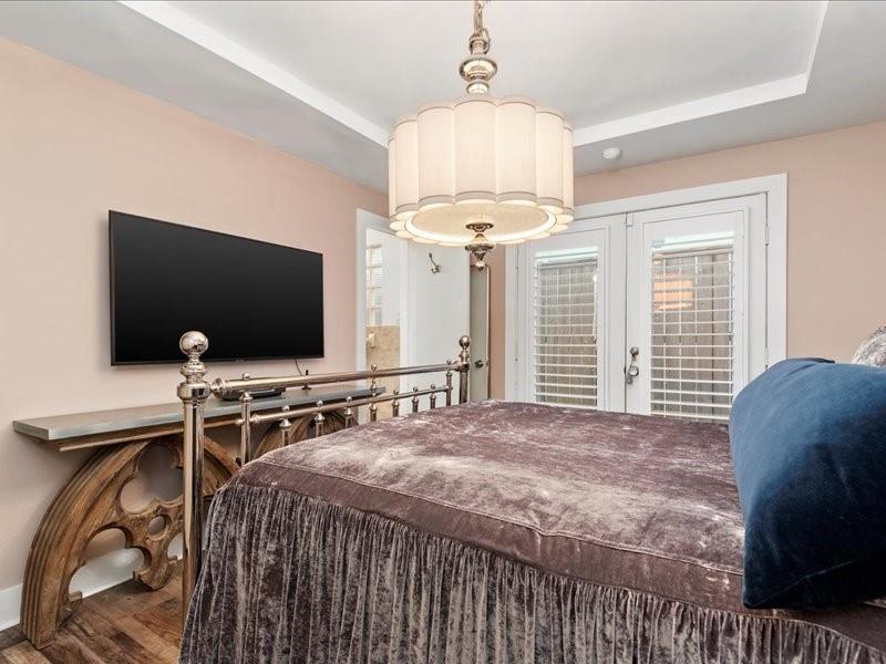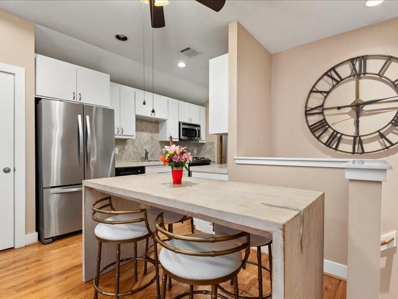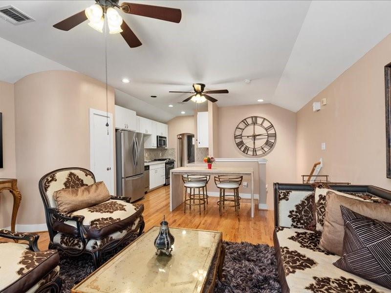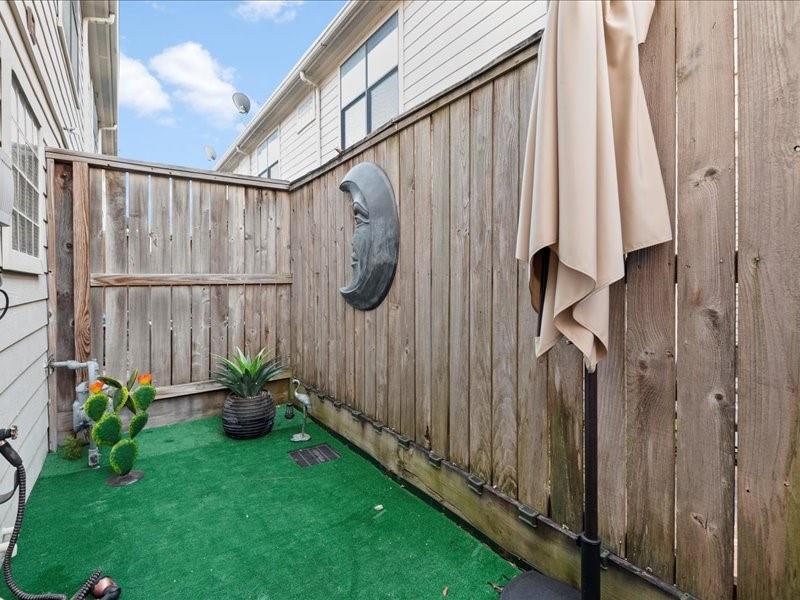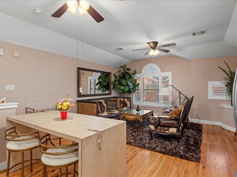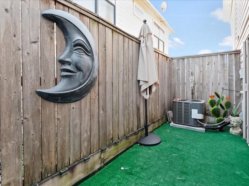 Step into this beautifully designed contemporary two-story townhome offering the perfect blend of style, comfort, and value. Featuring 2 bedrooms, 2 full baths, and approximately 1,030 square feet, this home lives large with an open-concept layout, soaring ceilings, and abundant natural light, beautiful real hardwood floors, berber carpet and tile. The modern kitchen includes designer title backsplash, gas range, and ample cabinetry, with a dining area flowing seamlessly into the living area. The first floor primary suite offers privacy and convenience with an en-suite bath, and private fenced patio, while the upstairs bedroom and full bath provide flexibility for guests, a home office, or roommate living. Windows and patio door have custom installed shutters. HVAC installed in 2024. Enjoy low maintenance living in a gated controlled-access community. Conveniently located near 610/I-45/288, NRG, Hermann Park and Zoo, major universities, Hobby Airport and the Texas Medical Center.