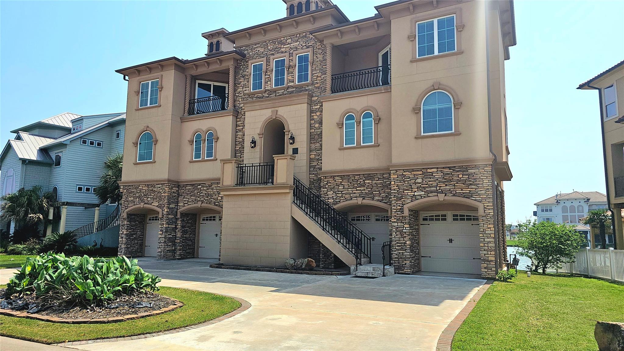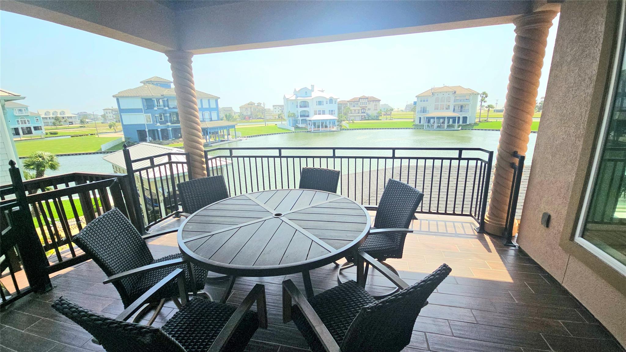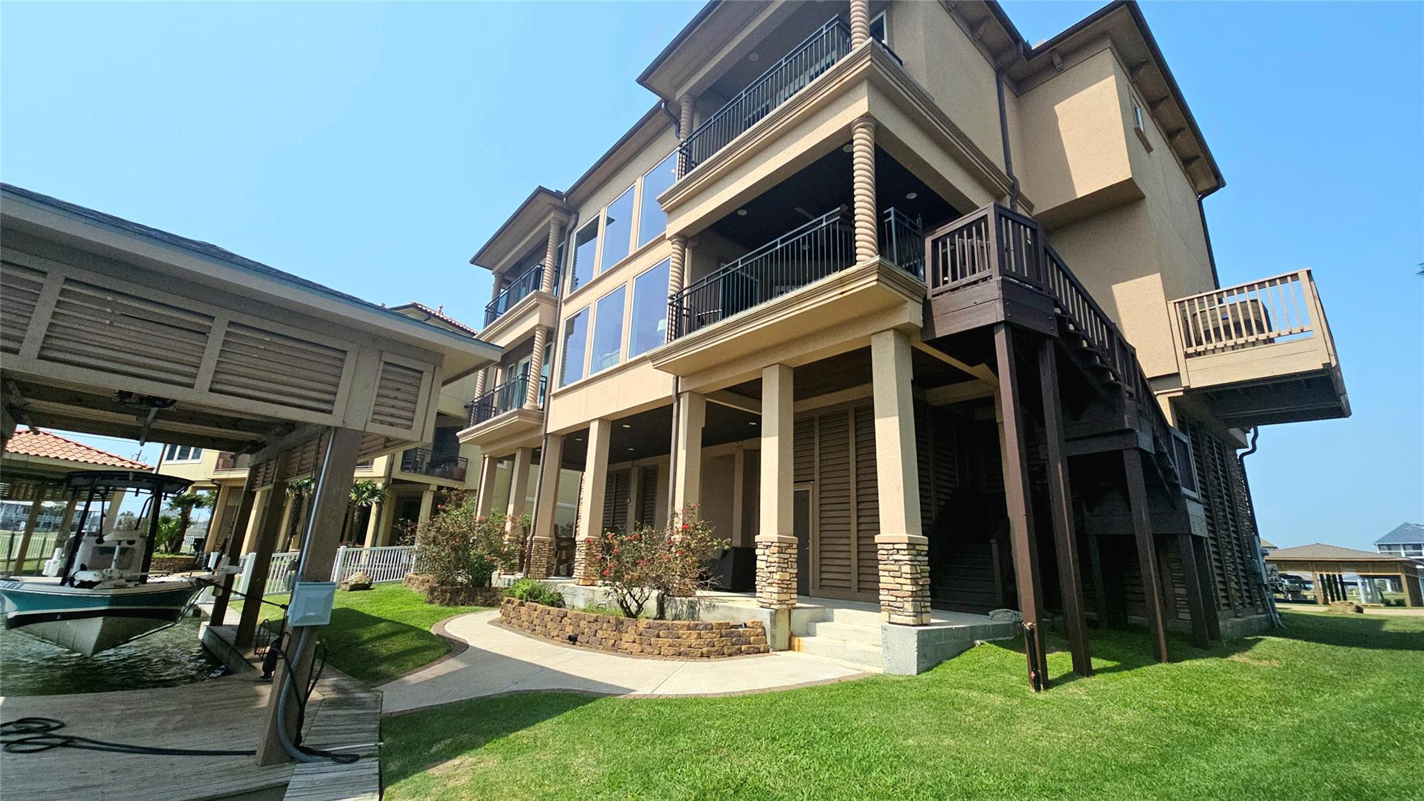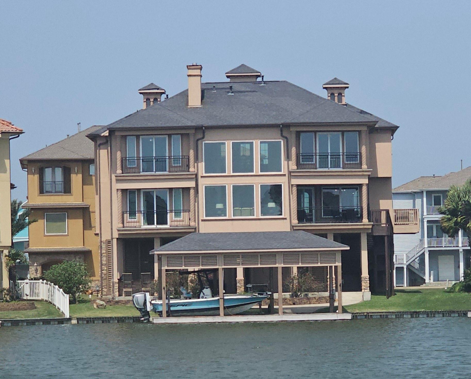 Commanding a premier position in Harborwalk, this 4-bedroom, 4.5-bathroom home offers an unparalleled blend of luxury, privacy, and coastal elegance. This striking stucco and stone home features panoramic water views. At the heart of the home lies a gourmet kitchen—complete with an oversized island, custom cabinetry, and double ovens—designed to inspire culinary creativity and effortless entertaining. Each of the four spacious bedrooms is a private suite, featuring its own full bathroom and exclusive balcony, allowing guests to savor breathtaking views and gentle coastal breezes. The primary suite is a true retreat, offering spa-inspired amenities with soaker tub, huge walk-in shower. Featuring expansive covered terraces with outdoor kitchen invite year-round enjoyment of the coastal setting with direct access to Galveston bay, great for fishing, or sunset cruises. This is more than a home—it's a lifestyle of distinction on the Texas Gulf Coast.