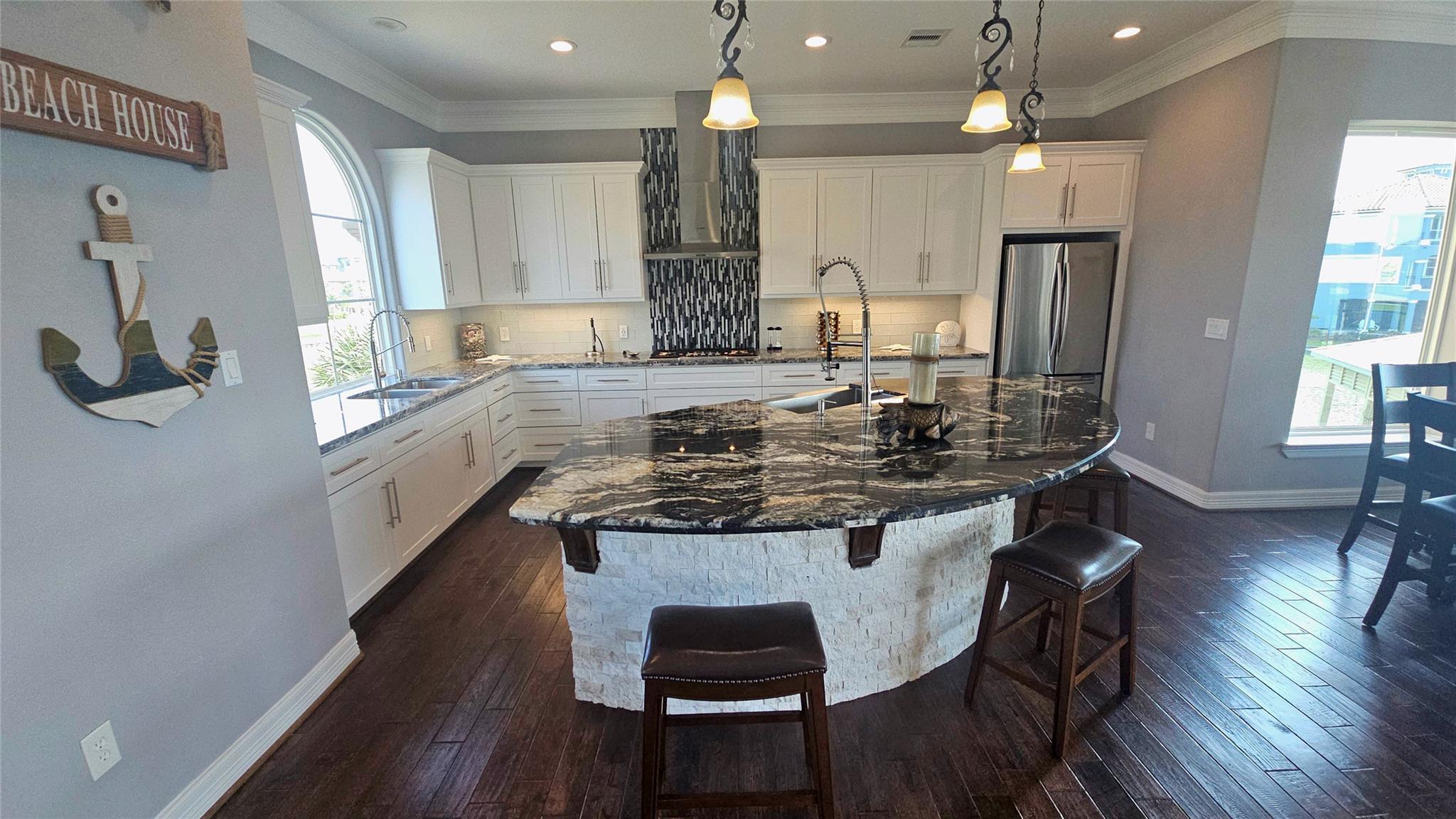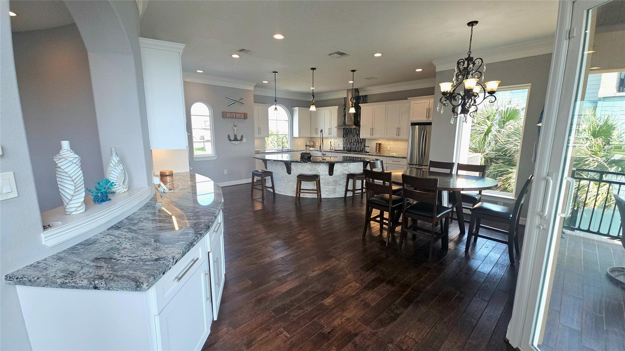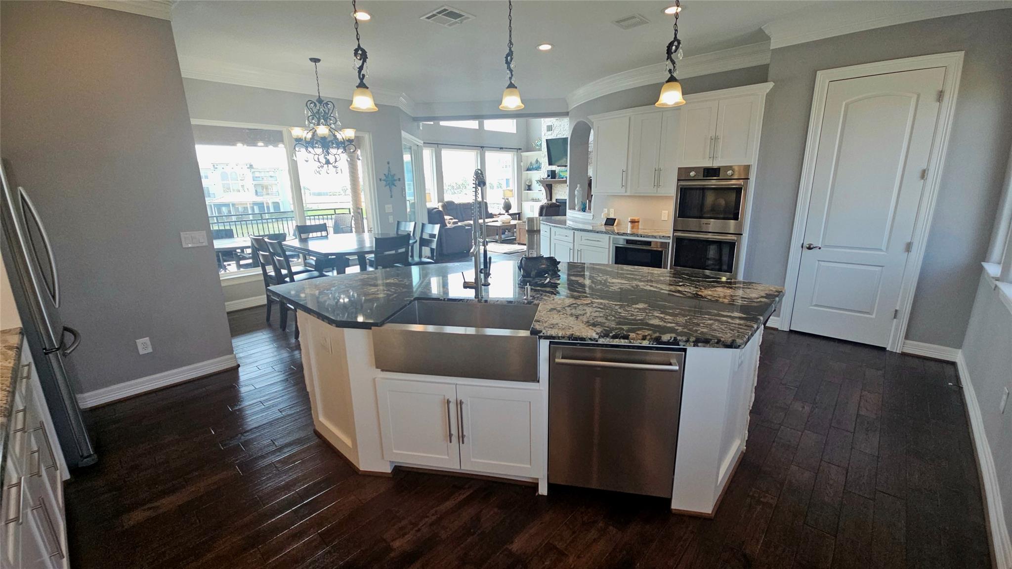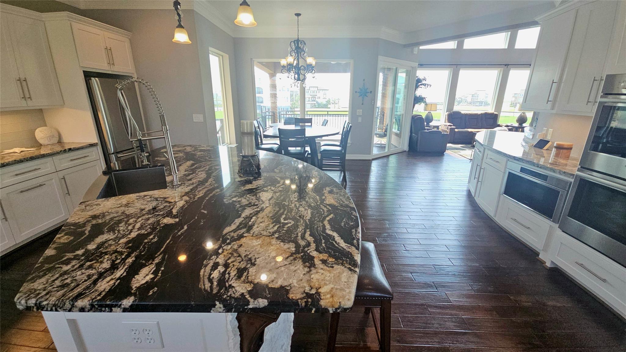 Commanding a premier position in Harborwalk, this 4-bedroom, 4.5-bathroom home offers an unparalleled blend of luxury, privacy, and coastal elegance. This striking stucco and stone home features panoramic water views. At the heart of the home lies a gourmet kitchen—complete with an oversized island, custom cabinetry, and double ovens—designed to inspire culinary creativity and effortless entertaining. Each of the four spacious bedrooms is a private suite, featuring its own full bathroom and exclusive balcony, allowing guests to savor breathtaking views and gentle coastal breezes. The primary suite is a true retreat, offering spa-inspired amenities with soaker tub, huge walk-in shower. Featuring expansive covered terraces with outdoor kitchen invite year-round enjoyment of the coastal setting with direct access to Galveston bay, great for fishing, or sunset cruises. This is more than a home—it's a lifestyle of distinction on the Texas Gulf Coast.