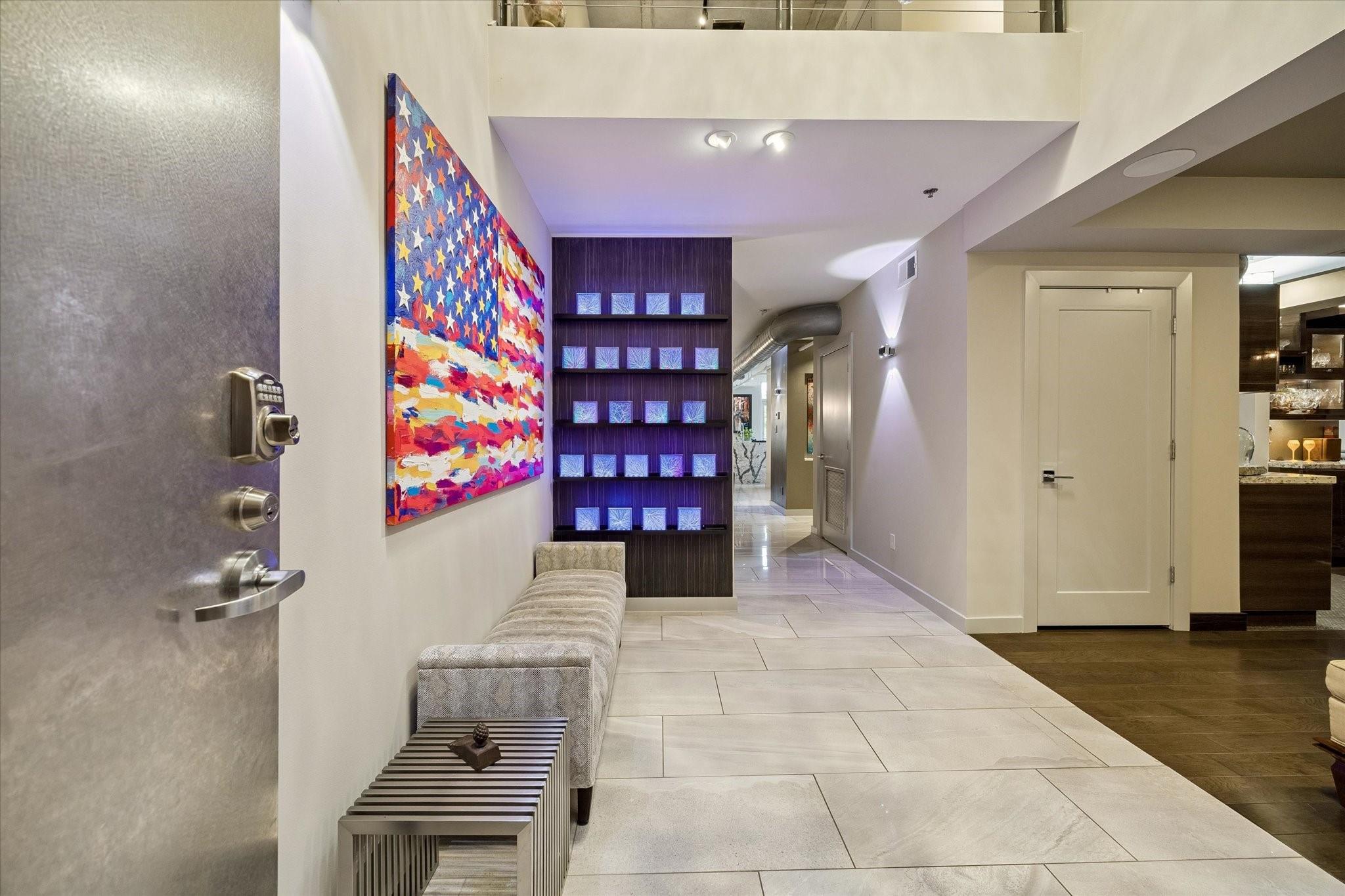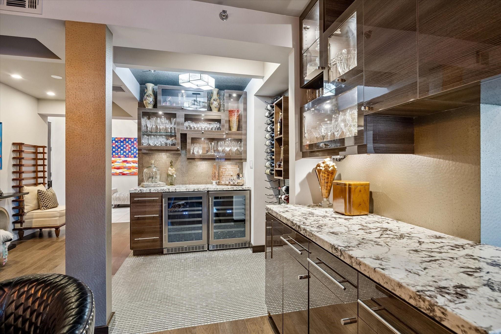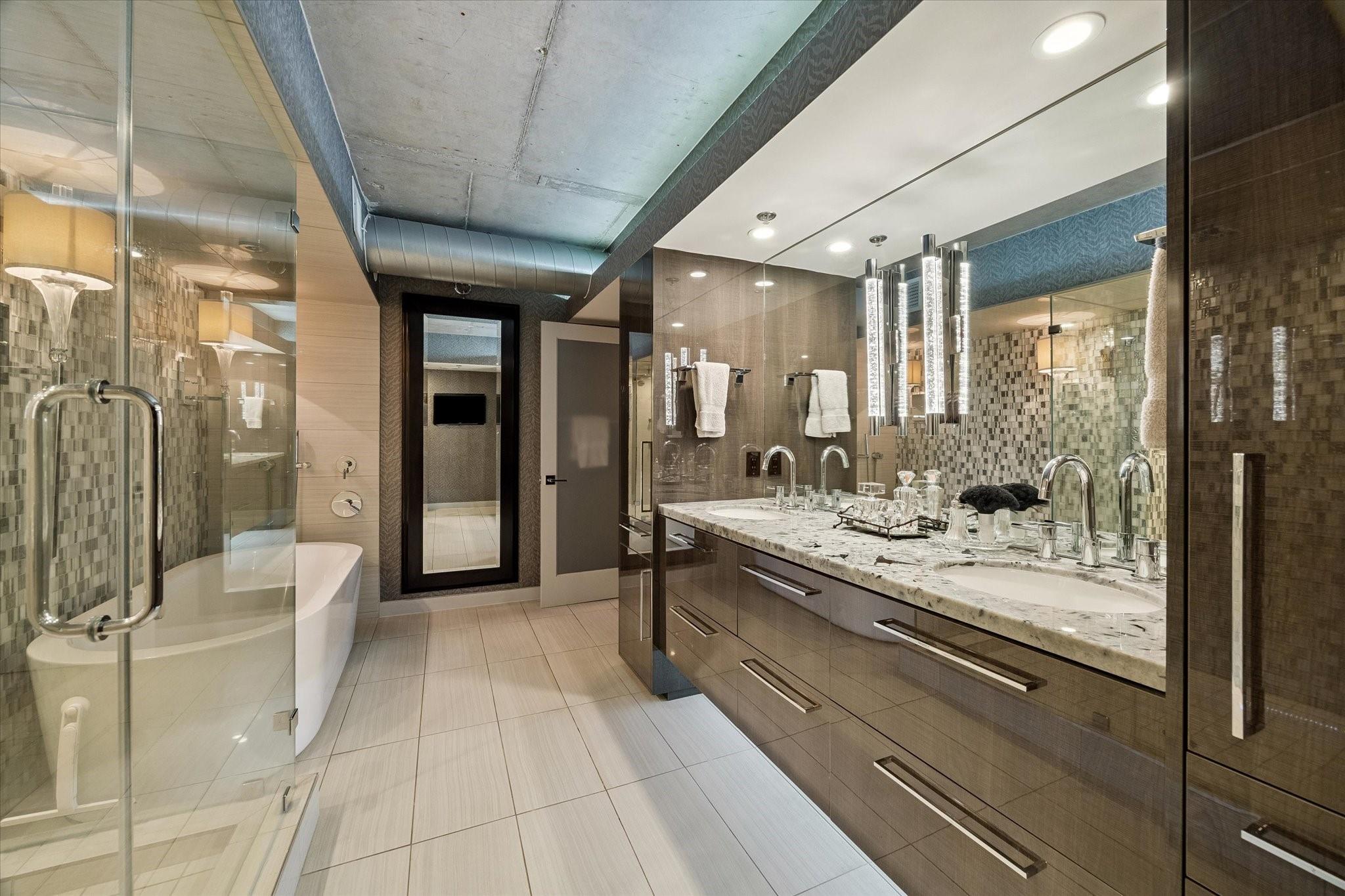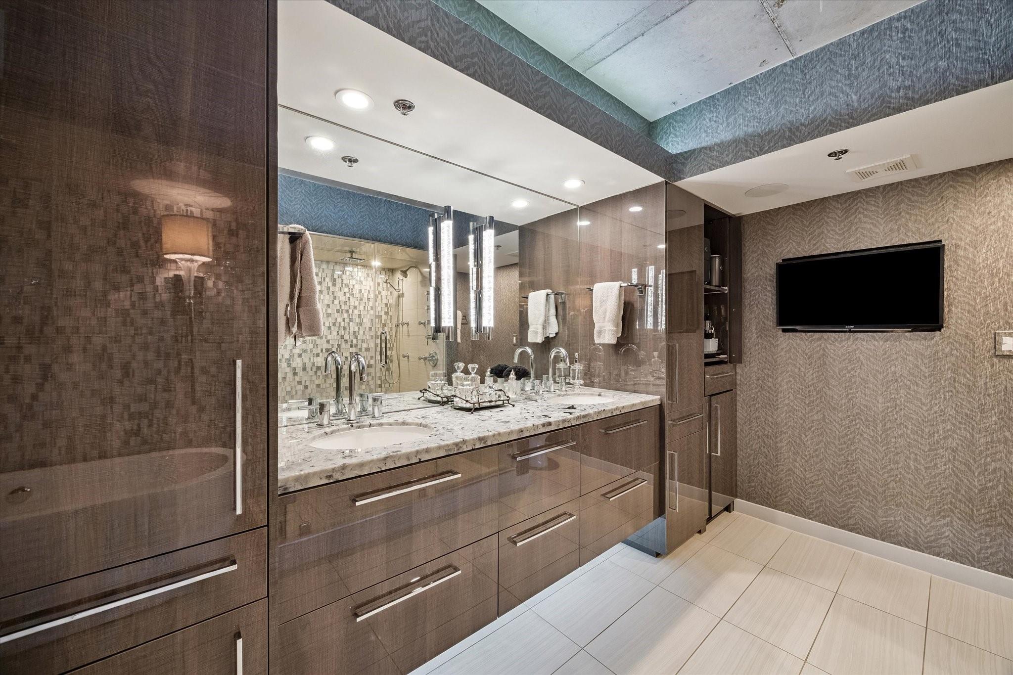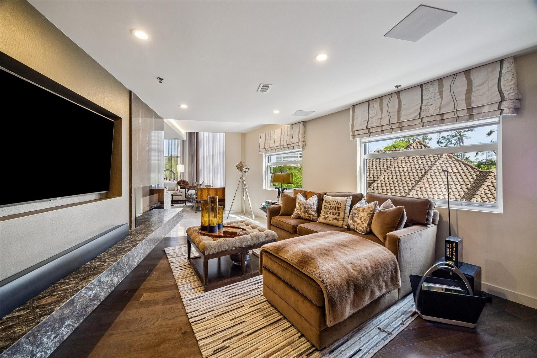 Beautifully designed residence in a prime location near Memorial Park, dining, and entertainment. Open-concept living, dining, and kitchen feature modern finishes, abundant light, and a spacious bar area, with a private balcony extending the living space outdoors. A dedicated wine room with seating offers a sophisticated entertaining space, while a separate cozy media area shares a fireplace that extends from the main living room. The main level includes a full bath. Upstairs, the primary suite features a sitting area, interior windows with motorized blackout shades, and a spa-like bath with dual vanities, walk-in shower, soaking tub, coffee bar, beverage refrigerator, and included TV. All bedrooms are en suite. Home automation controls lights, sound, televisions, motorized shades, and climate, complemented by an integrated sound system. Controlled-access building with two assigned parking spaces and a private EV charger.