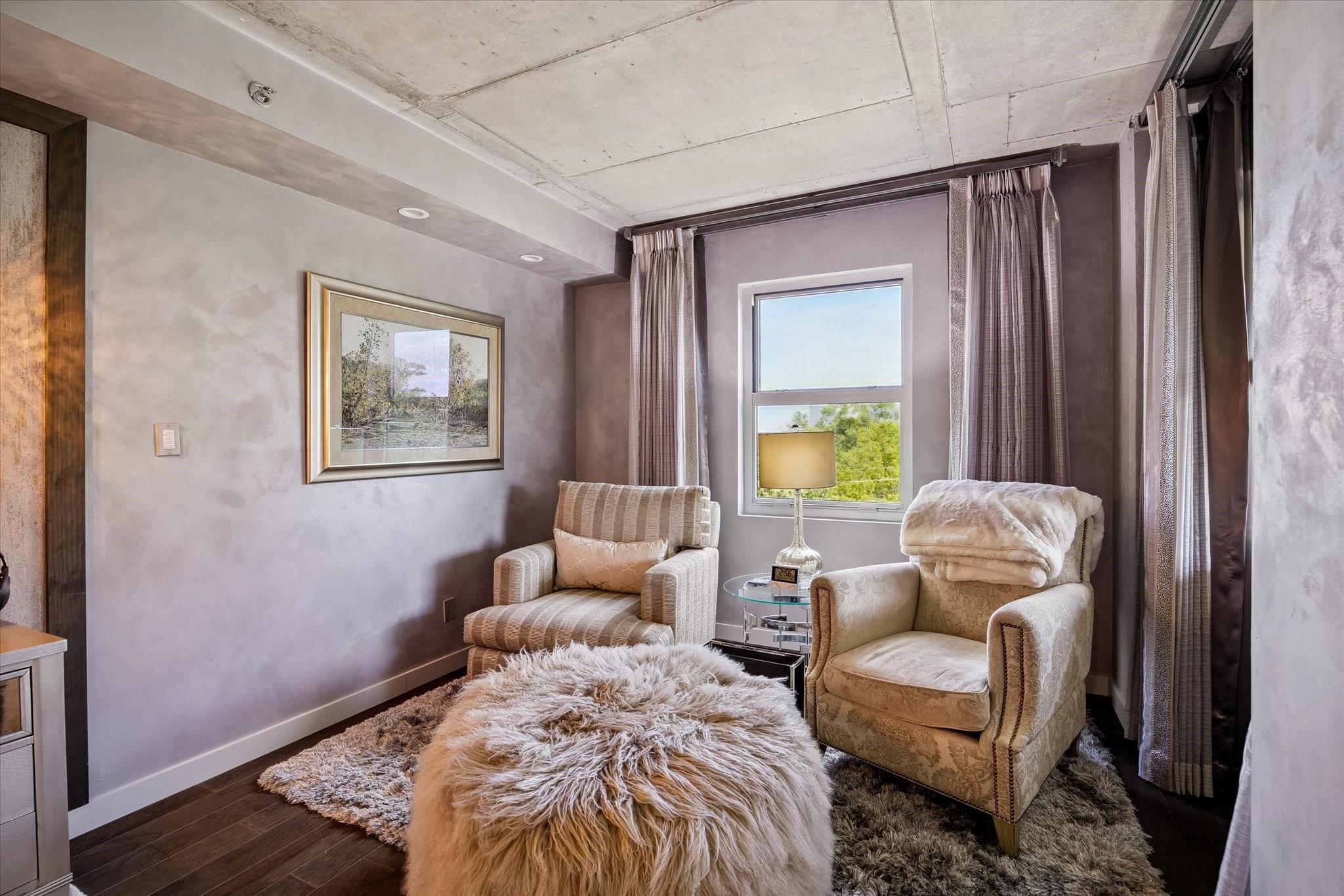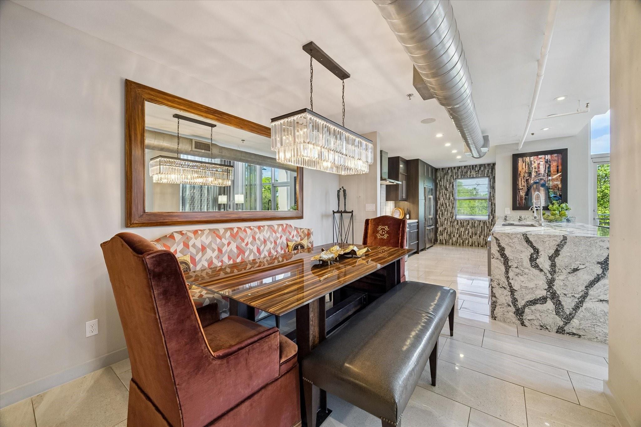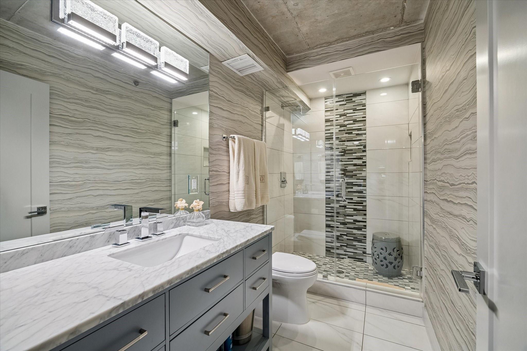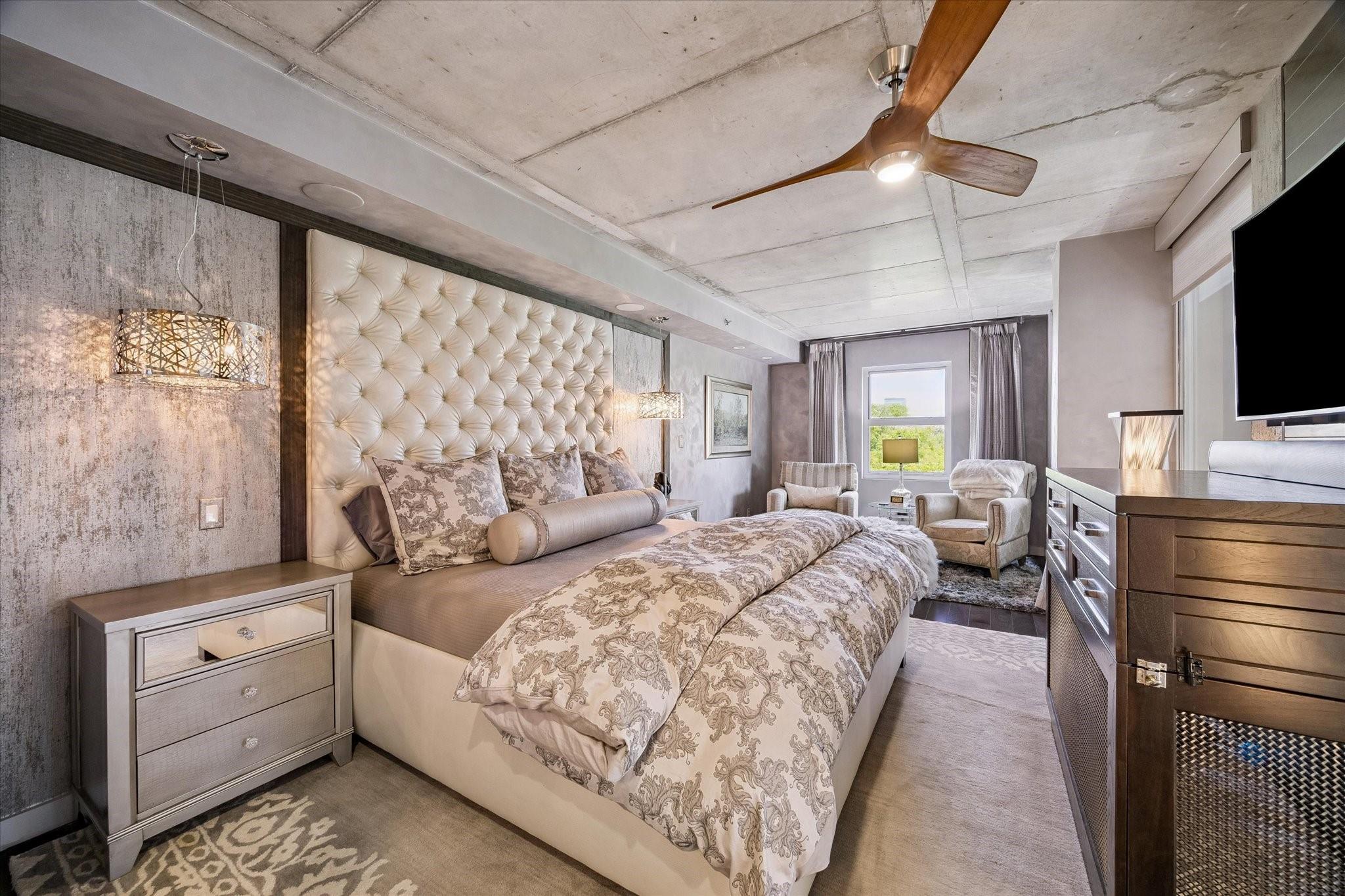 Beautifully designed residence in a prime location near Memorial Park, dining, and entertainment. Open-concept living, dining, and kitchen feature modern finishes, abundant light, and a spacious bar area, with a private balcony extending the living space outdoors. A dedicated wine room with seating offers a sophisticated entertaining space, while a separate cozy media area shares a fireplace that extends from the main living room. The main level includes a full bath. Upstairs, the primary suite features a sitting area, interior windows with motorized blackout shades, and a spa-like bath with dual vanities, walk-in shower, soaking tub, coffee bar, beverage refrigerator, and included TV. All bedrooms are en suite. Home automation controls lights, sound, televisions, motorized shades, and climate, complemented by an integrated sound system. Controlled-access building with two assigned parking spaces and a private EV charger.