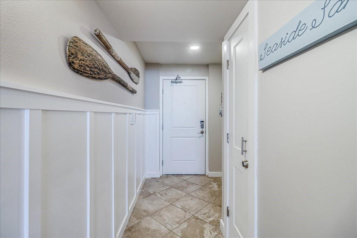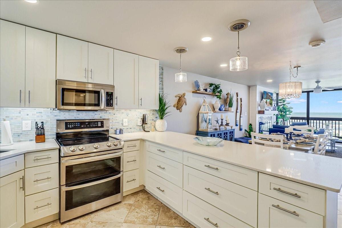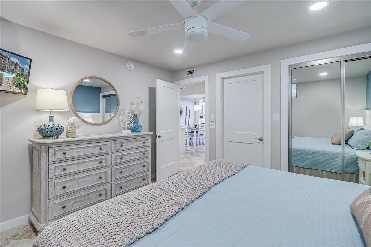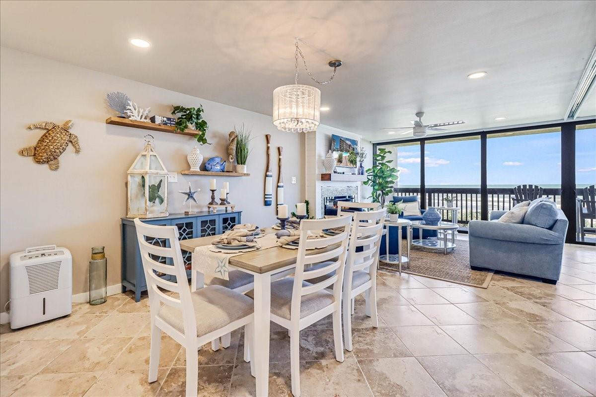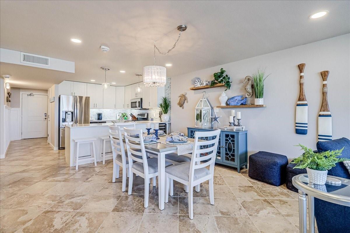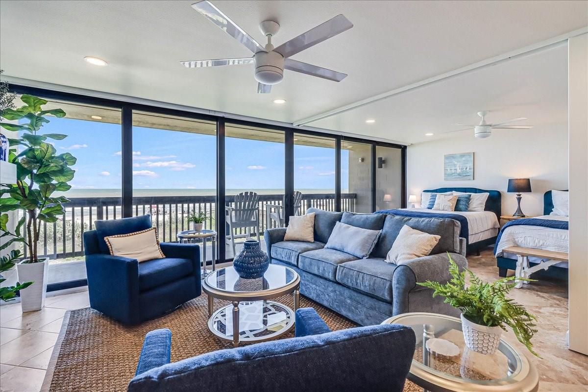 This BEACHFRONT sanctuary comes fully furnished & ready to enjoy with a color pallet chosen to create a relaxing resort-like experience. This unit is a TOP 3 RENTAL UNIT in 2024. Living room overlooks the beach through a sliding glass wall of windows. Redecorated in 2024 with new furniture, paint, lighting, and a ship lap wall with smart tv & FIREPLACE. Dining area has chandelier lighting, table for six, WINE FRIDGE & dry bar. Updated kitchen has SST double oven/cooktop range, dishwasher, full-size frig, & soft-close drawers & cabinets. Primary bedroom has a king bed, ceiling fan, smart tv, and en suite bathroom with walk-in shower. Second bedroom has two queen beds, ceiling fan, smart tv, and en suite bathroom with a double vanity & shower/bath combo. Full size w/d in utility room. Two other owners’ closets. A 150 sqft PRIVATE BALCONY offers full view of beach, surf and the Gulf of Americas.