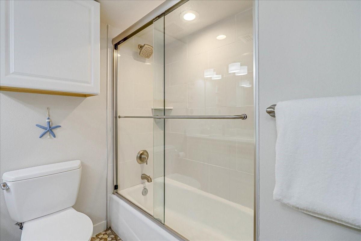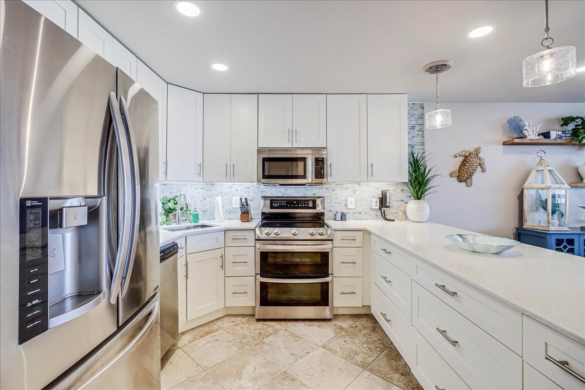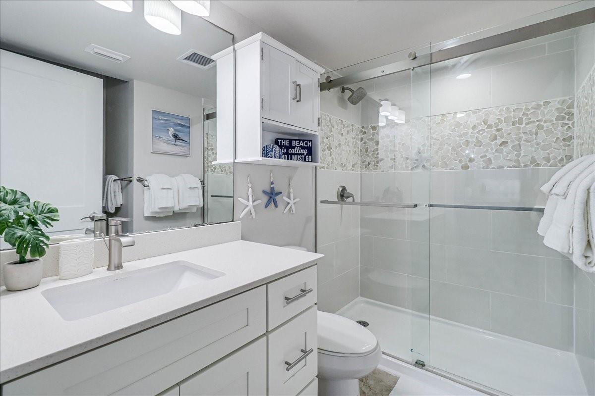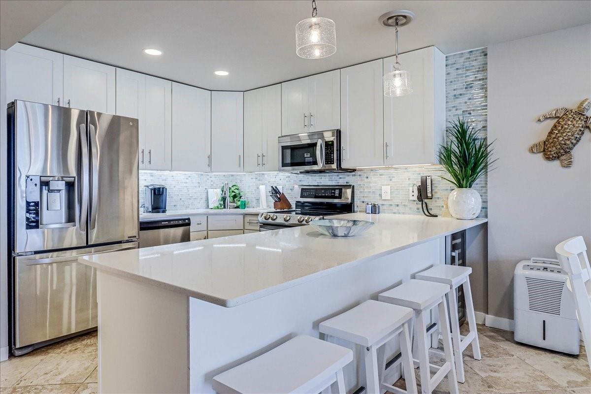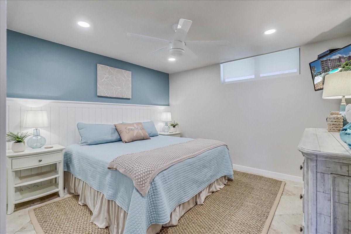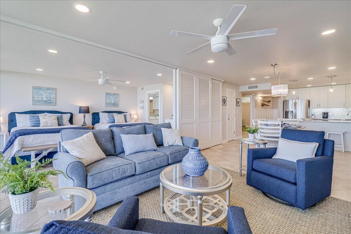 This BEACHFRONT sanctuary comes fully furnished & ready to enjoy with a color pallet chosen to create a relaxing resort-like experience. This unit is a TOP 3 RENTAL UNIT in 2024. Living room overlooks the beach through a sliding glass wall of windows. Redecorated in 2024 with new furniture, paint, lighting, and a ship lap wall with smart tv & FIREPLACE. Dining area has chandelier lighting, table for six, WINE FRIDGE & dry bar. Updated kitchen has SST double oven/cooktop range, dishwasher, full-size frig, & soft-close drawers & cabinets. Primary bedroom has a king bed, ceiling fan, smart tv, and en suite bathroom with walk-in shower. Second bedroom has two queen beds, ceiling fan, smart tv, and en suite bathroom with a double vanity & shower/bath combo. Full size w/d in utility room. Two other owners’ closets. A 150 sqft PRIVATE BALCONY offers full view of beach, surf and the Gulf of Americas.