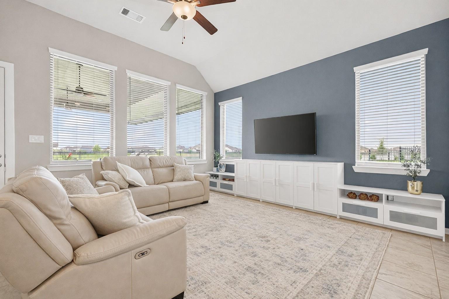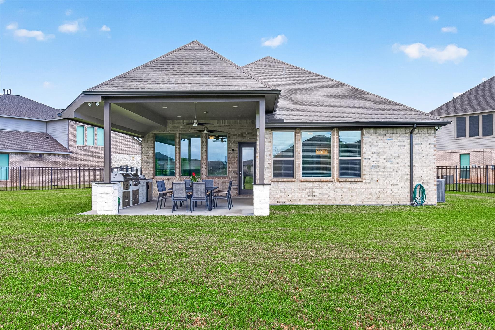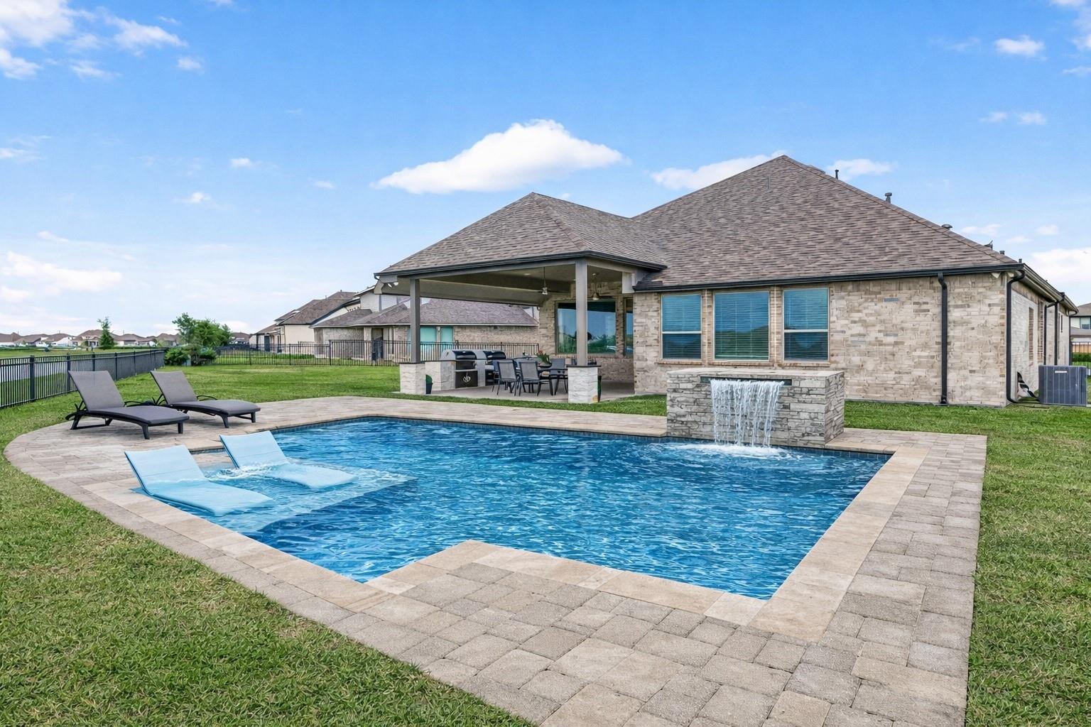 Experience elevated living where every evening ends with a sunset over the water. This upgraded one-story home sits on an oversized 16,500+ sq ft lot with breathtaking lake views, high ceilings, abundant natural light, and an open-concept design ideal for everyday living and entertaining. The family room flows into the kitchen and dining area, creating an inviting gathering space. An oversized breakfast bar seats up to eight, ideal for entertaining family and friends. The primary suite is a private retreat with double sinks, soaking tub, separate shower, and walk-in closet. A dedicated office adds flexibility for remote work or study. Step outside to a resort-style backyard with an extended 20’ x 24’ covered patio and outdoor kitchen with granite counters, built-in grill, mini fridge, storage, and dual ceiling fans, all overlooking serene lake views. Additional features include a 3-car garage, alarm system, plus resort amenities: lagoon, lazy river, pools, pickleball, parks, clubhouse.