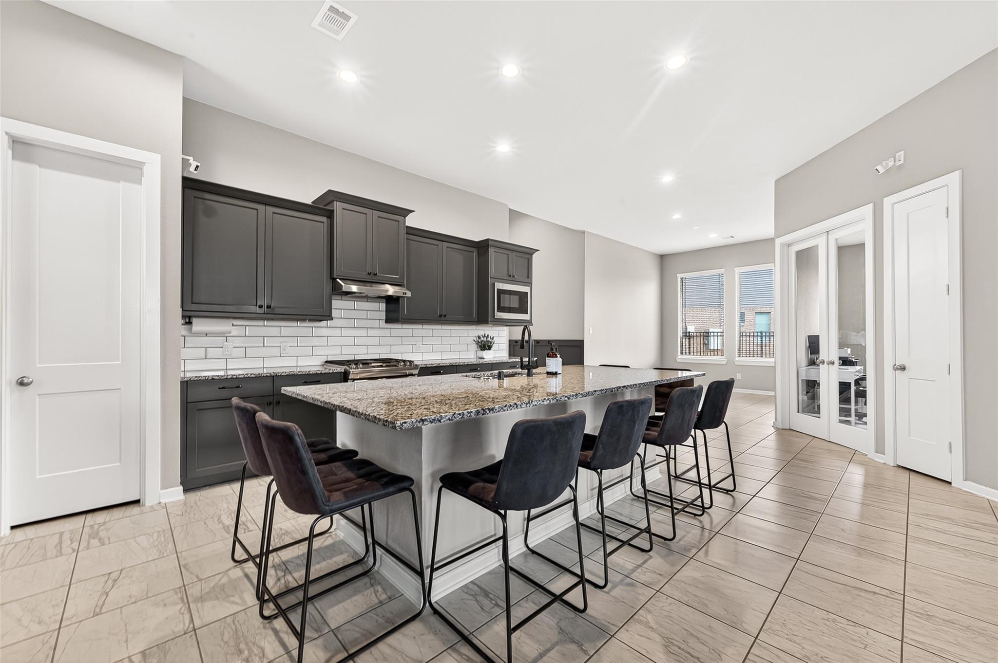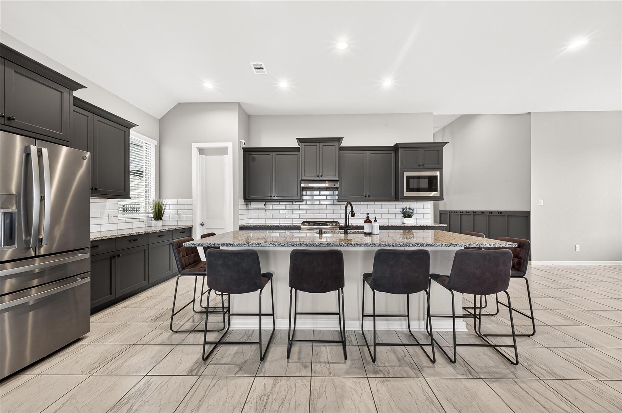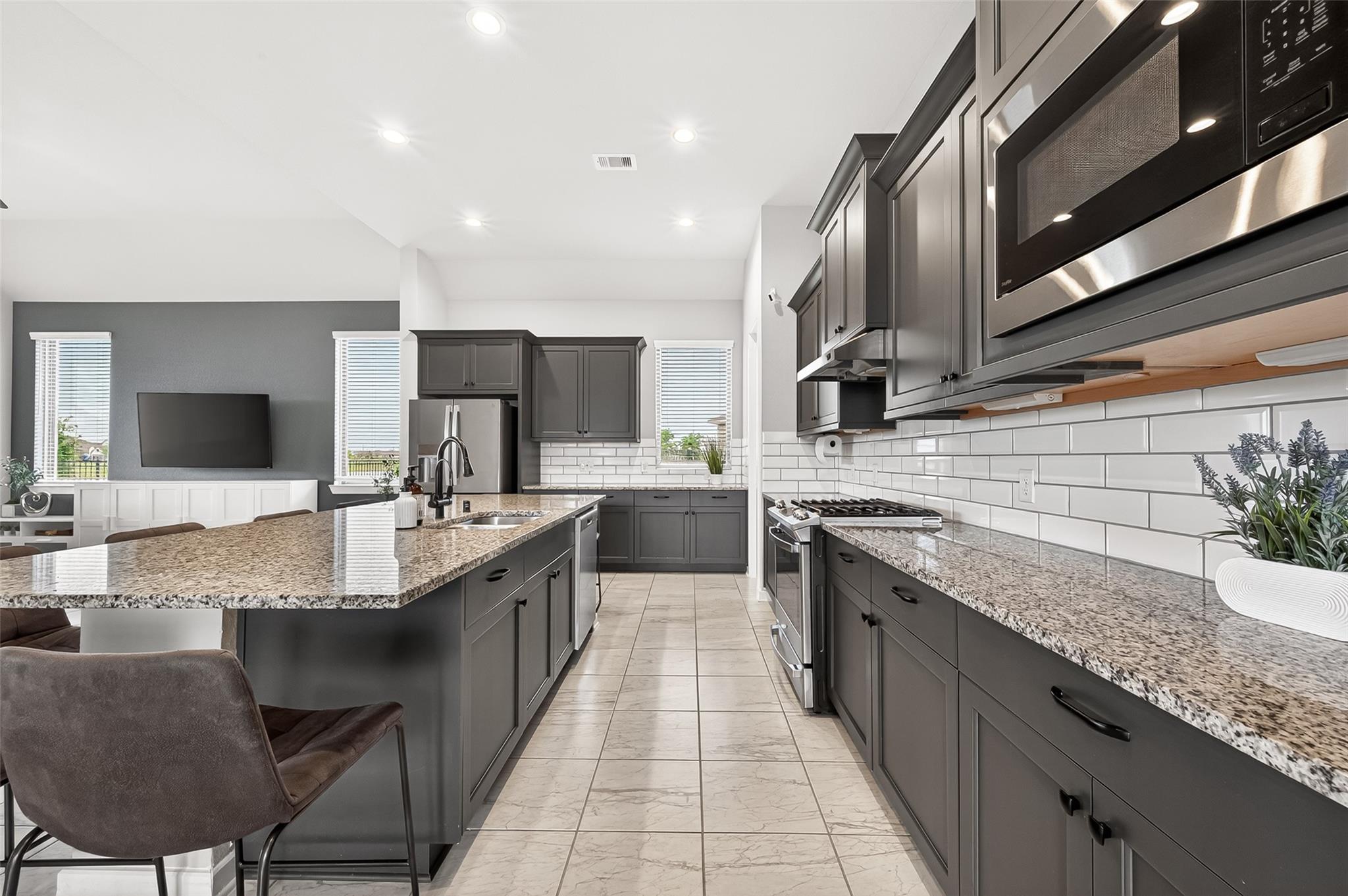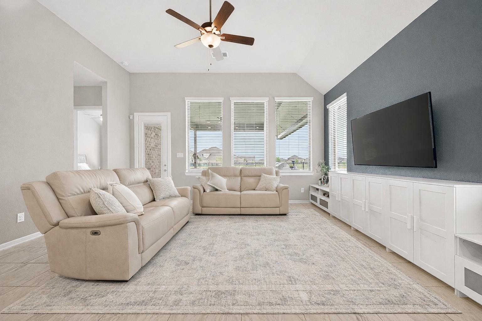 Experience elevated living where every evening ends with a sunset over the water. This upgraded one-story home sits on an oversized 16,500+ sq ft lot with breathtaking lake views, high ceilings, abundant natural light, and an open-concept design ideal for everyday living and entertaining. The family room flows into the kitchen and dining area, creating an inviting gathering space. An oversized breakfast bar seats up to eight, ideal for entertaining family and friends. The primary suite is a private retreat with double sinks, soaking tub, separate shower, and walk-in closet. A dedicated office adds flexibility for remote work or study. Step outside to a resort-style backyard with an extended 20’ x 24’ covered patio and outdoor kitchen with granite counters, built-in grill, mini fridge, storage, and dual ceiling fans, all overlooking serene lake views. Additional features include a 3-car garage, alarm system, plus resort amenities: lagoon, lazy river, pools, pickleball, parks, clubhouse.