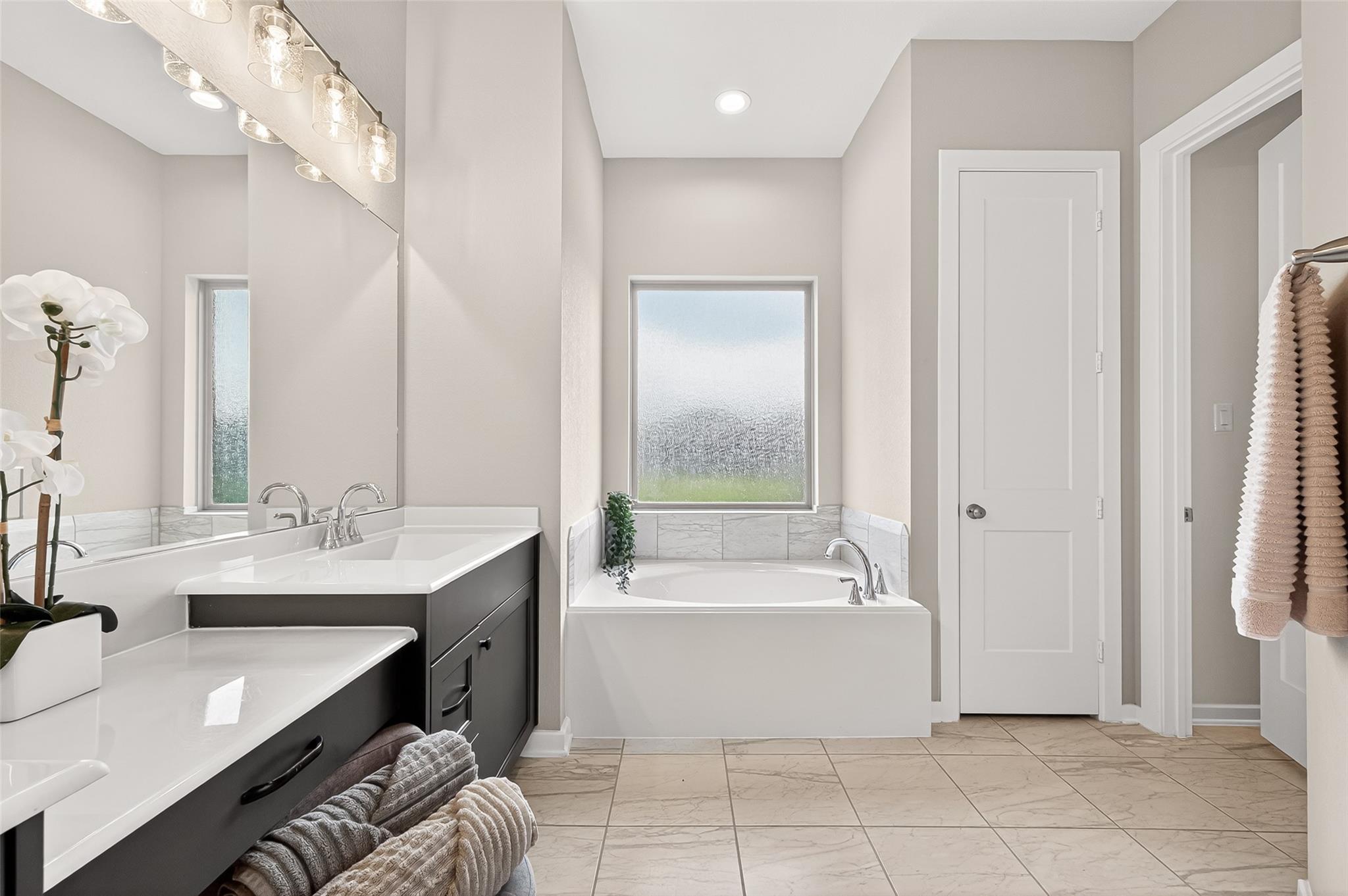 InteriorFloors:TileBathroom Description:Full Secondary Bathroom Down,Primary Bath: Double Sinks,Primary Bath: Separate Shower,Primary Bath: Soaking Tub,Secondary Bath(s): Tub/Shower ComboBedroom Desc:All Bedrooms Down,Walk-In ClosetKitchen Desc:Breakfast Bar,Kitchen open to Family Room,Walk-in PantryRoom Description:1 Living Area,Breakfast Room,Entry,Home Office/StudyHeating:Central GasCooling:Central ElectricConnections:Washer ConnectionsDishwasher:YesDisposal:YesCompactor:NoMicrowave:YesRange:Gas CooktopOven:Gas OvenInterior:Alarm System - Leased,Water Softener - Owned
