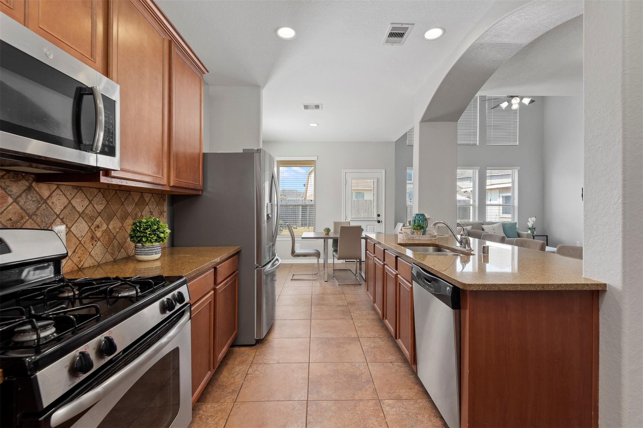 InteriorFloors:Carpet,Engineered Wood,TileCountertop:GraniteBathroom Description:Half Bath,Primary Bath: Double Sinks,Primary Bath: Separate Shower,Primary Bath: Soaking Tub,Secondary Bath(s): Tub/Shower ComboBedroom Desc:En-Suite Bath,Primary Bed - 1st Floor,Walk-In ClosetKitchen Desc:Breakfast Bar,Kitchen open to Family Room,PantryRoom Description:1 Living Area,Breakfast Room,Den,Entry,Formal Dining,Gameroom Up,Home Office/Study,Living Area - 1st Floor,Utility Room in HouseHeating:Central ElectricCooling:Central ElectricConnections:Electric Dryer Connections,Washer ConnectionsDishwasher:YesDisposal:YesCompactor:NoMicrowave:YesRange:Gas RangeOven:Gas OvenIce Maker:NoEnergy Feature:Attic Vents,Ceiling Fans,Digital Program ThermostatInterior:Alarm System - Leased