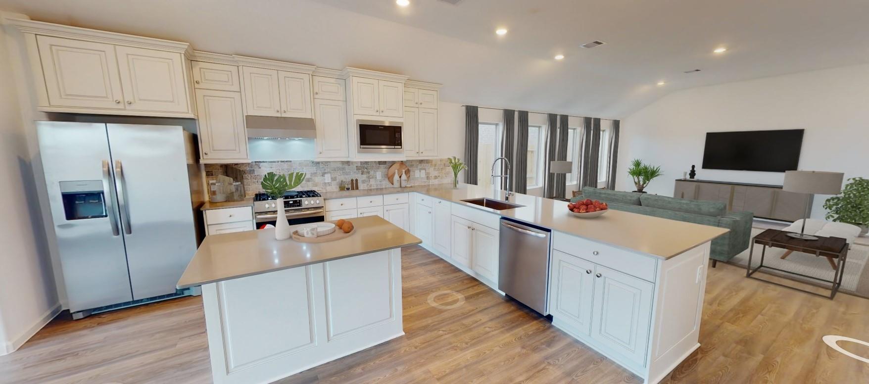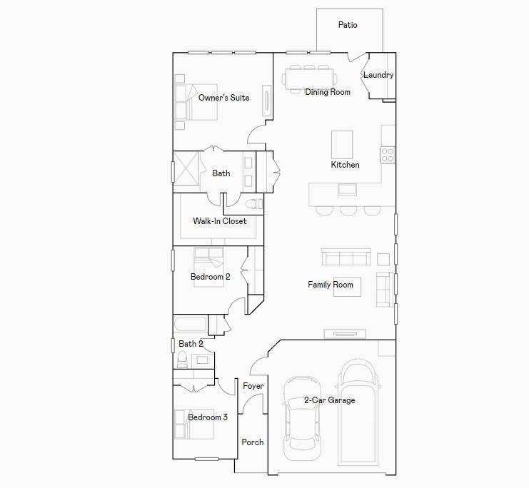 Village Builders Bristol Collection, "Beckham" in Magnolia Forest! Elevation "A"! This single-story home has everything growing families need with three bedrooms in total and an open concept living area. Two bedrooms share a hall bathroom at the front of the home, while down the hall is the family room, kitchen and dining room with access to the back porch. Tucked into the back corner is the owner’s suite, which has a private bathroom and walk-in closet. Prices, dimensions and features may vary and are subject to change. Photos are for illustrative purposes only.