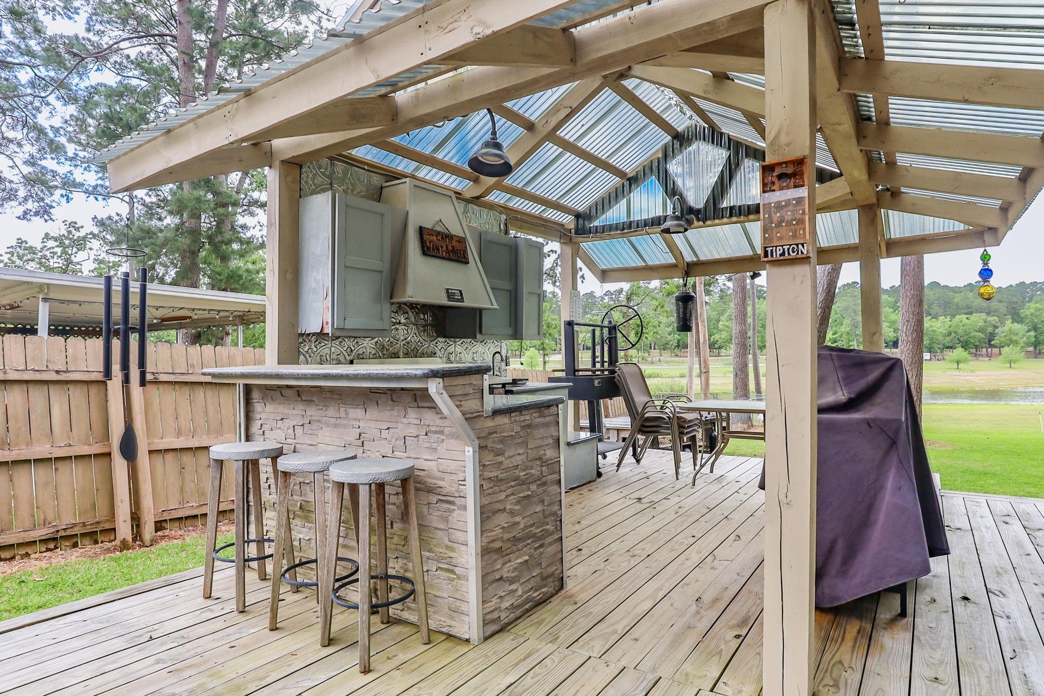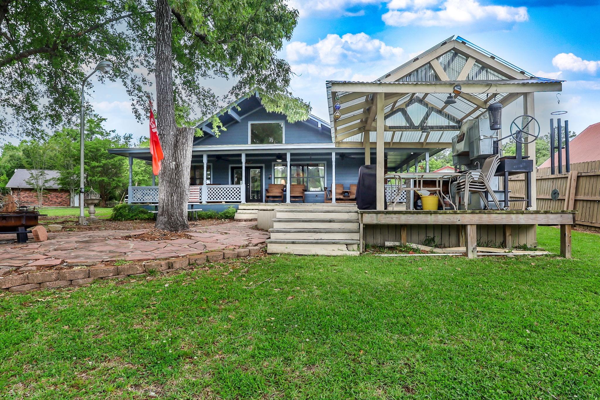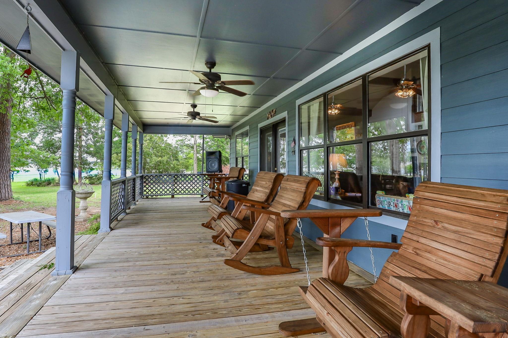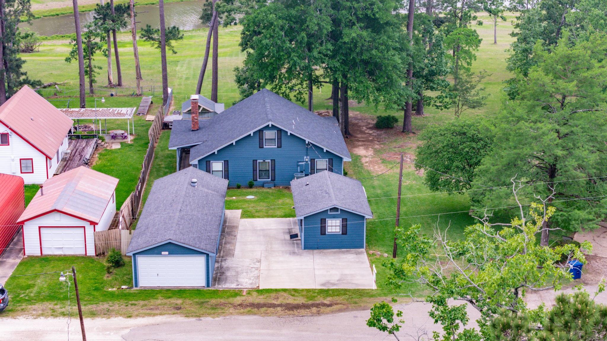 LAKEFRONT property on the shores of Lake Sam Rayburn. Stunning sunrise & sunsets! Versatile use as a weekend getaway, full-time residence, or income-producing investment. The main living area features soaring ceilings & open layout. A private guest house with full bathroom and wall Air Conditioner adds flexibility for visitors or potential rental income! Expansive Lake views from the large deck, complete with an outdoor kitchen and bar—ideal for gatherings by the water. Conveniently located around the corner from San Augustine Park, offering easy access for boat launching. This home is a must see. Check out the video! Start making memories! Removable dock stays with property & No HOA The Main home is 2,080 sq ft & Guest house is 368 sq feet... Total of 2,448 sq feet FULLY FURNISHED - Move In Ready & for a peace of mind it comes with a Generac Generator. Excluded in the sale: Outside wood patio furniture & bbq pit & Half table w/ Lamb on it & Small refrigerator in garage